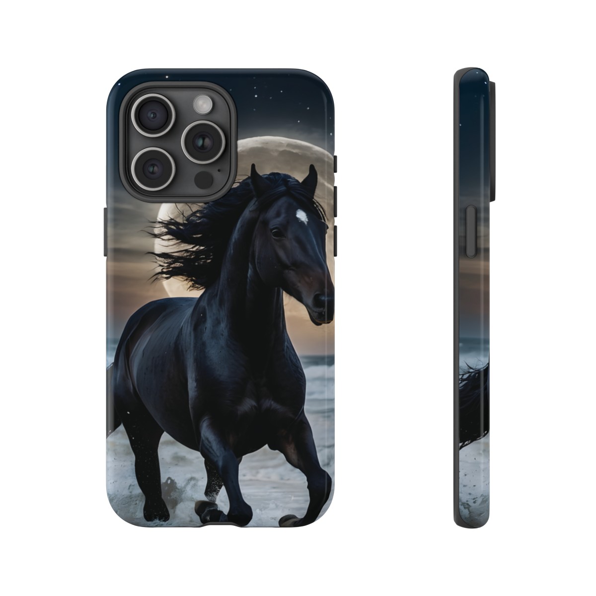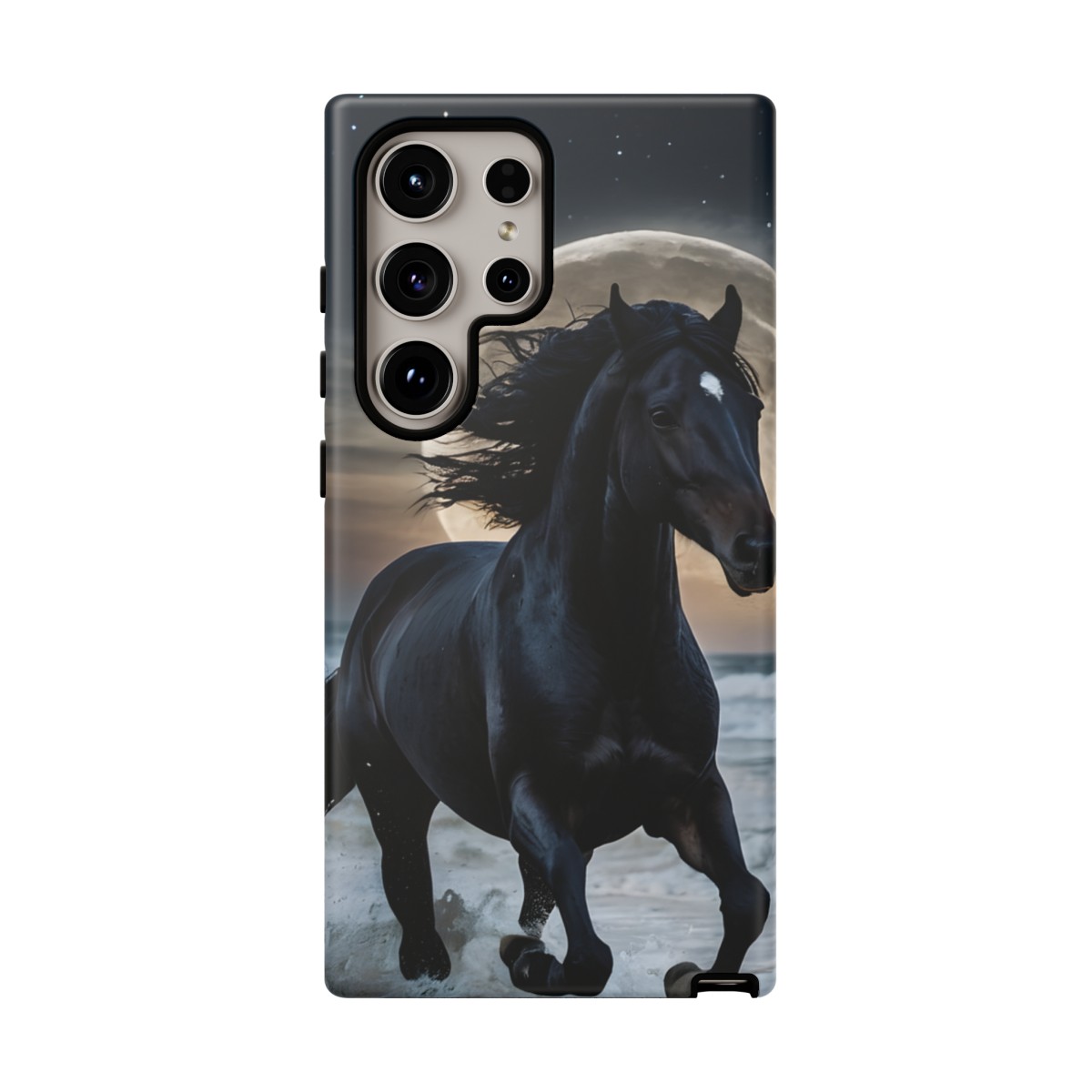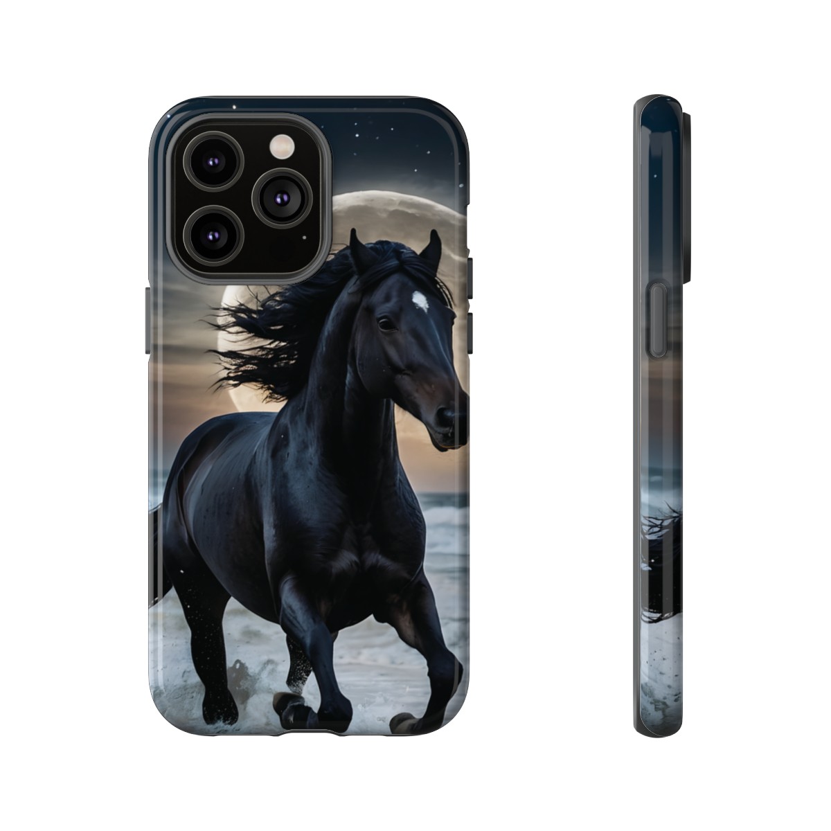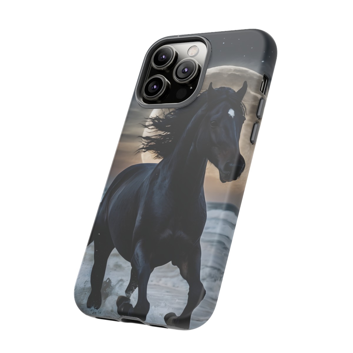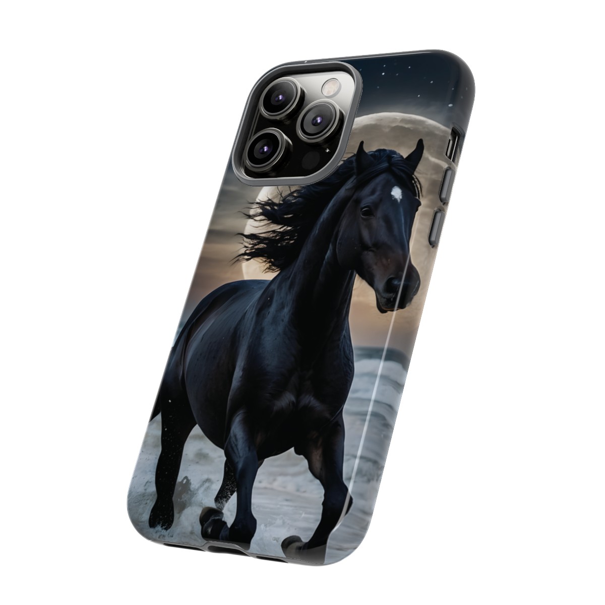 Bold and Beautiful Design: Experience the elegance of the night with our Majestic Midnight Stallion Phone Case. This exquisite piece boasts a stunning, lifelike portrayal of a powerful stallion in motion, set against the tranquil backdrop of a moonlit shore.