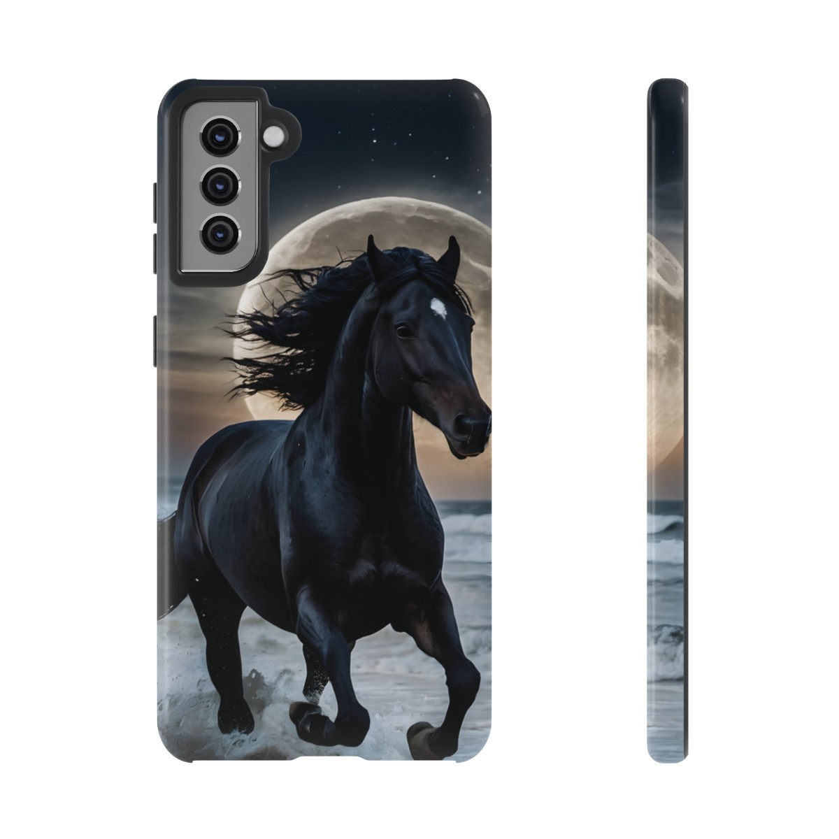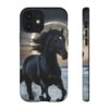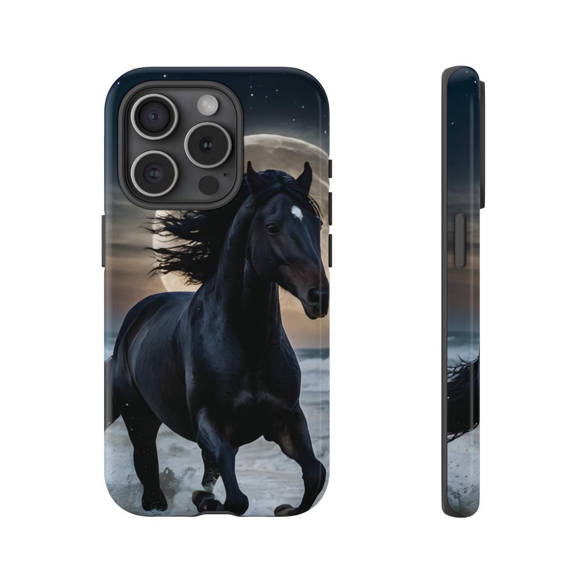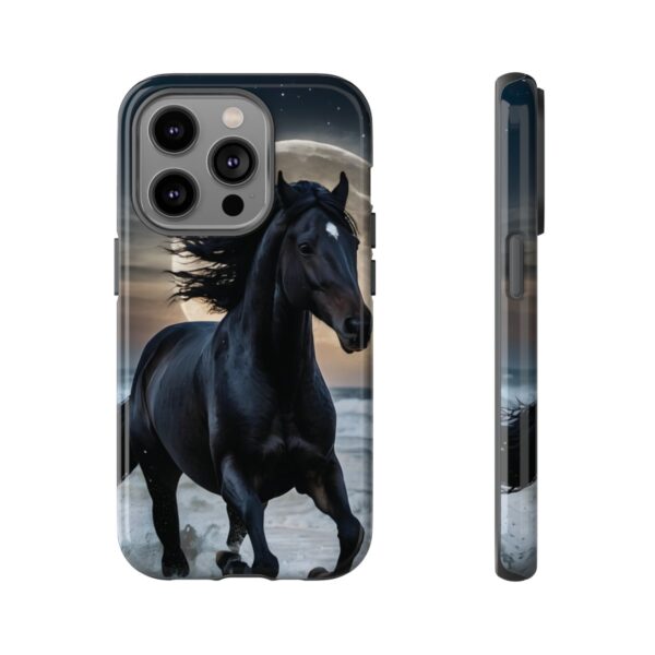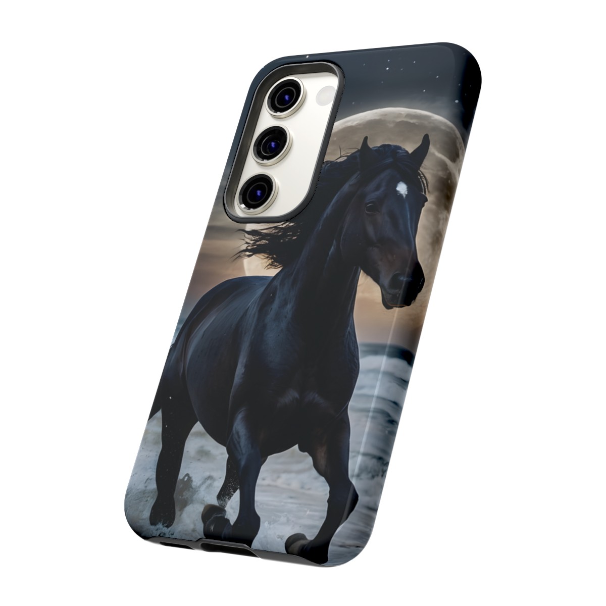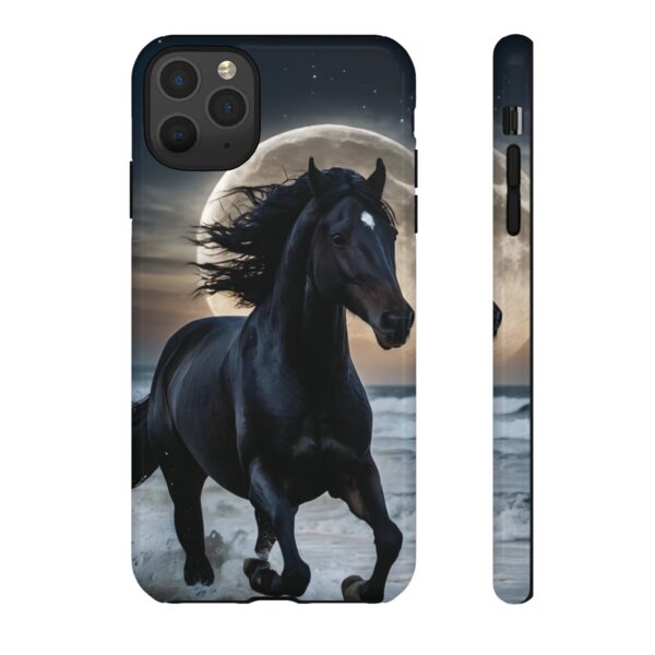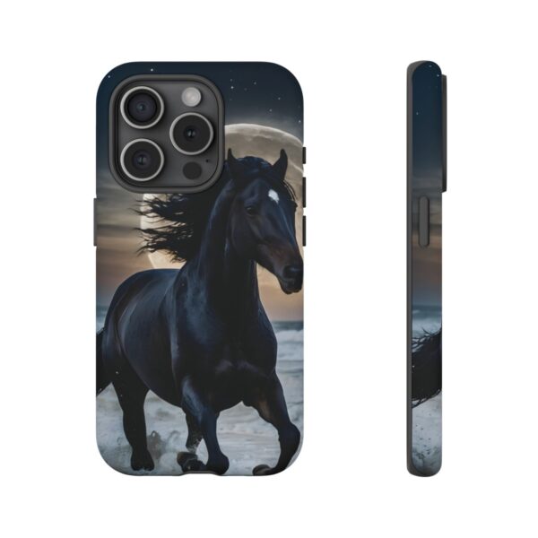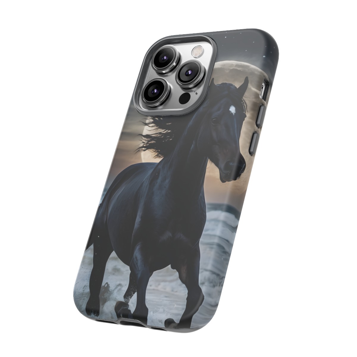 Bold and Beautiful Design: Experience the elegance of the night with our Majestic Midnight Stallion Phone Case. This exquisite piece boasts a stunning, lifelike portrayal of a powerful stallion in motion, set against the tranquil backdrop of a moonlit shore.