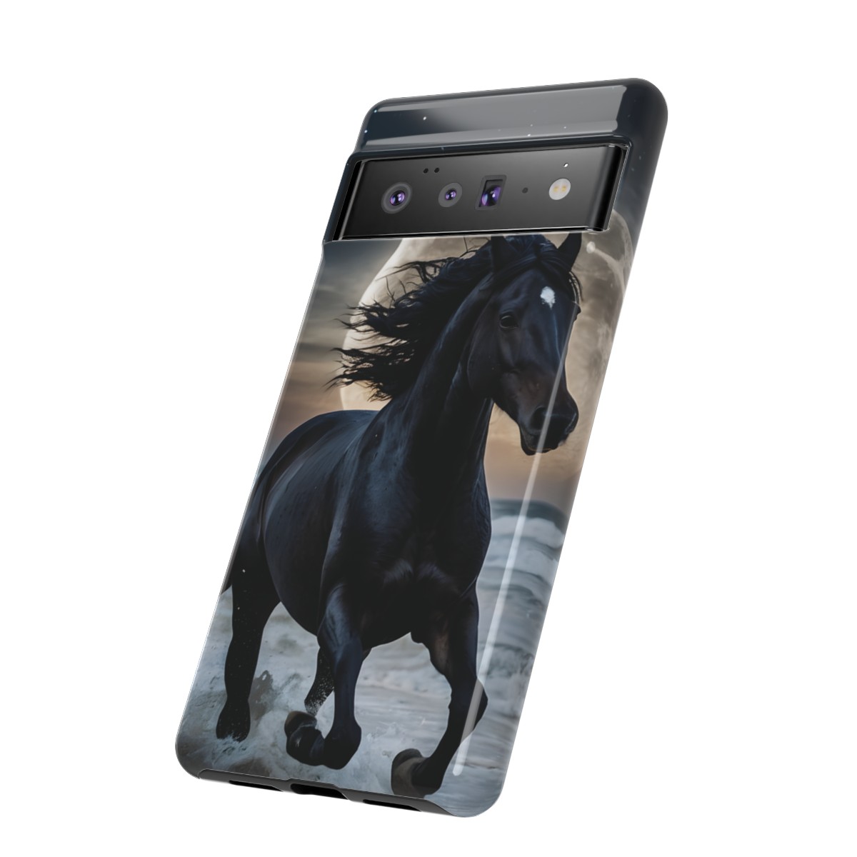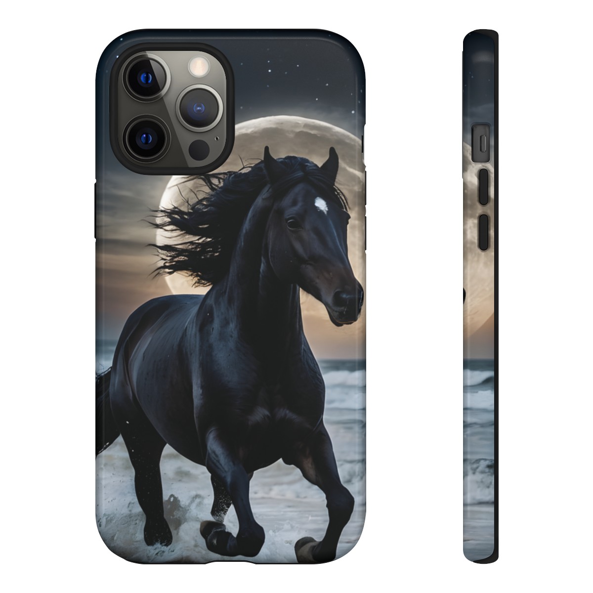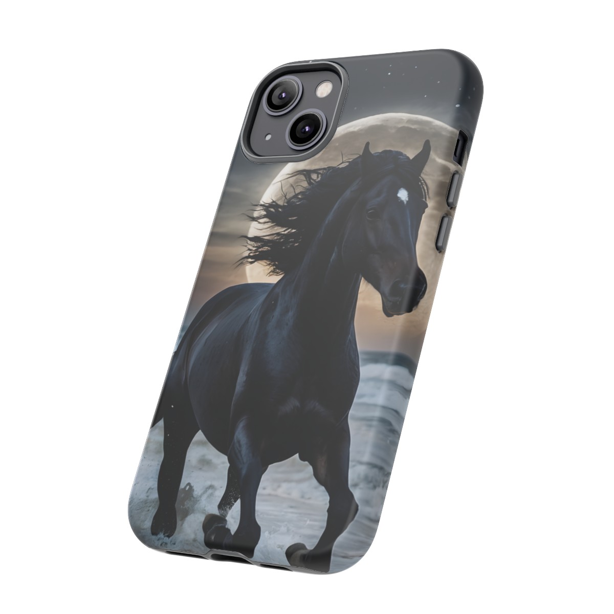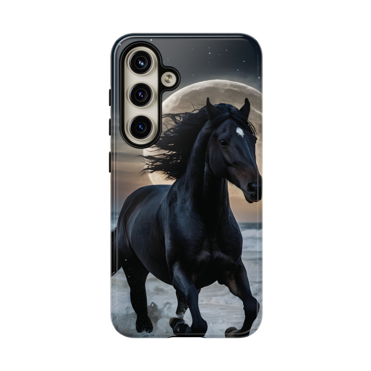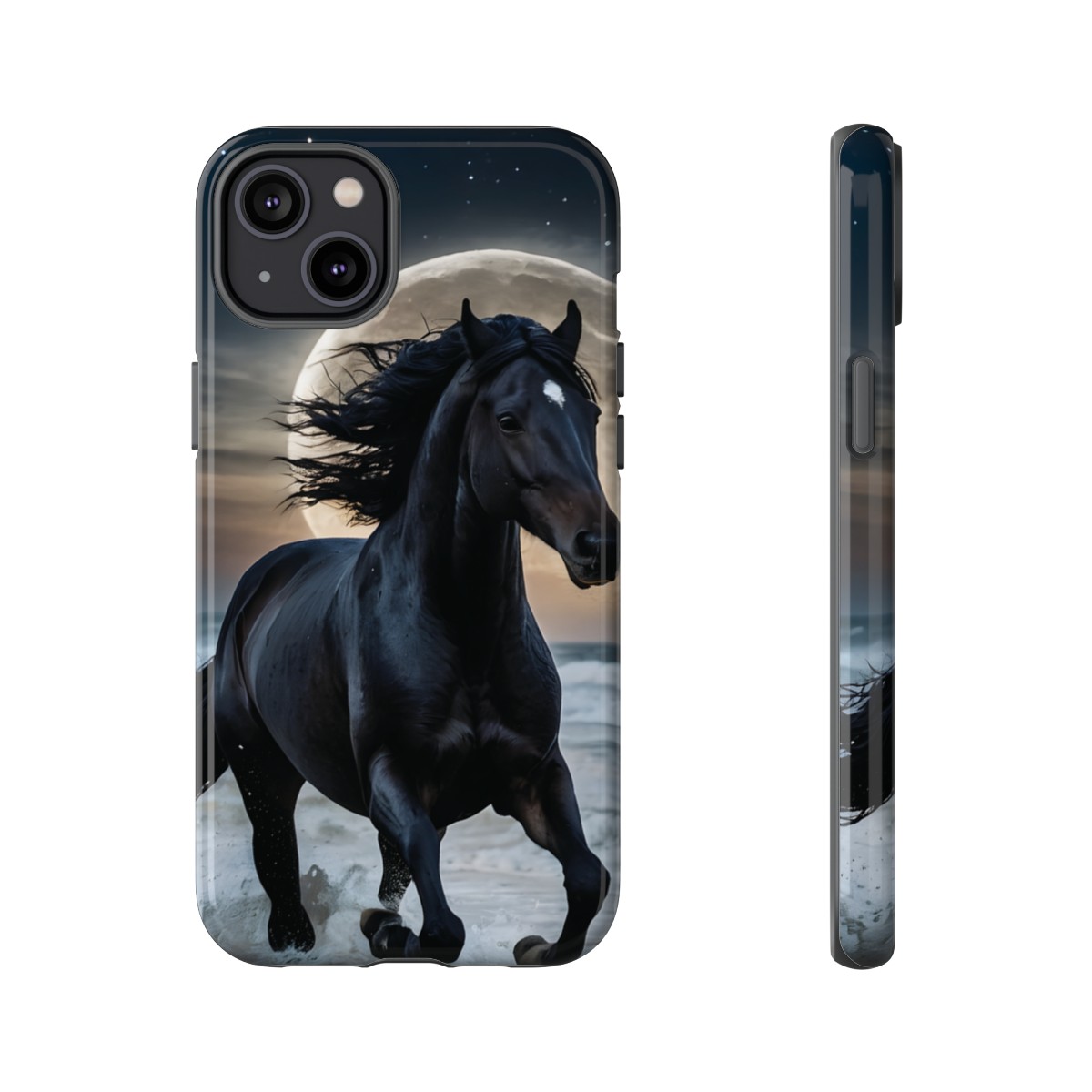 Bold and Beautiful Design: Experience the elegance of the night with our Majestic Midnight Stallion Phone Case. This exquisite piece boasts a stunning, lifelike portrayal of a powerful stallion in motion, set against the tranquil backdrop of a moonlit shore.