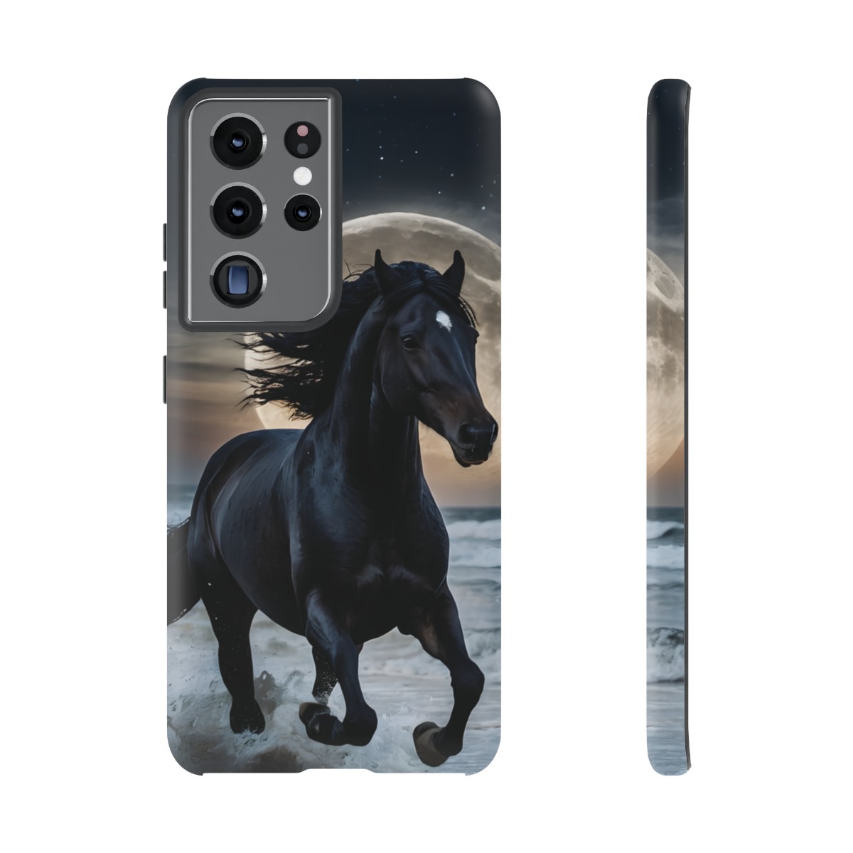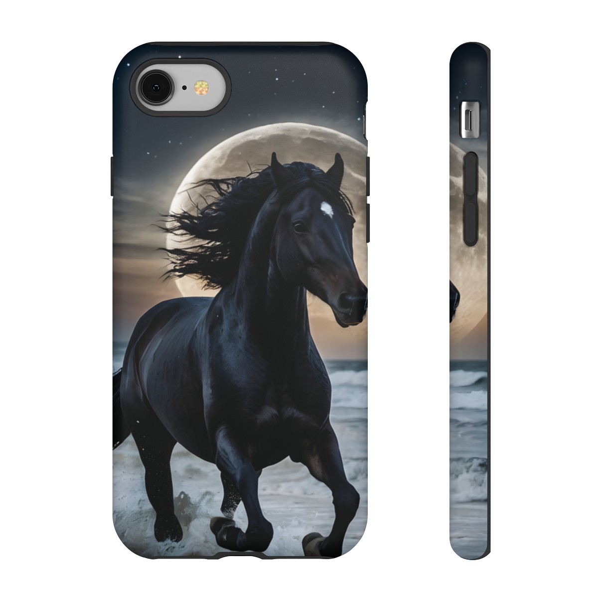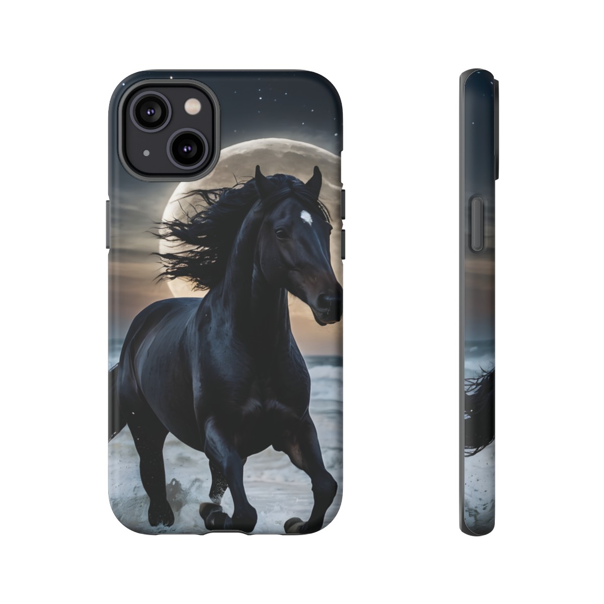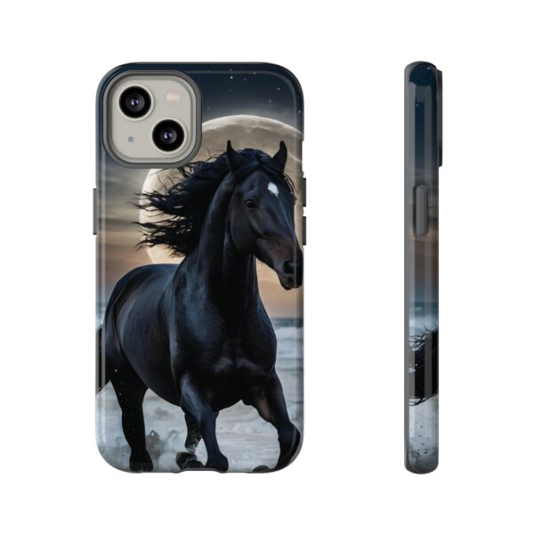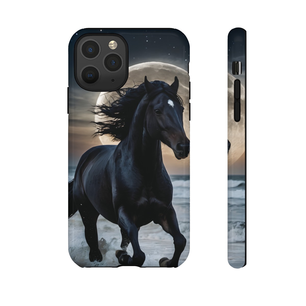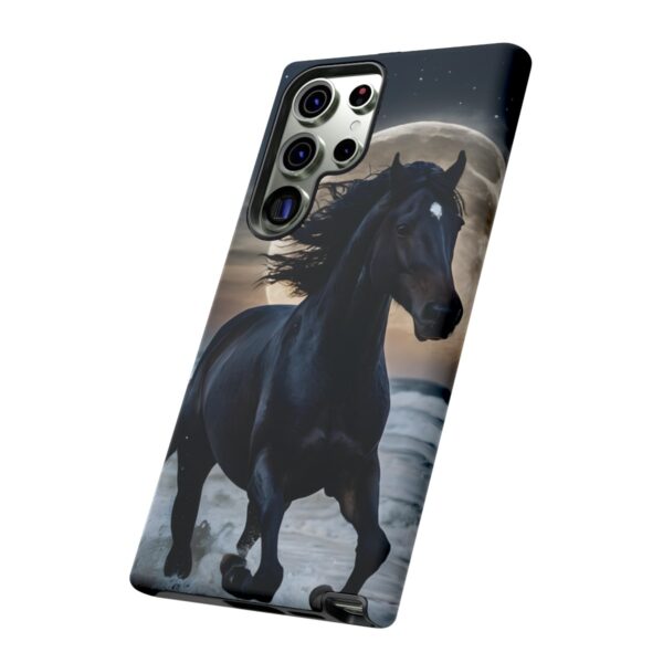 Bold and Beautiful Design: Experience the elegance of the night with our Majestic Midnight Stallion Phone Case. This exquisite piece boasts a stunning, lifelike portrayal of a powerful stallion in motion, set against the tranquil backdrop of a moonlit shore.