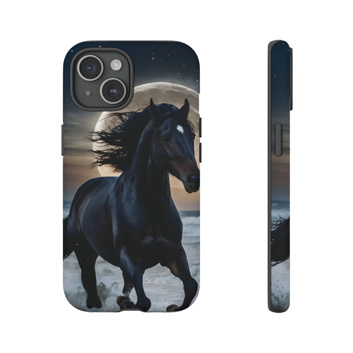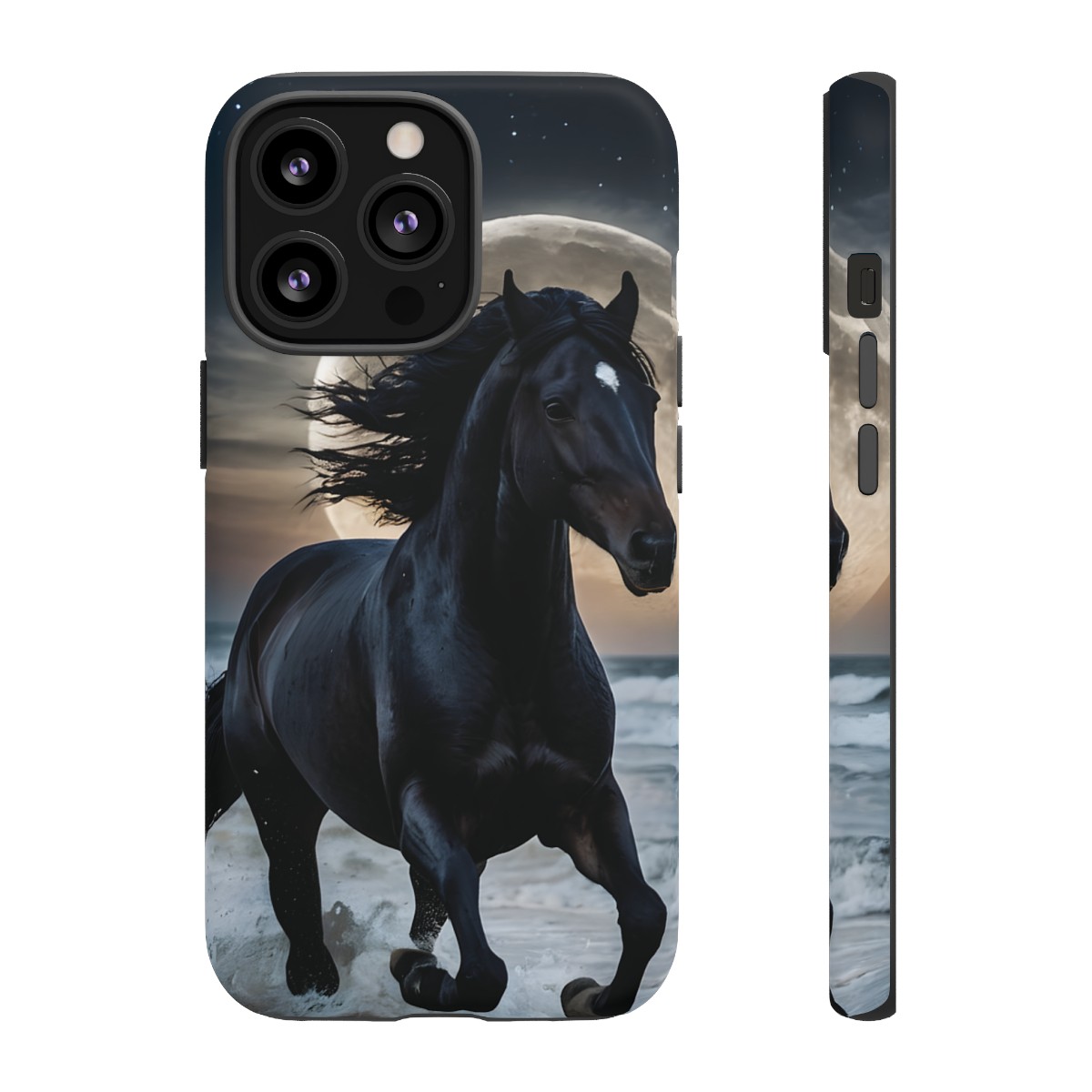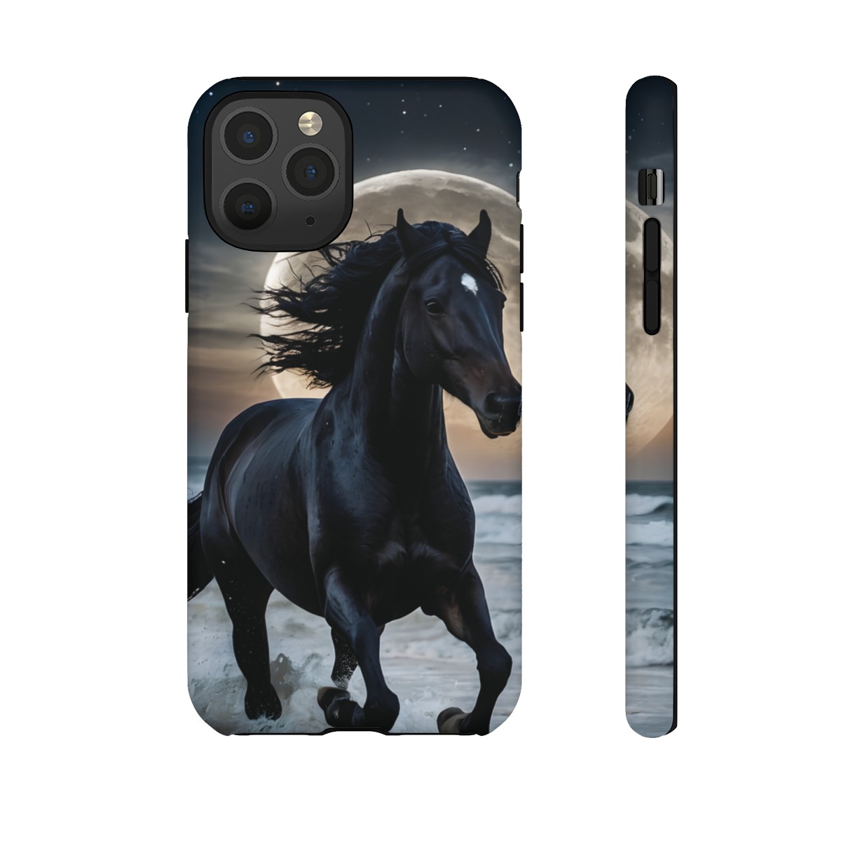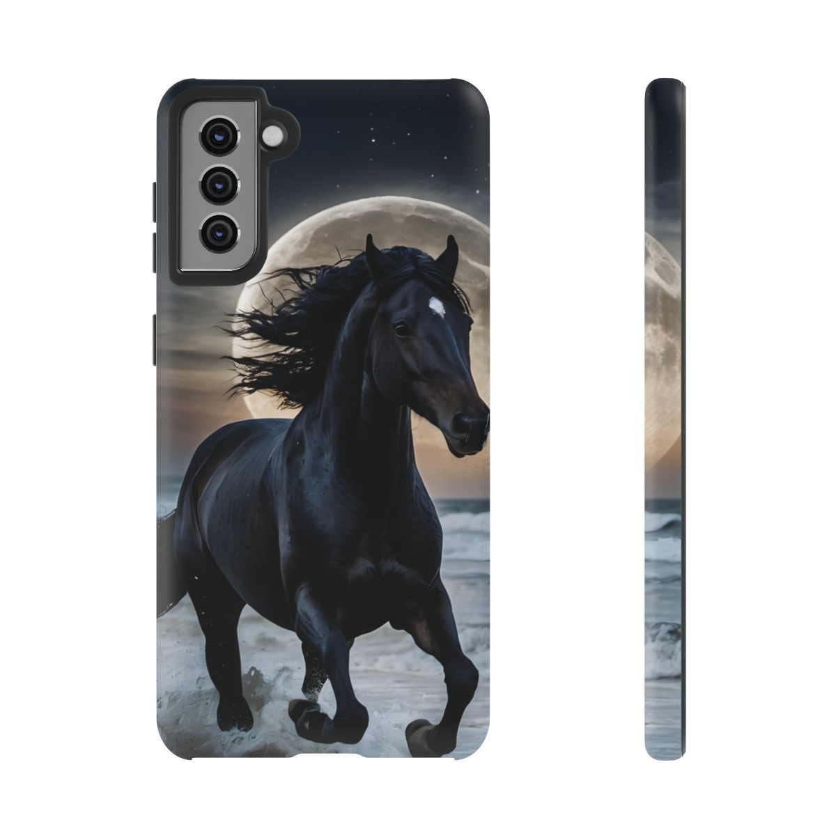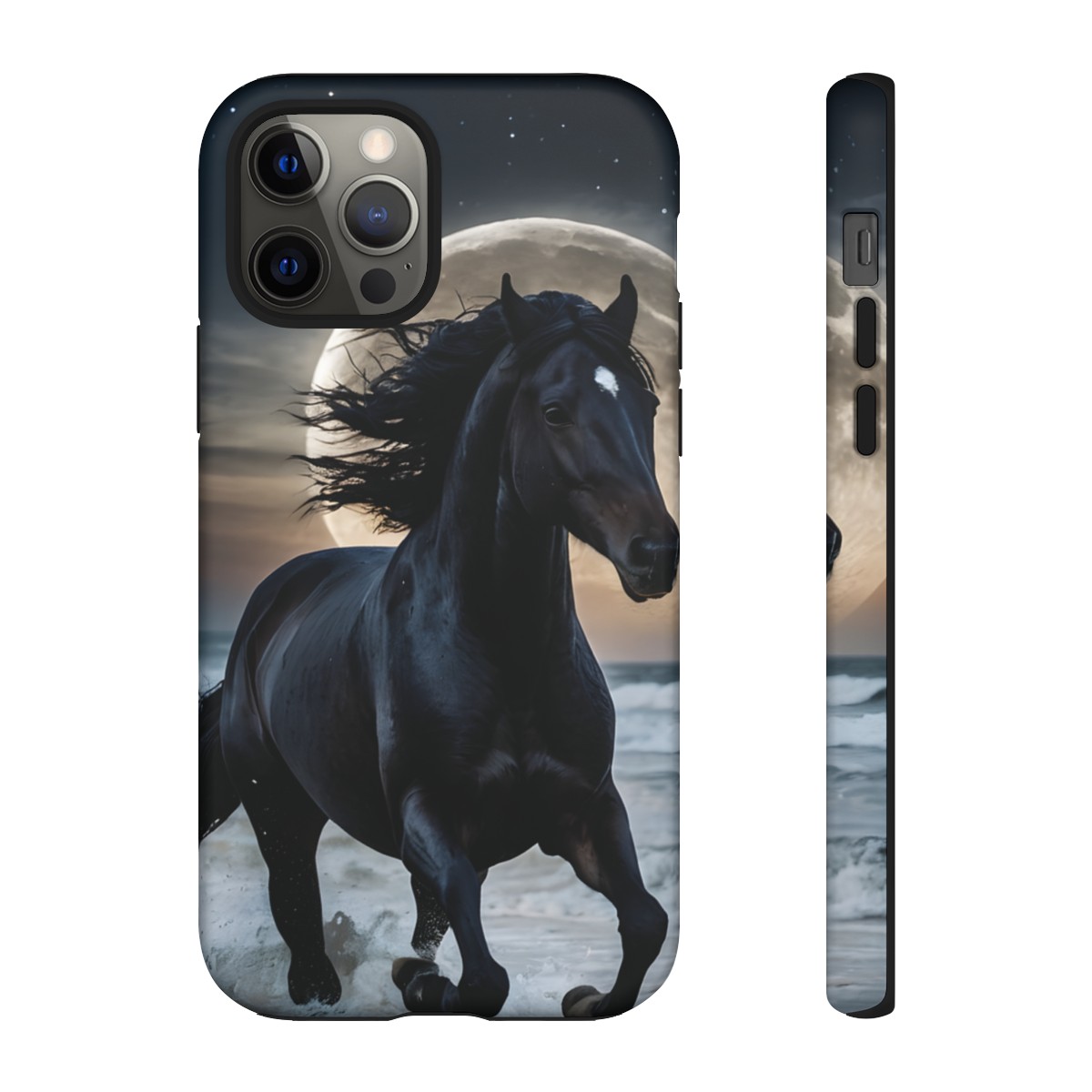 Bold and Beautiful Design: Experience the elegance of the night with our Majestic Midnight Stallion Phone Case. This exquisite piece boasts a stunning, lifelike portrayal of a powerful stallion in motion, set against the tranquil backdrop of a moonlit shore.