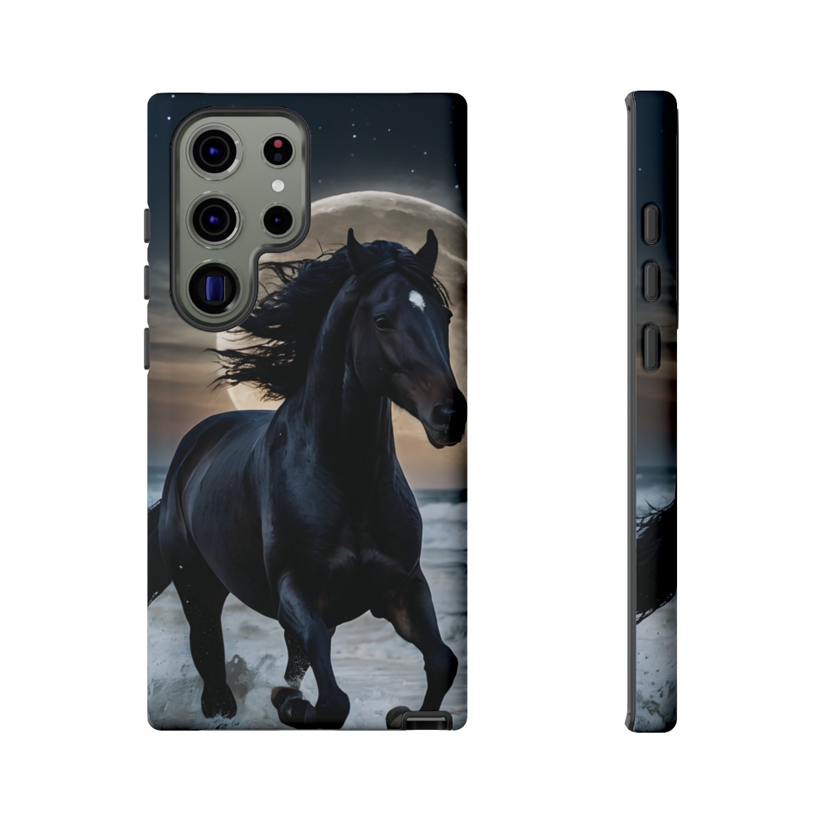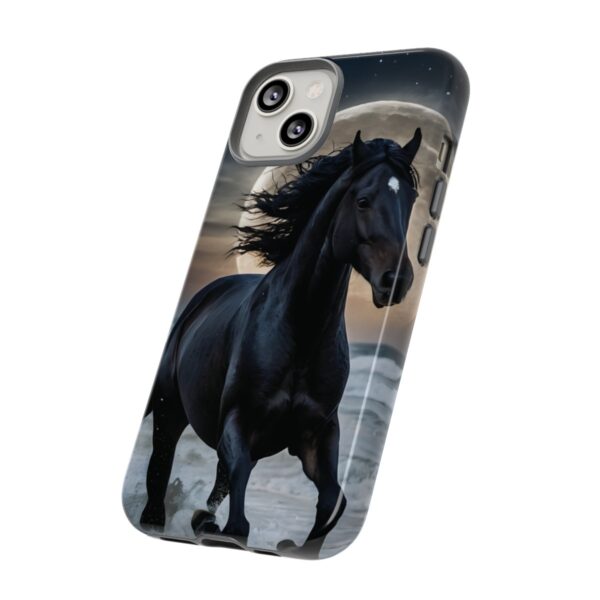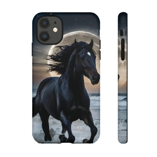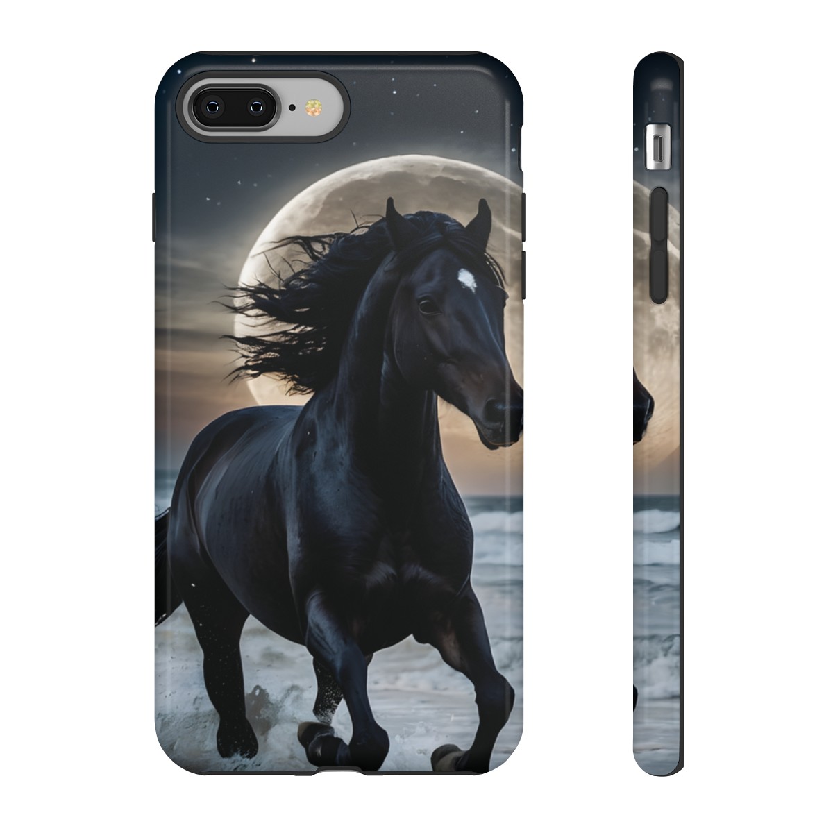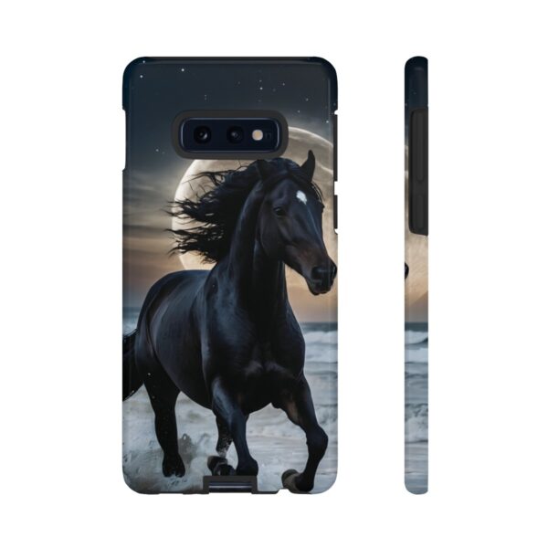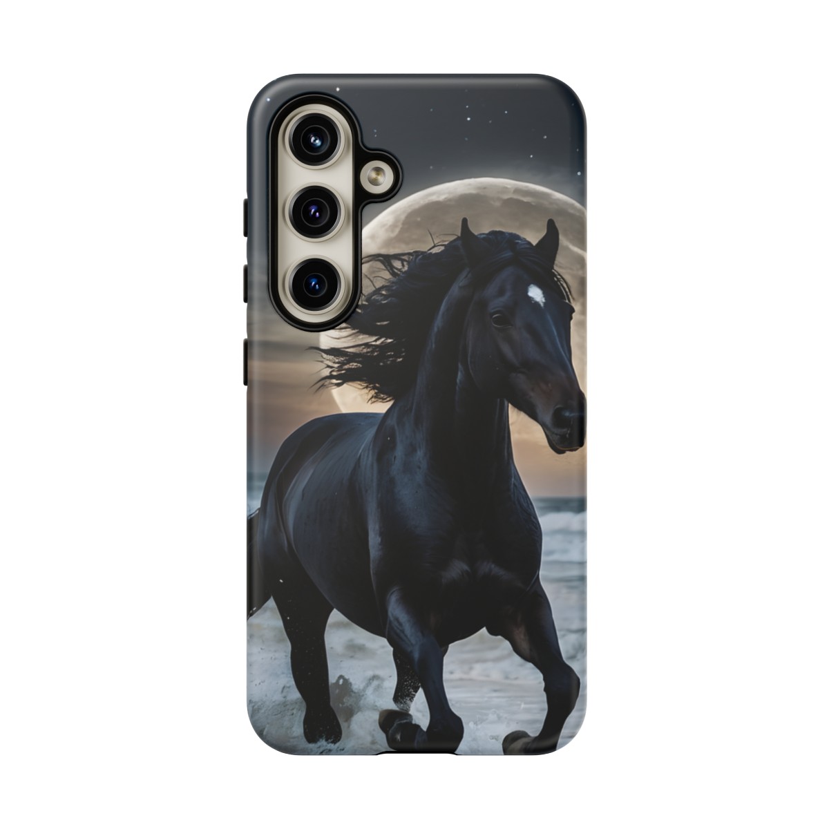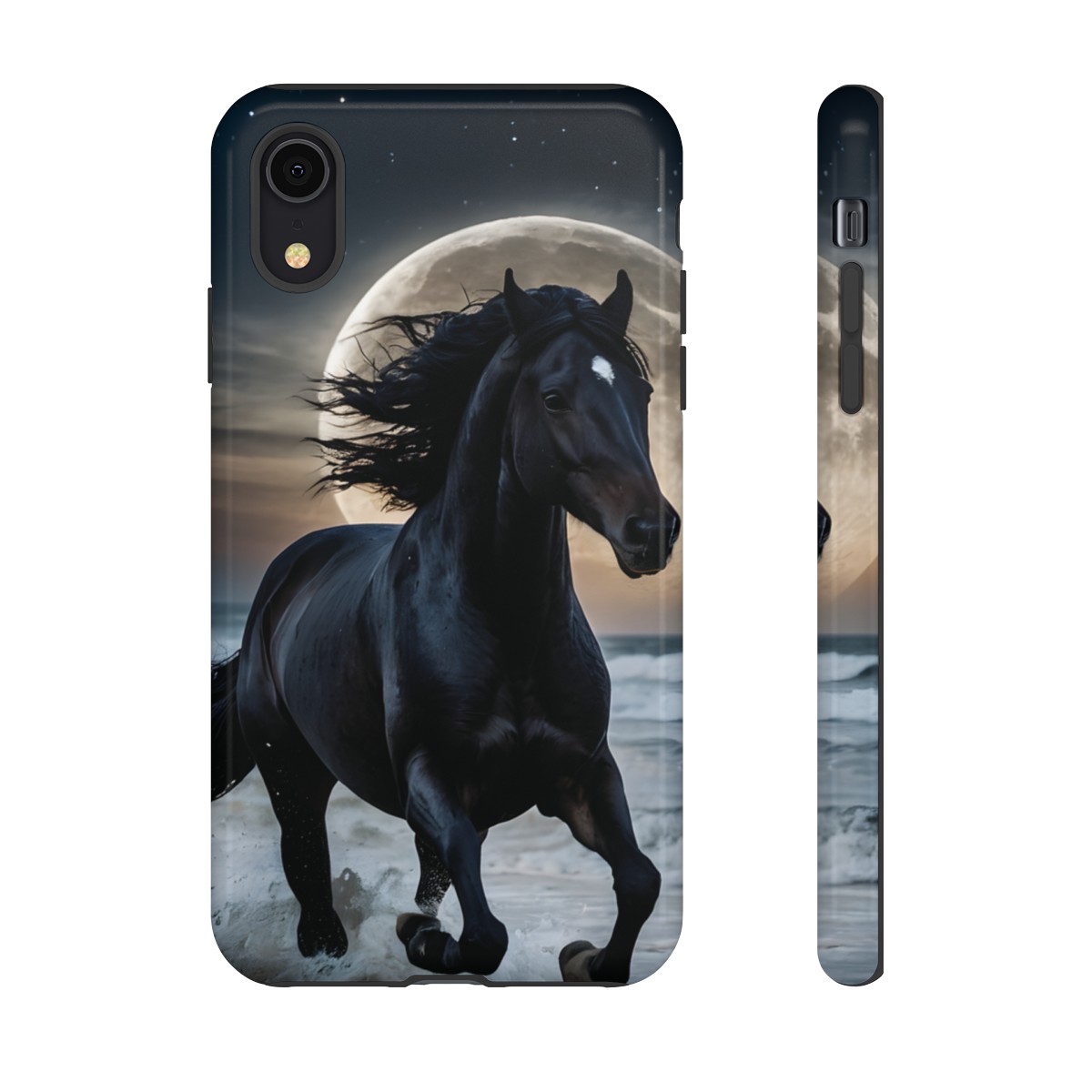 Bold and Beautiful Design: Experience the elegance of the night with our Majestic Midnight Stallion Phone Case. This exquisite piece boasts a stunning, lifelike portrayal of a powerful stallion in motion, set against the tranquil backdrop of a moonlit shore.
