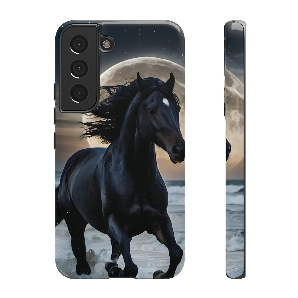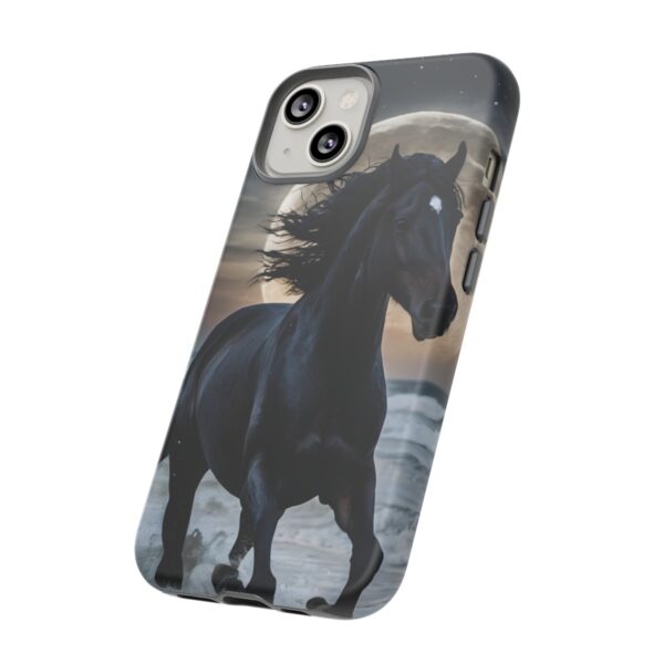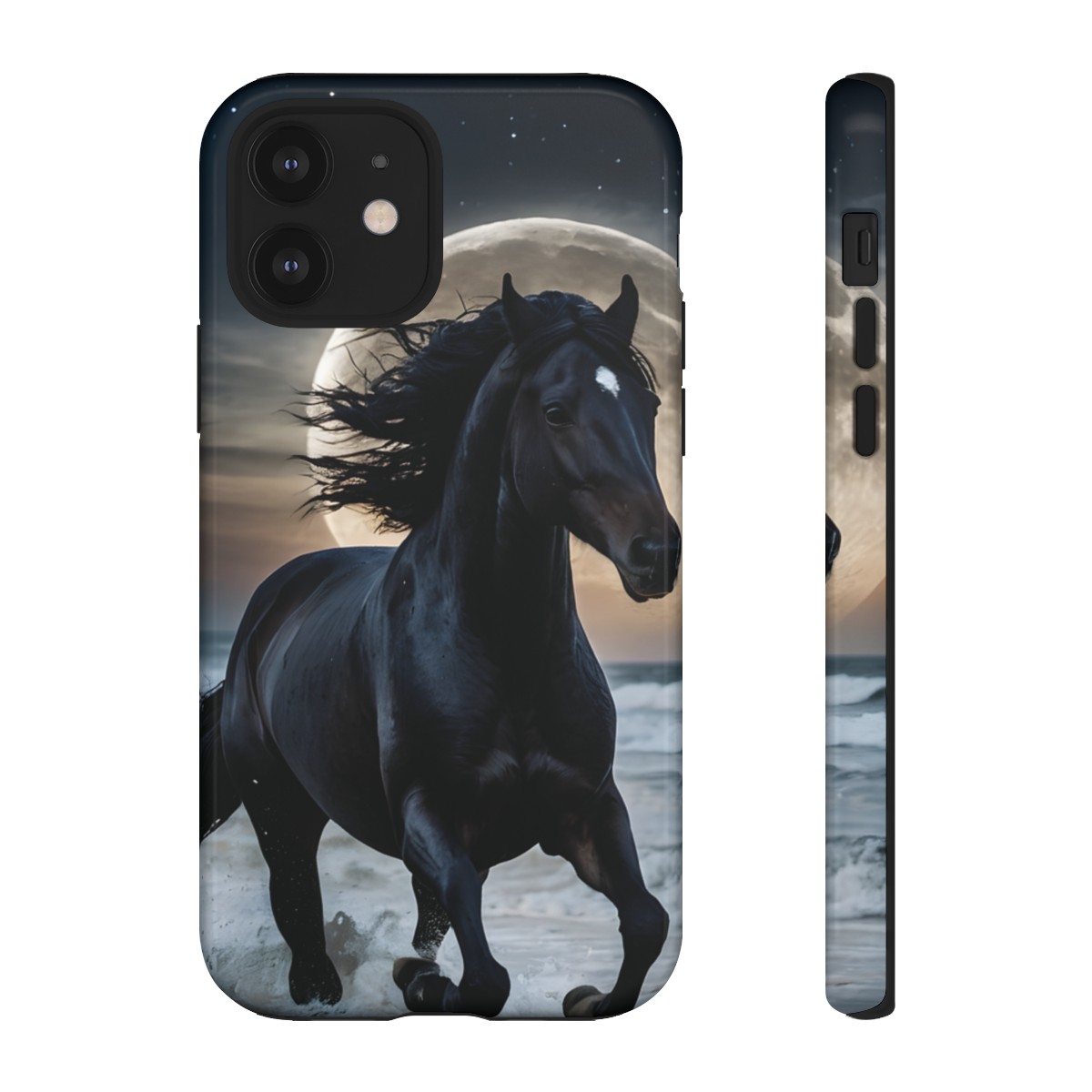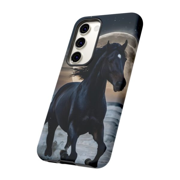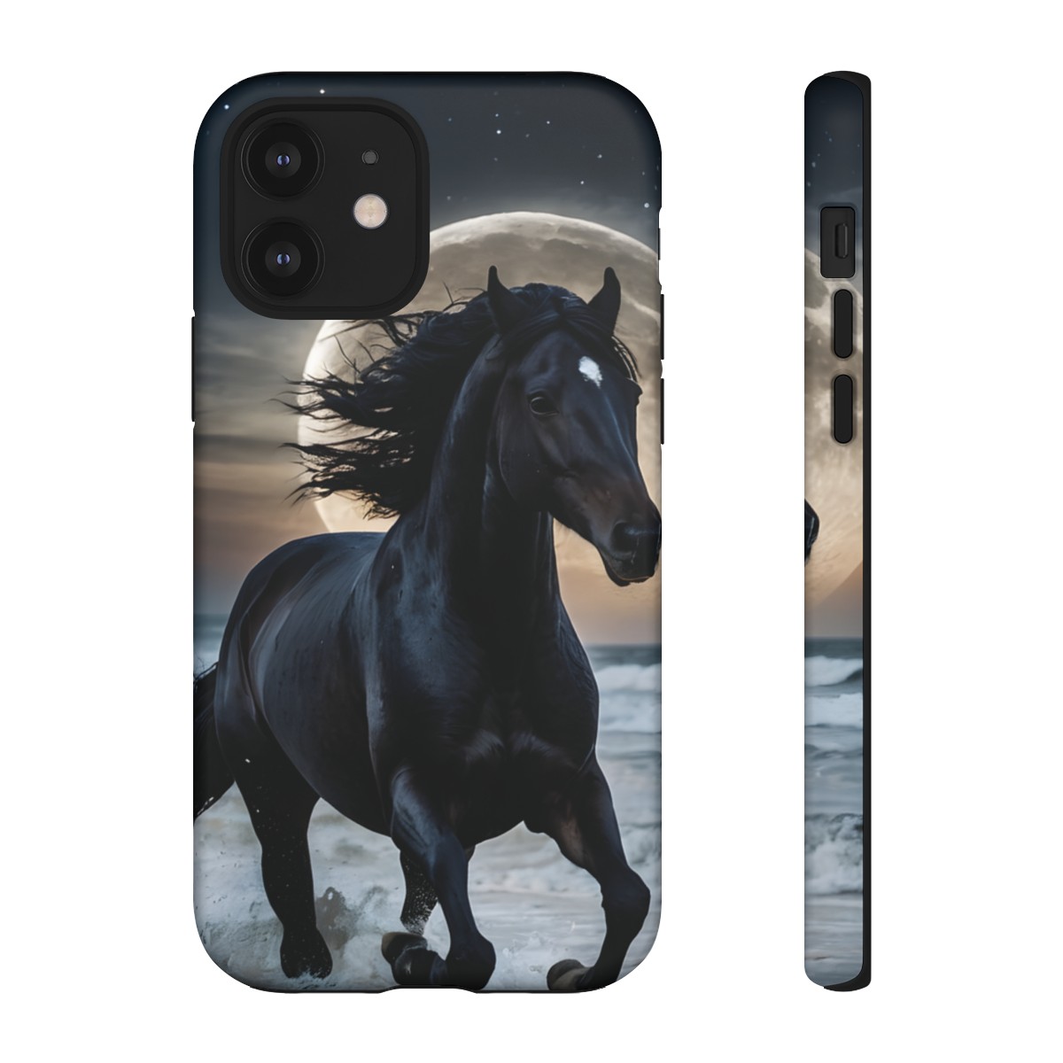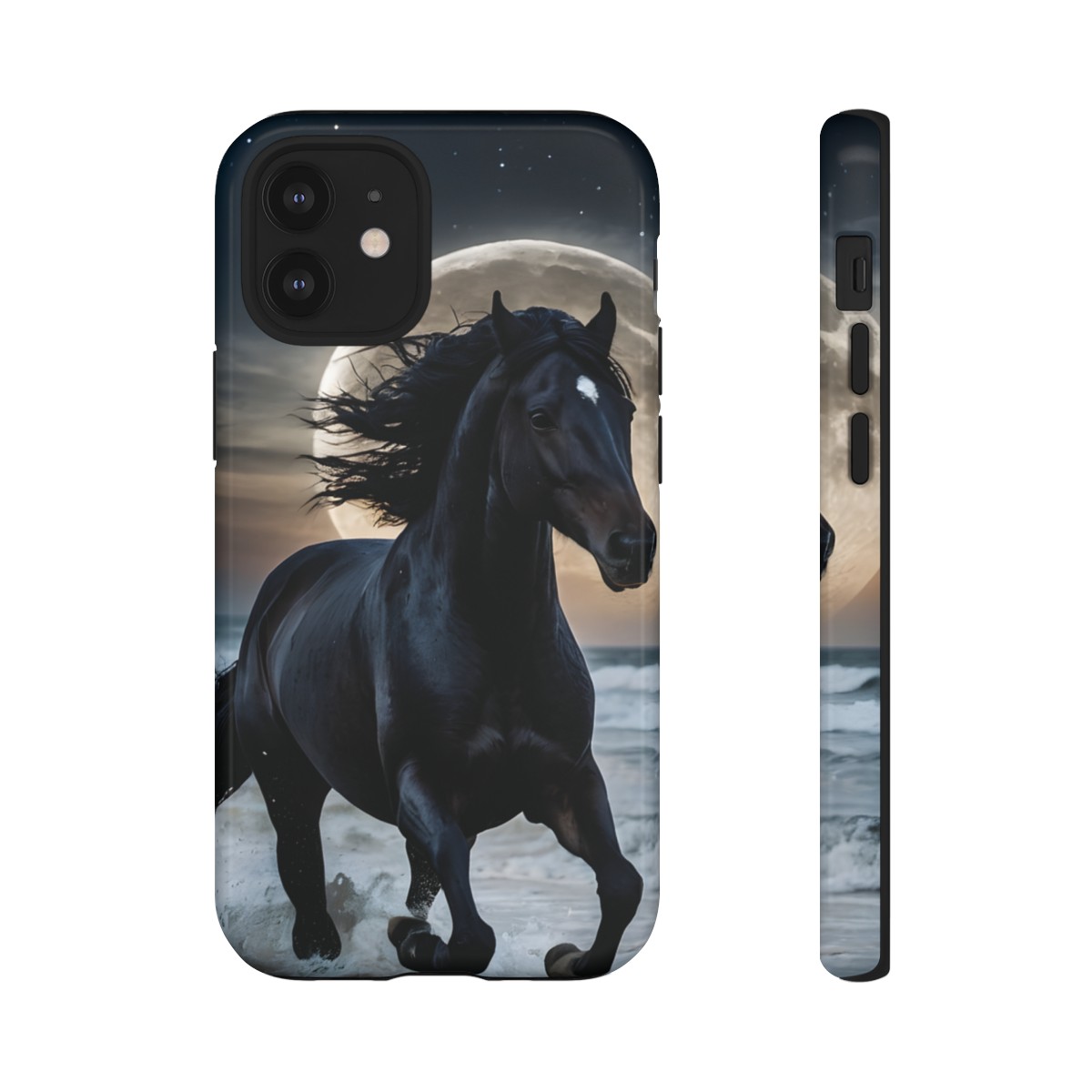 Bold and Beautiful Design: Experience the elegance of the night with our Majestic Midnight Stallion Phone Case. This exquisite piece boasts a stunning, lifelike portrayal of a powerful stallion in motion, set against the tranquil backdrop of a moonlit shore.