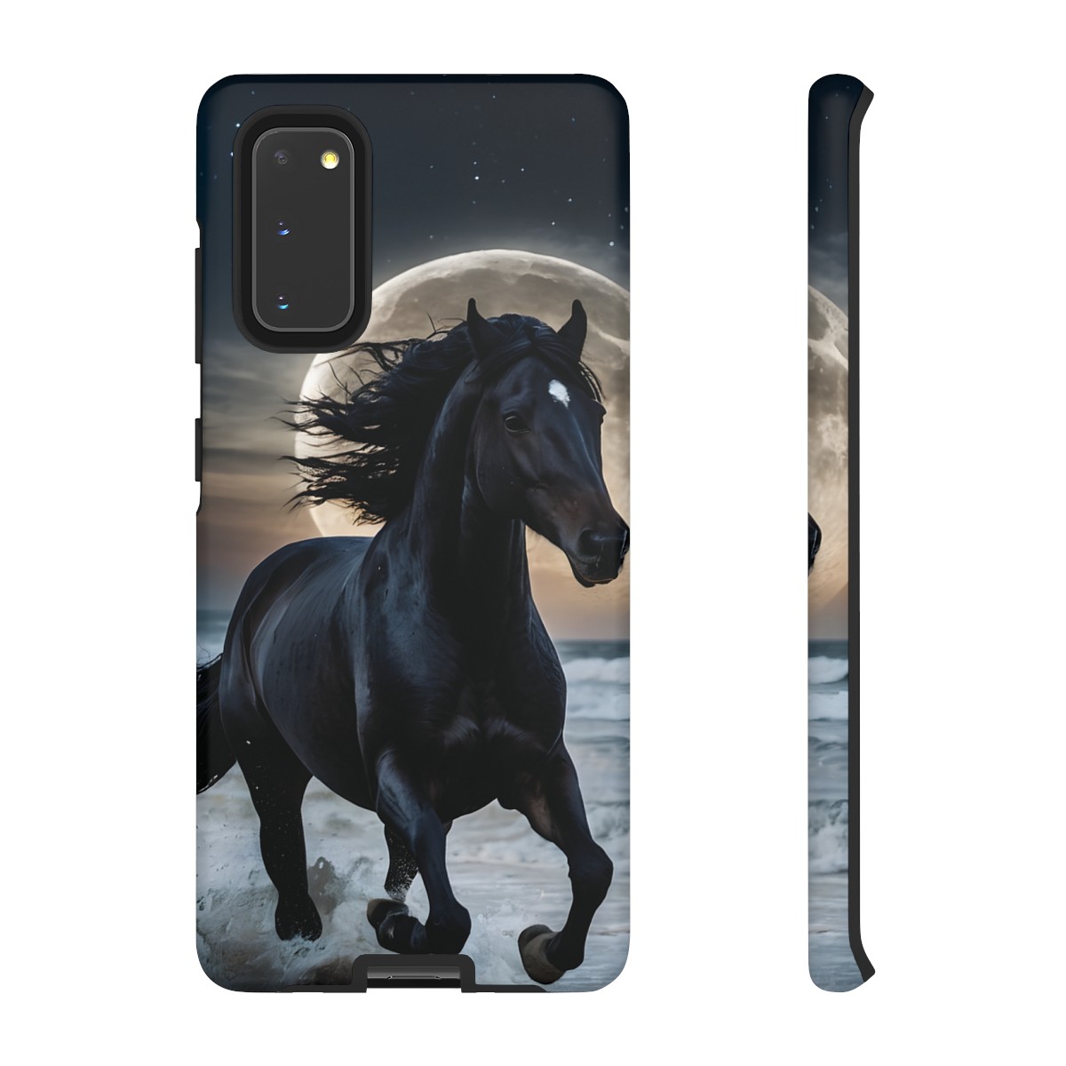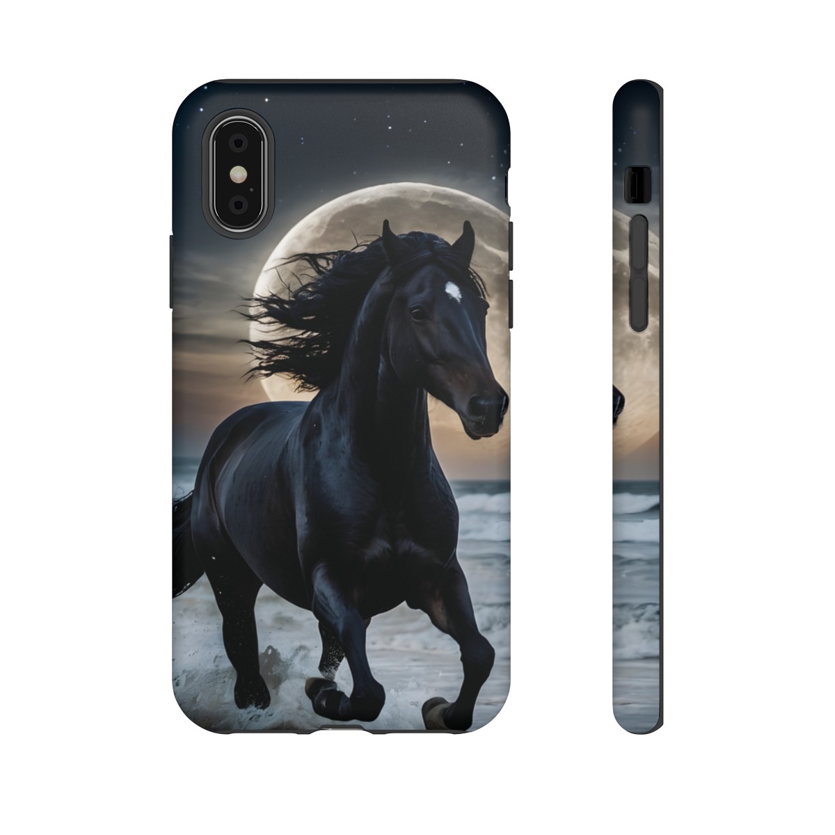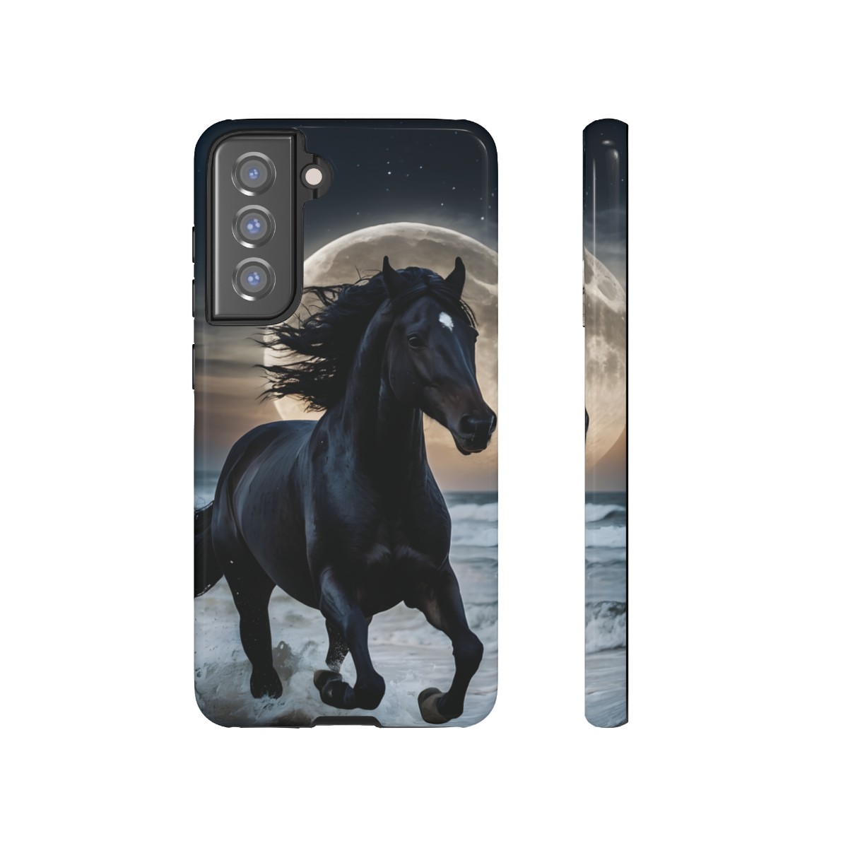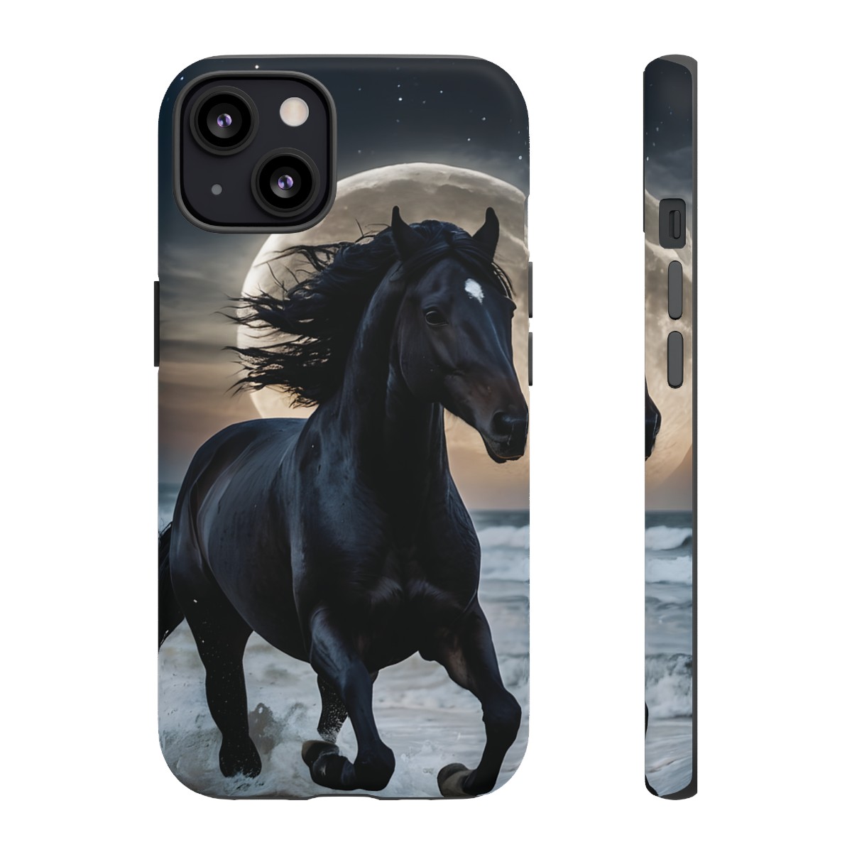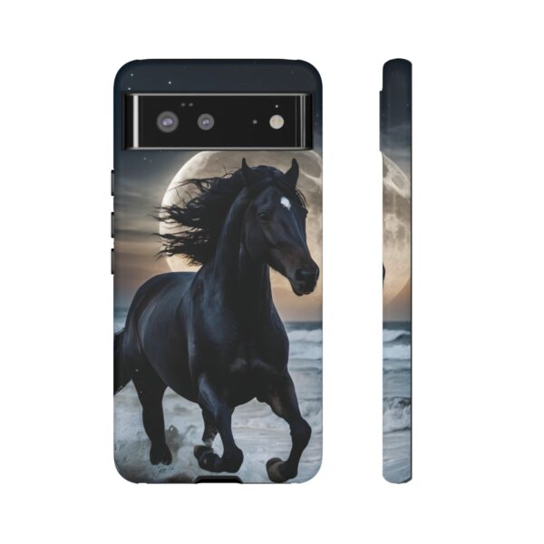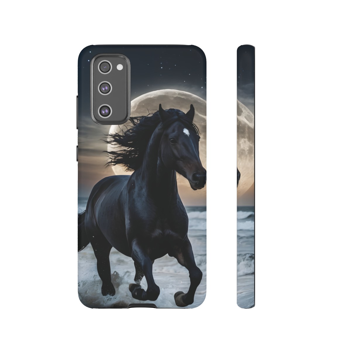 Bold and Beautiful Design: Experience the elegance of the night with our Majestic Midnight Stallion Phone Case. This exquisite piece boasts a stunning, lifelike portrayal of a powerful stallion in motion, set against the tranquil backdrop of a moonlit shore.
