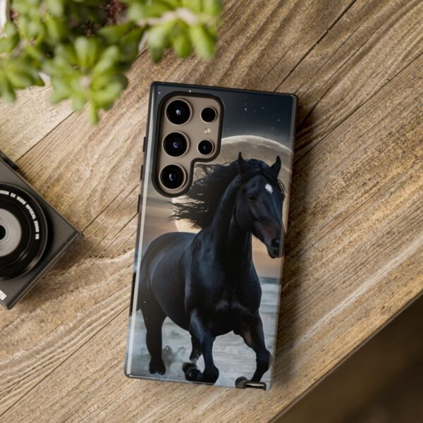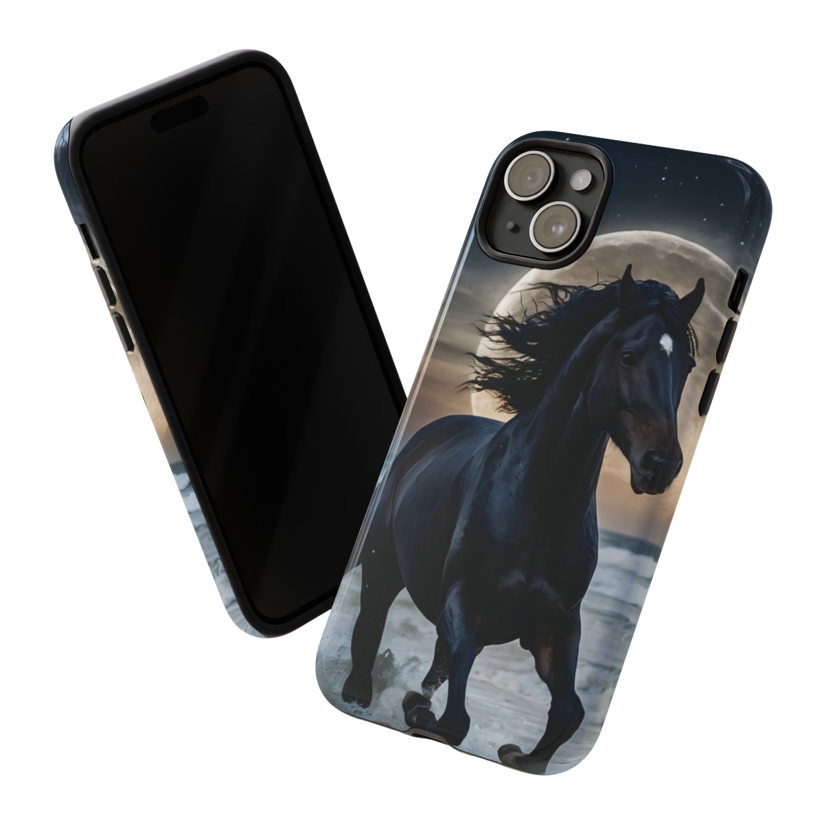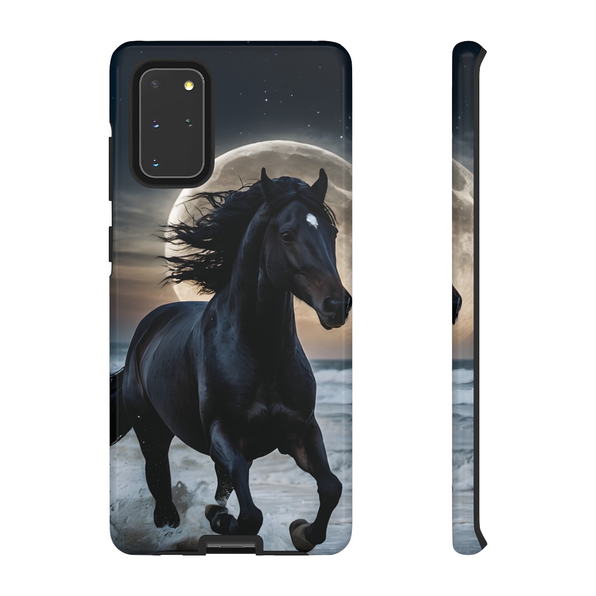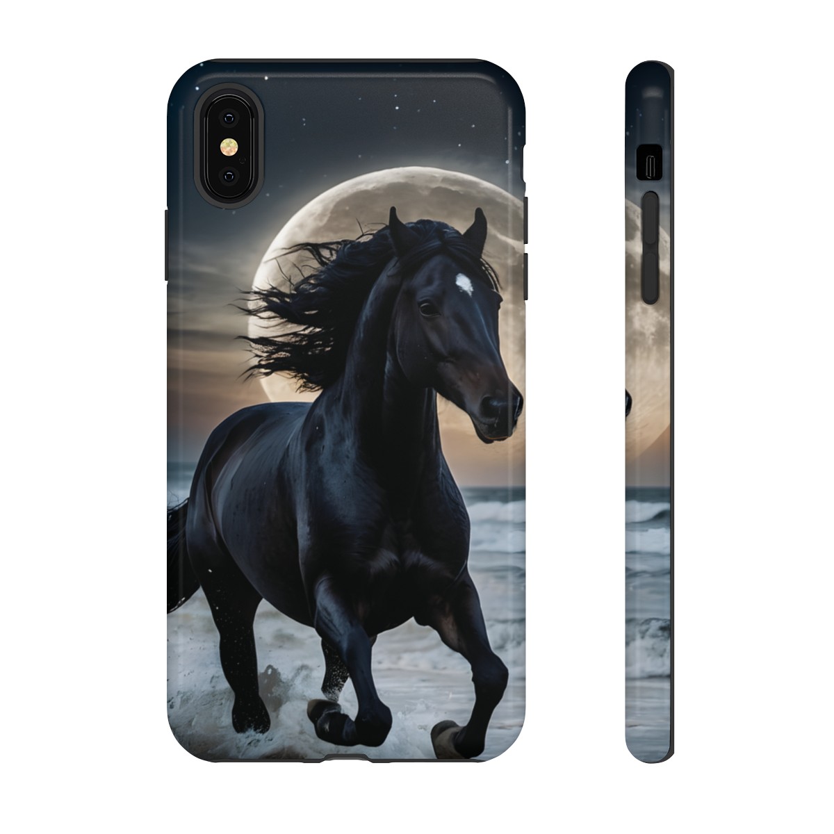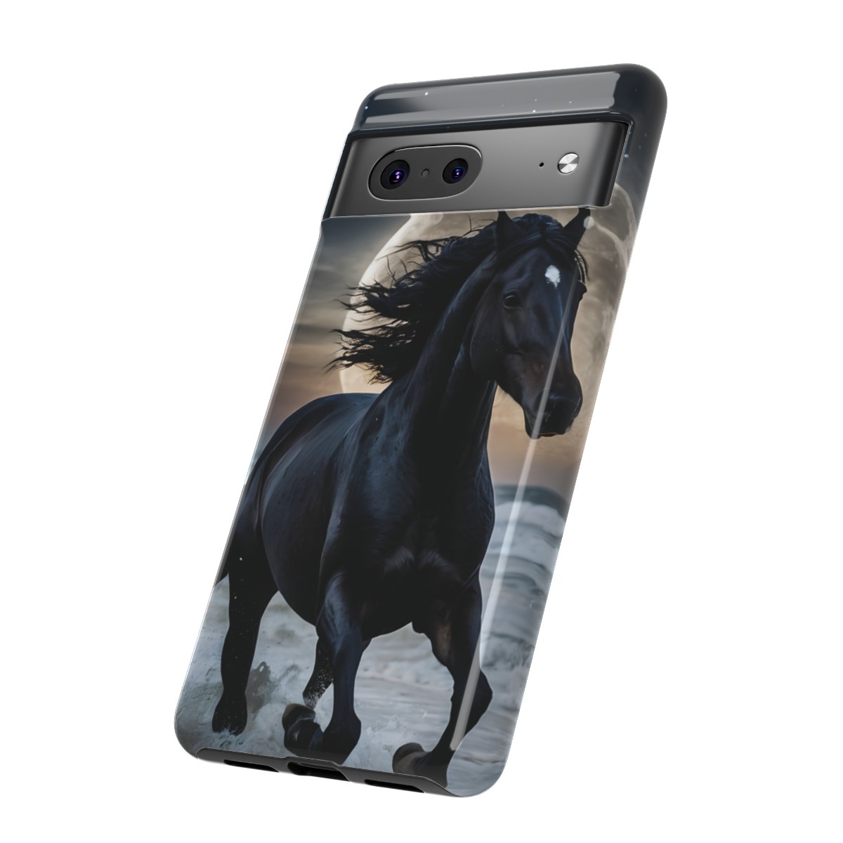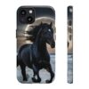 Bold and Beautiful Design: Experience the elegance of the night with our Majestic Midnight Stallion Phone Case. This exquisite piece boasts a stunning, lifelike portrayal of a powerful stallion in motion, set against the tranquil backdrop of a moonlit shore.