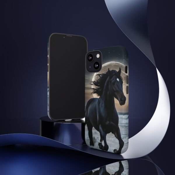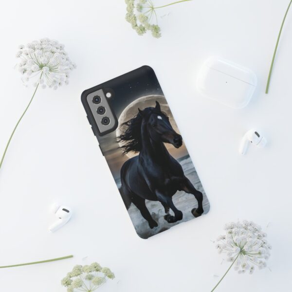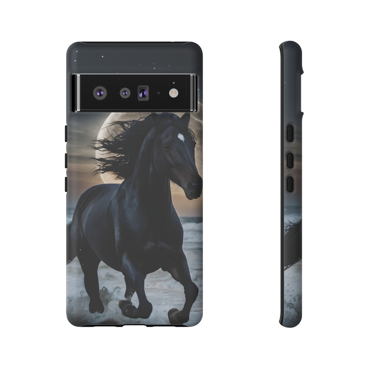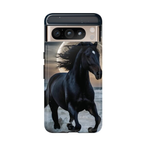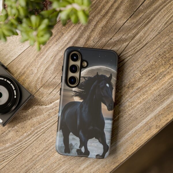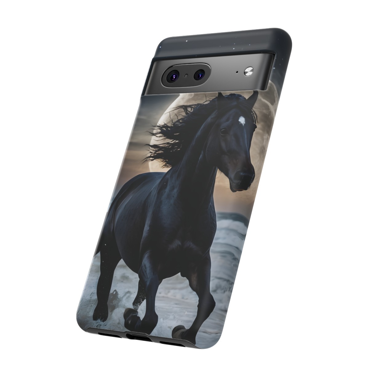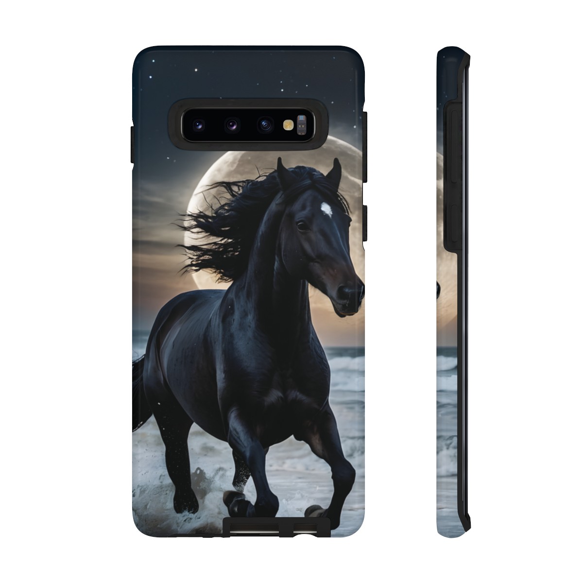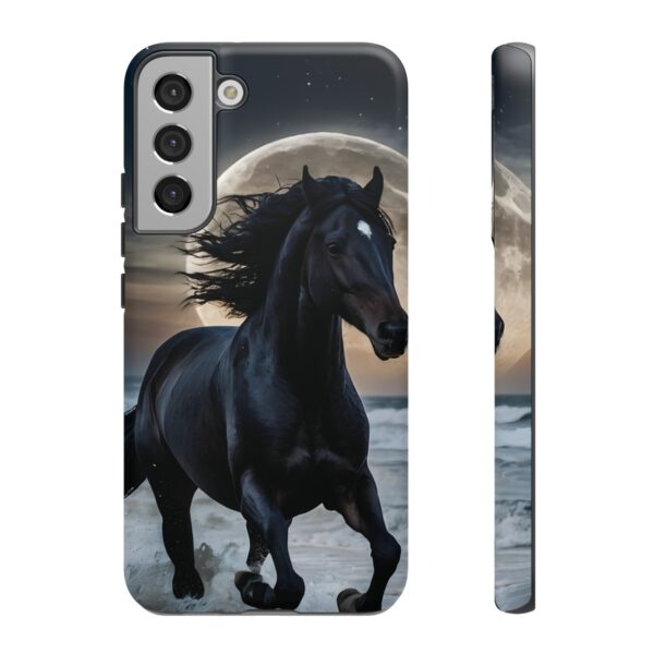 Bold and Beautiful Design: Experience the elegance of the night with our Majestic Midnight Stallion Phone Case. This exquisite piece boasts a stunning, lifelike portrayal of a powerful stallion in motion, set against the tranquil backdrop of a moonlit shore.