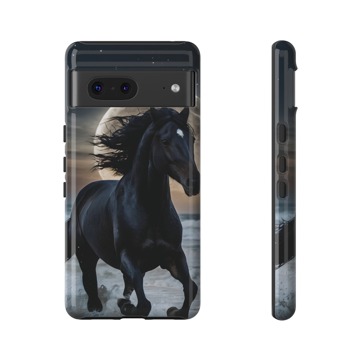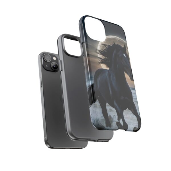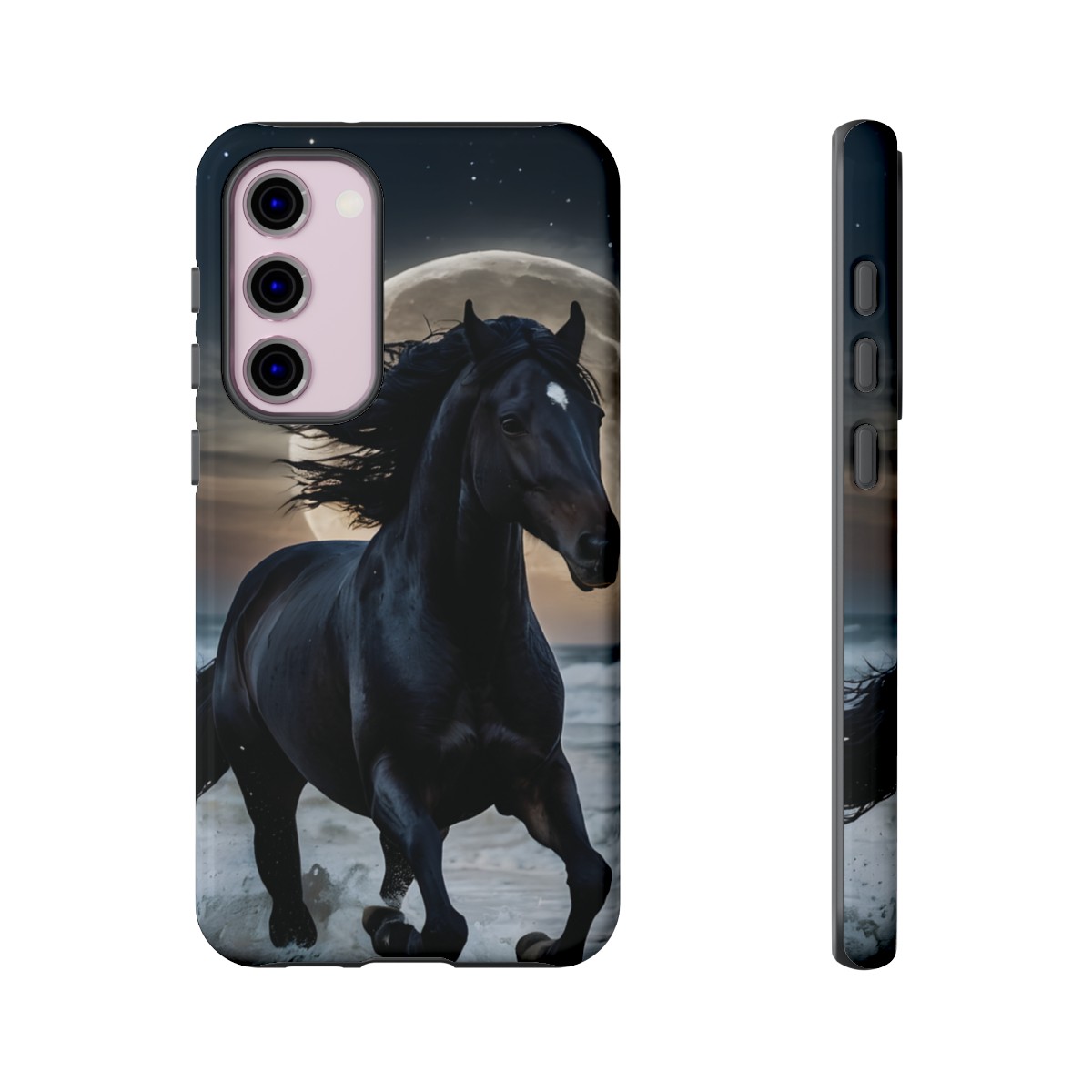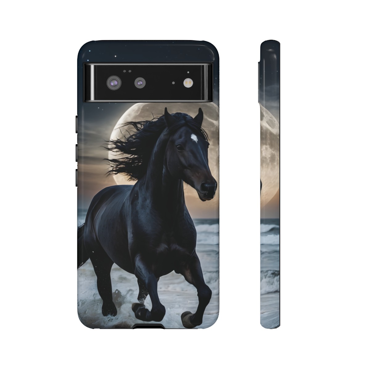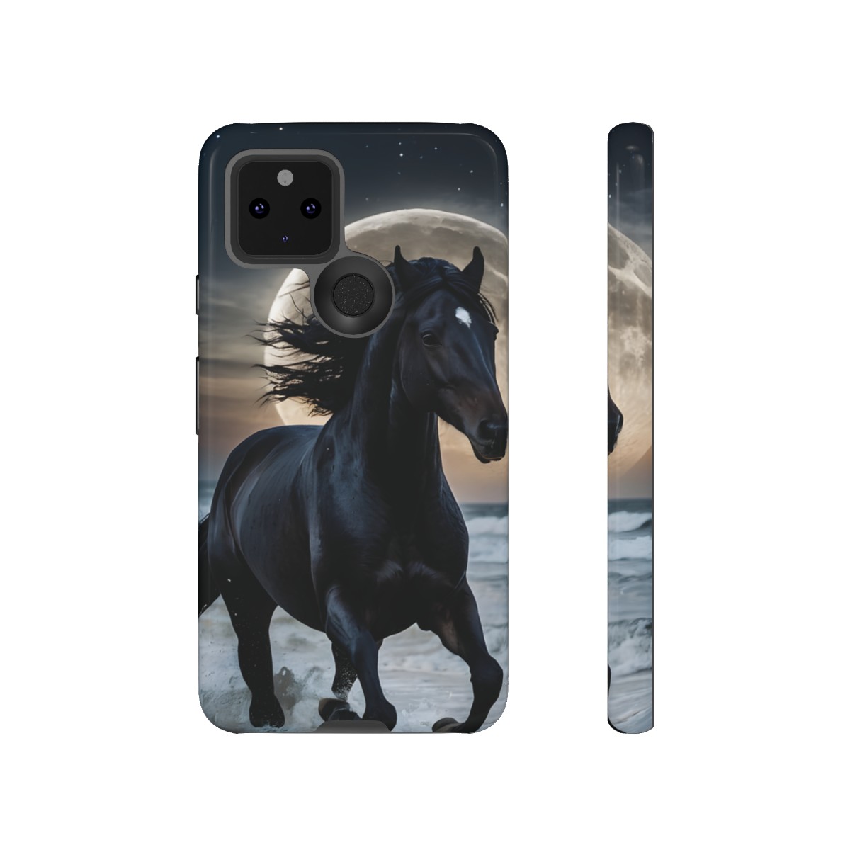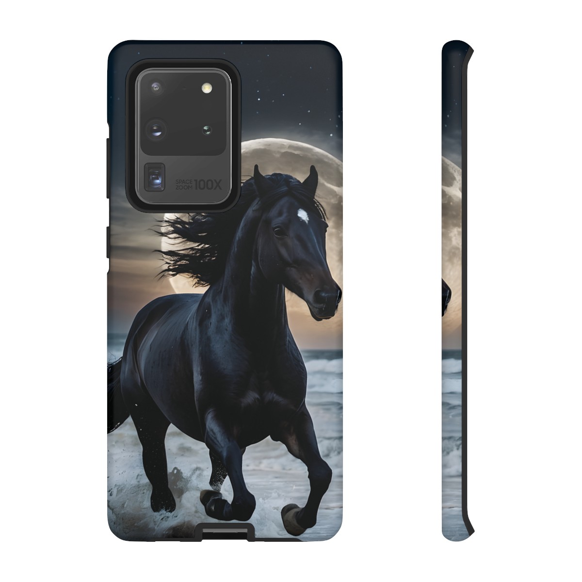 Bold and Beautiful Design: Experience the elegance of the night with our Majestic Midnight Stallion Phone Case. This exquisite piece boasts a stunning, lifelike portrayal of a powerful stallion in motion, set against the tranquil backdrop of a moonlit shore.