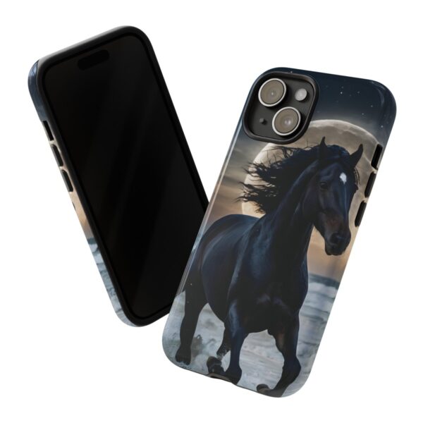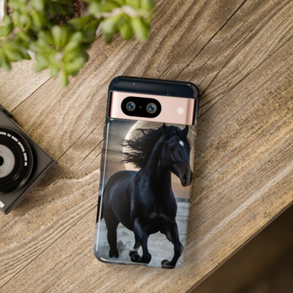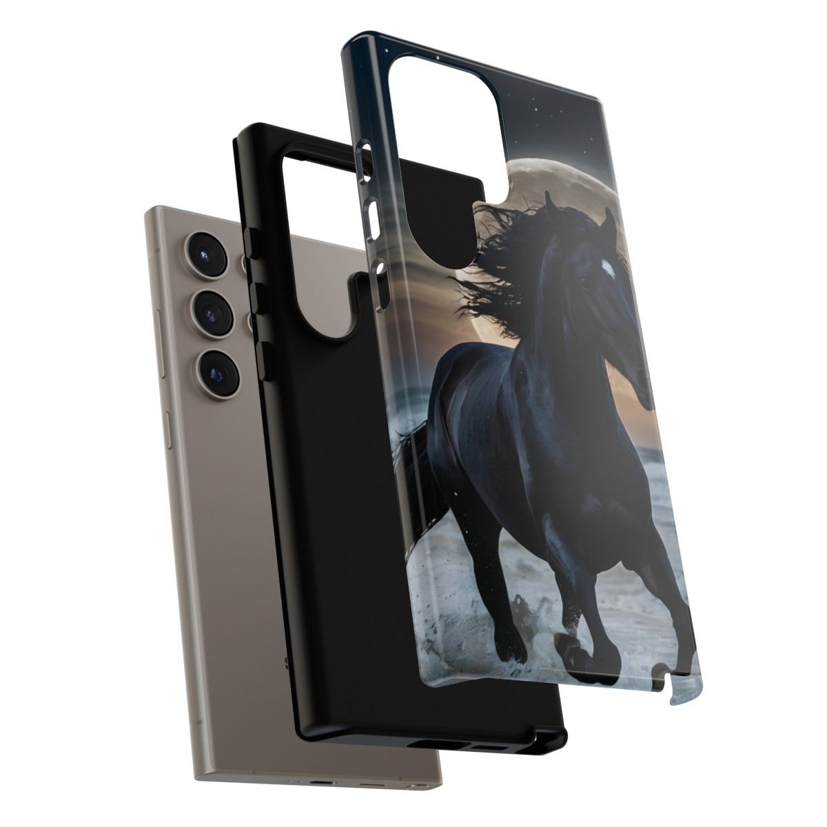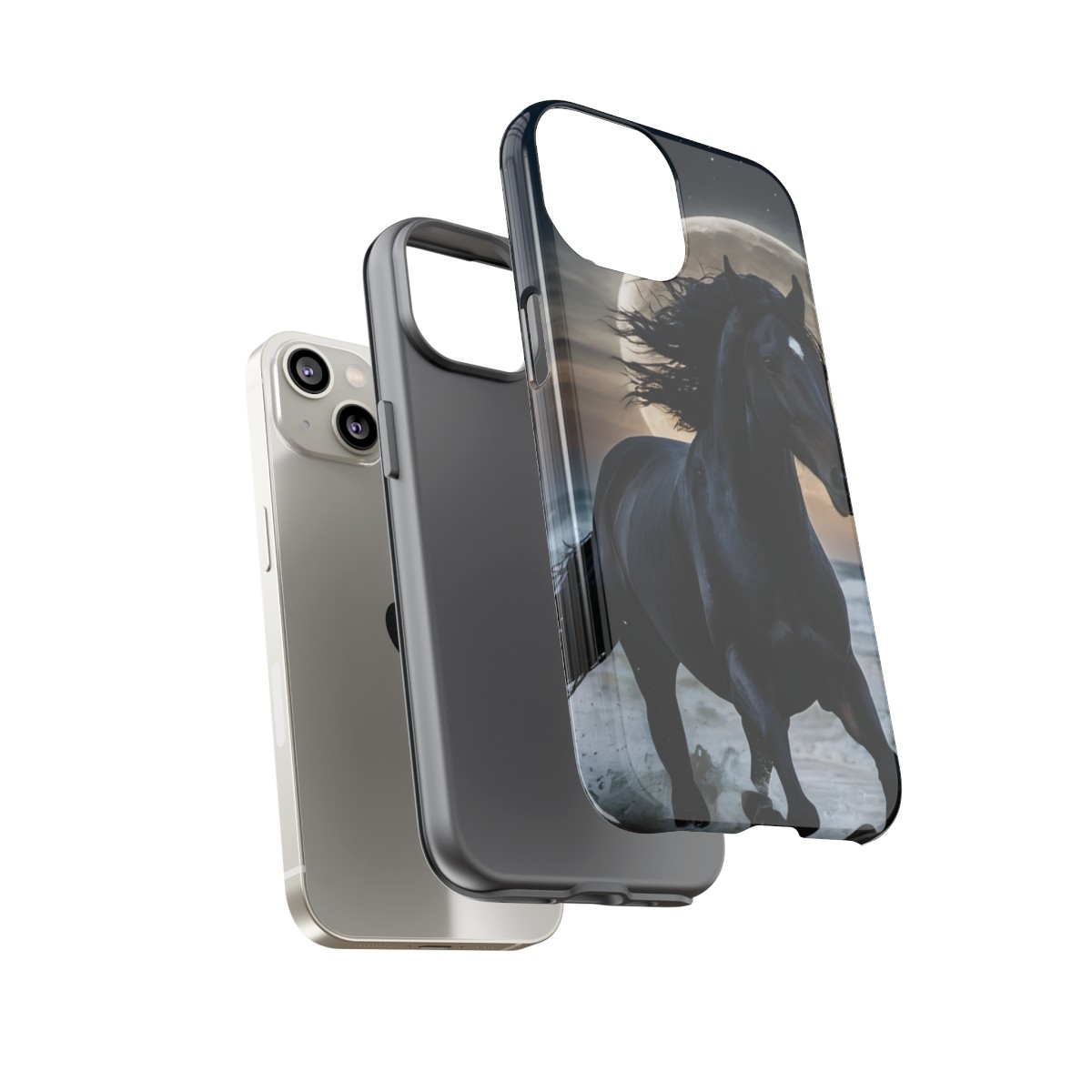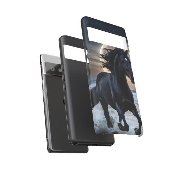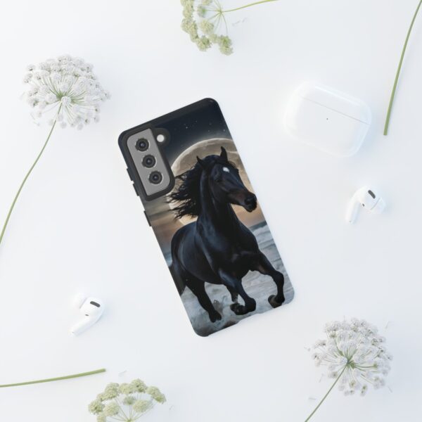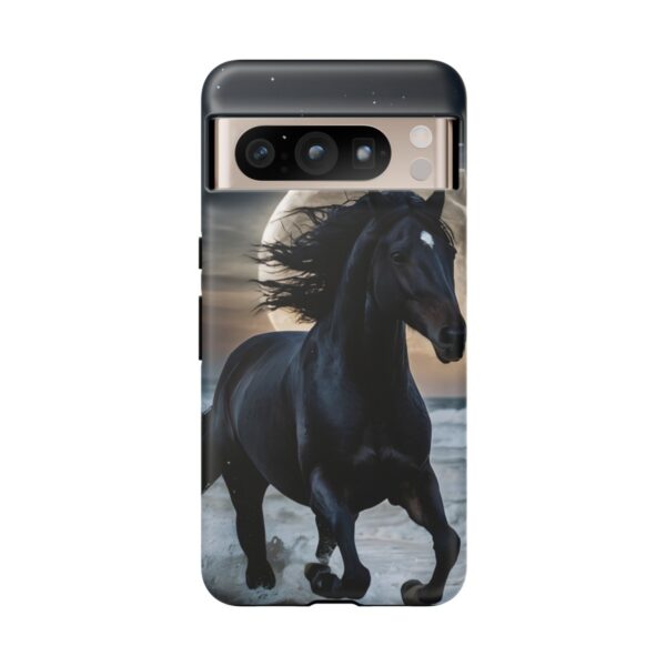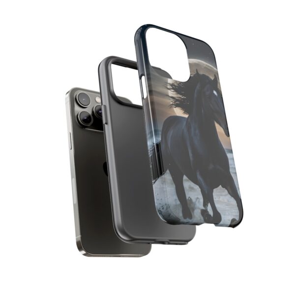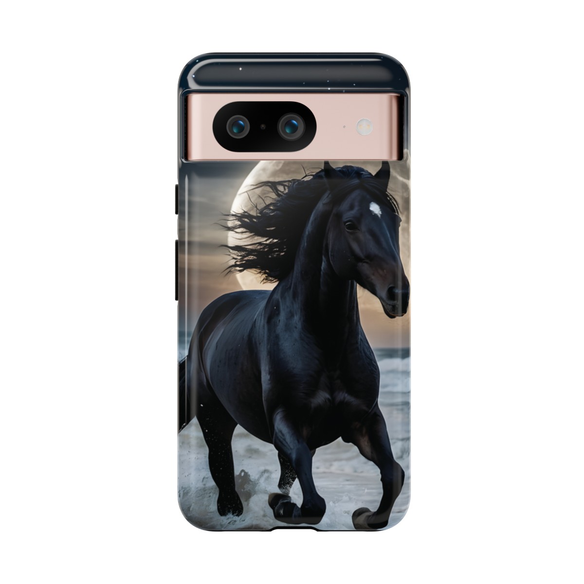 Bold and Beautiful Design: Experience the elegance of the night with our Majestic Midnight Stallion Phone Case. This exquisite piece boasts a stunning, lifelike portrayal of a powerful stallion in motion, set against the tranquil backdrop of a moonlit shore.