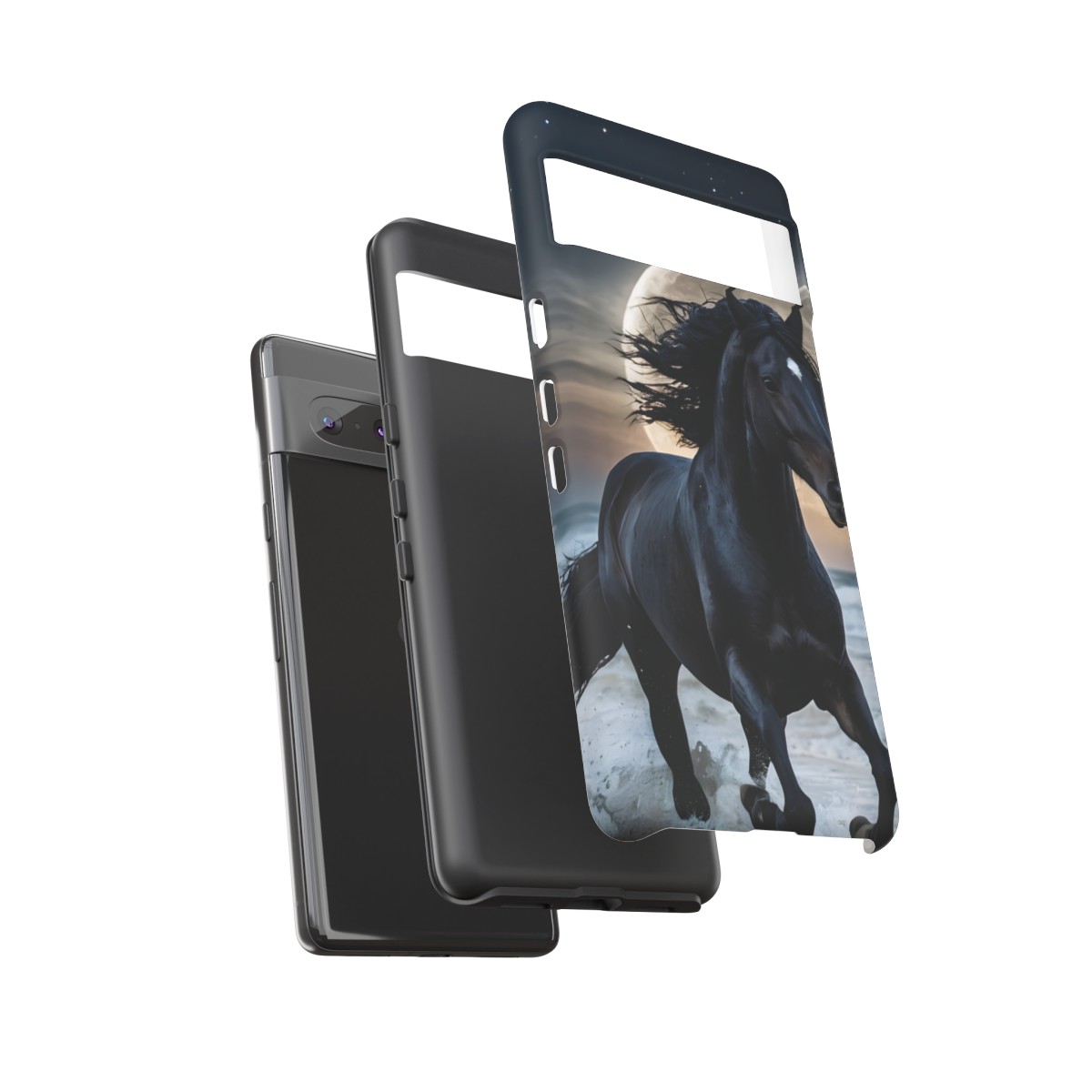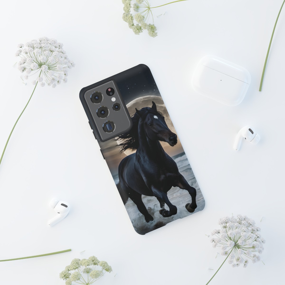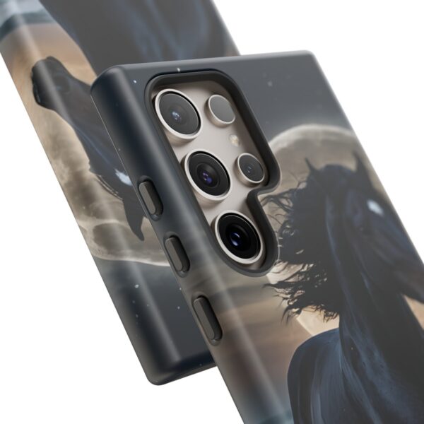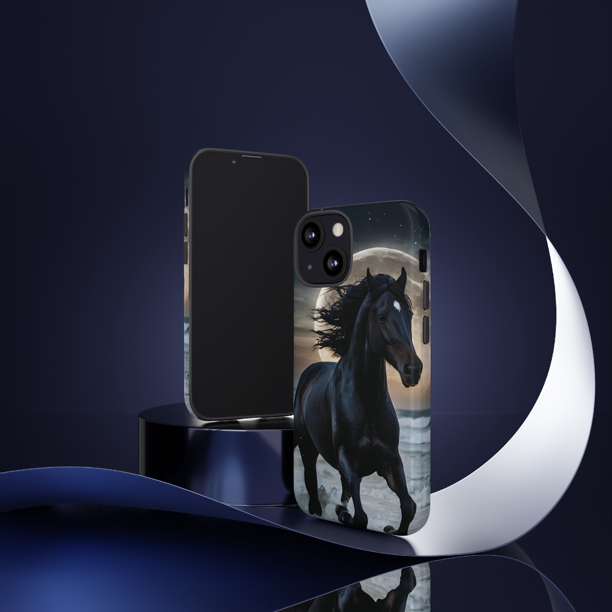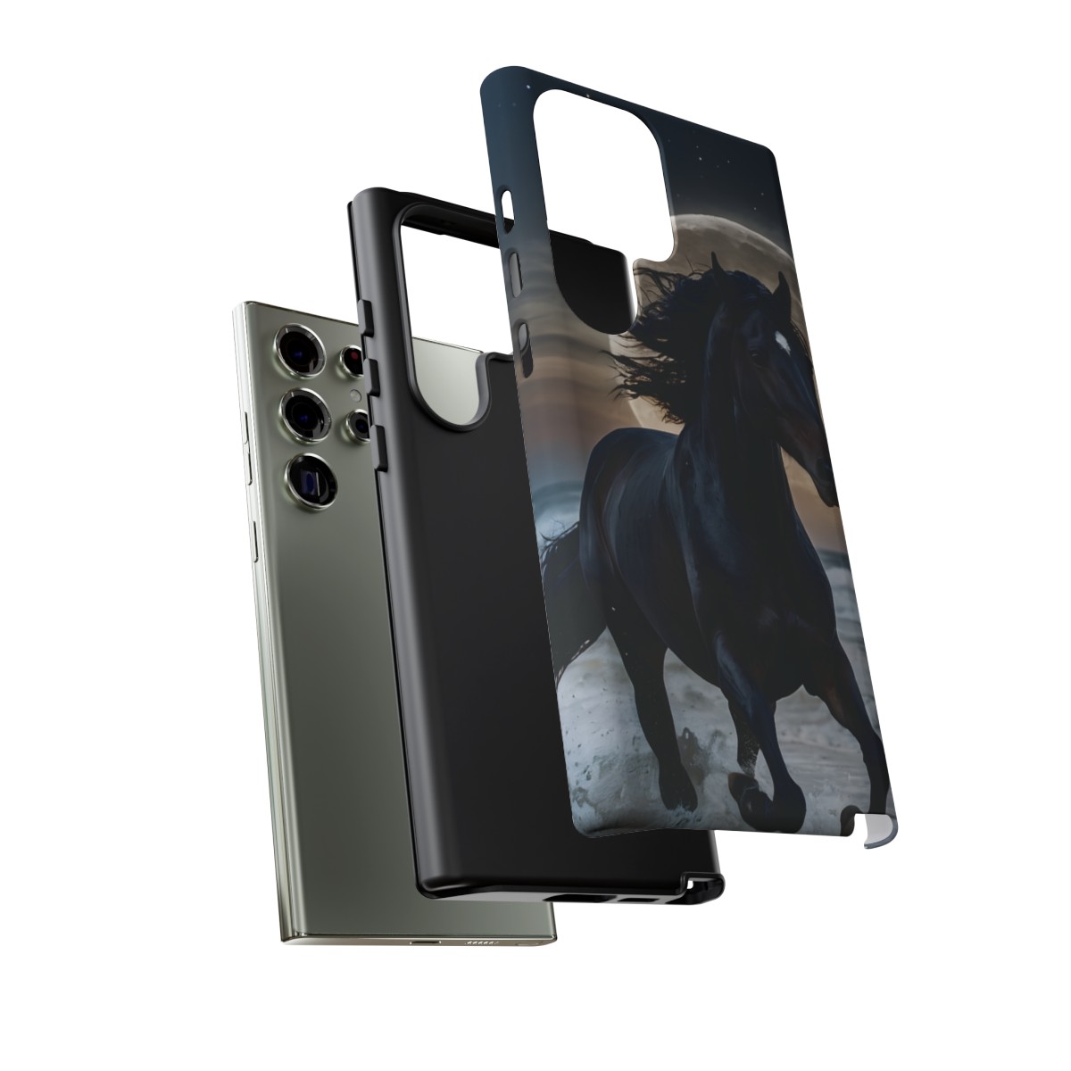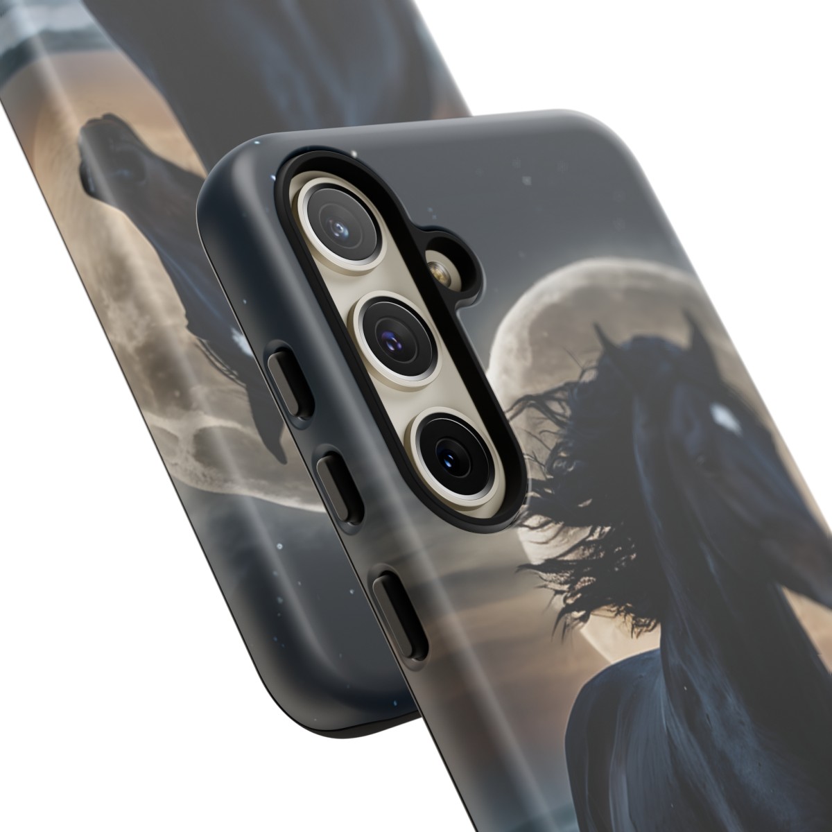 Bold and Beautiful Design: Experience the elegance of the night with our Majestic Midnight Stallion Phone Case. This exquisite piece boasts a stunning, lifelike portrayal of a powerful stallion in motion, set against the tranquil backdrop of a moonlit shore.