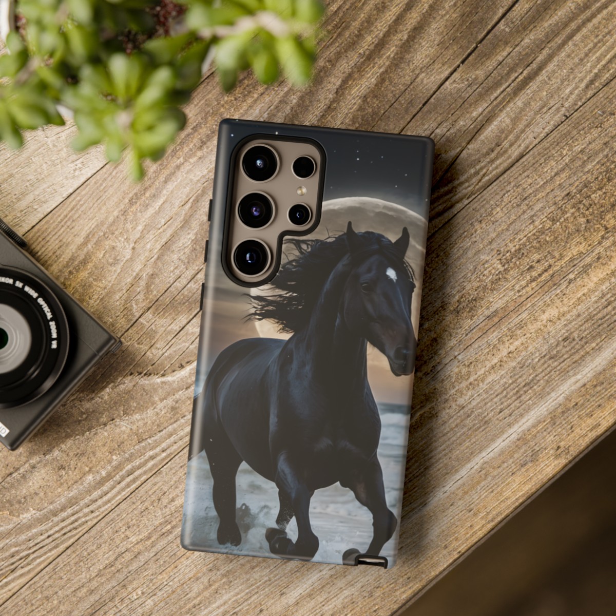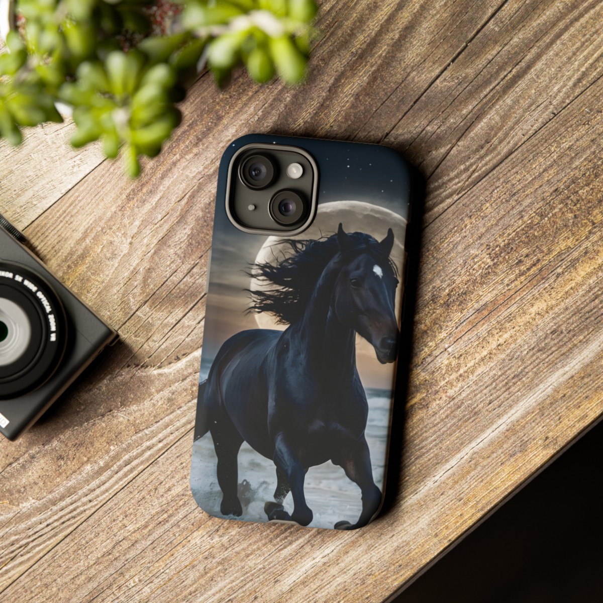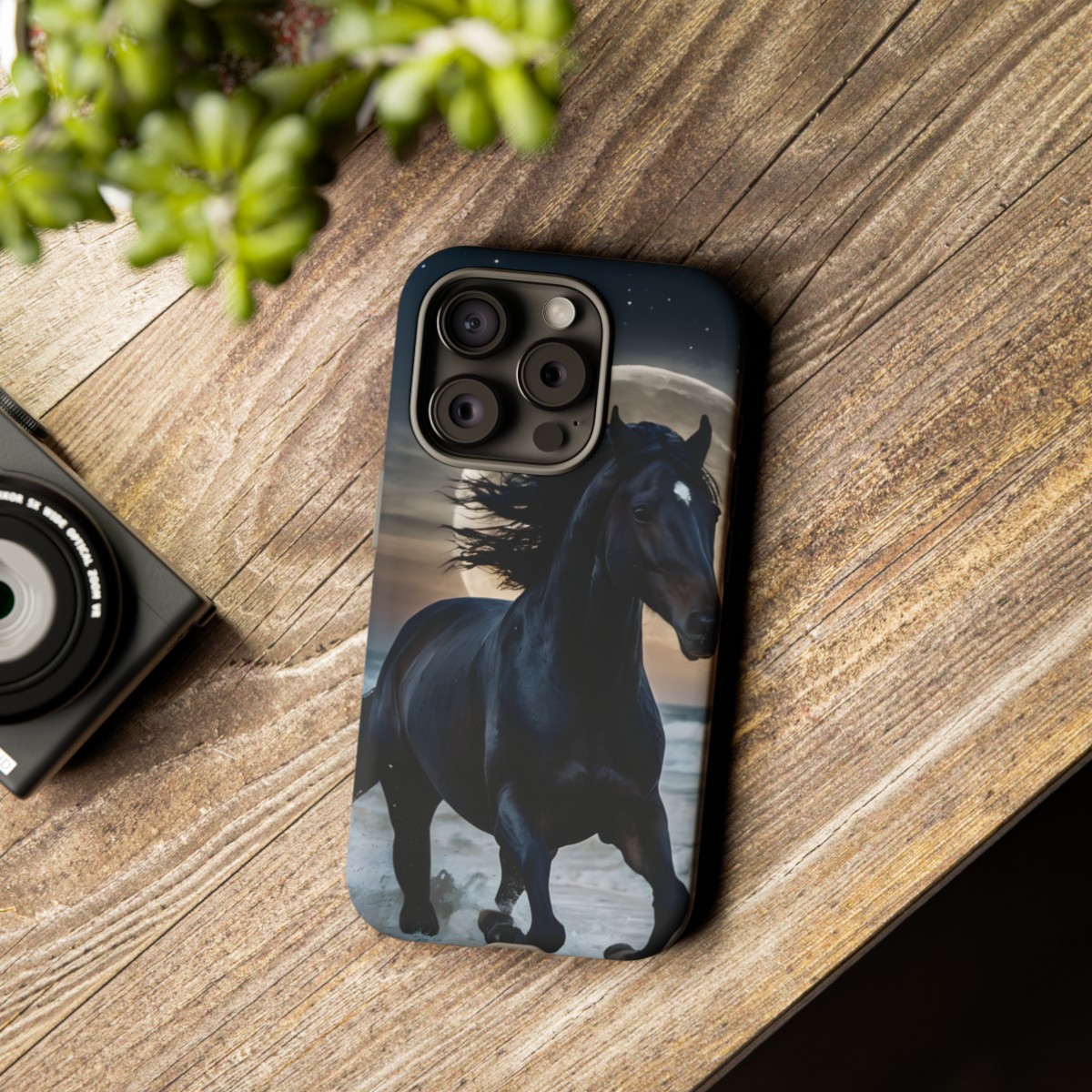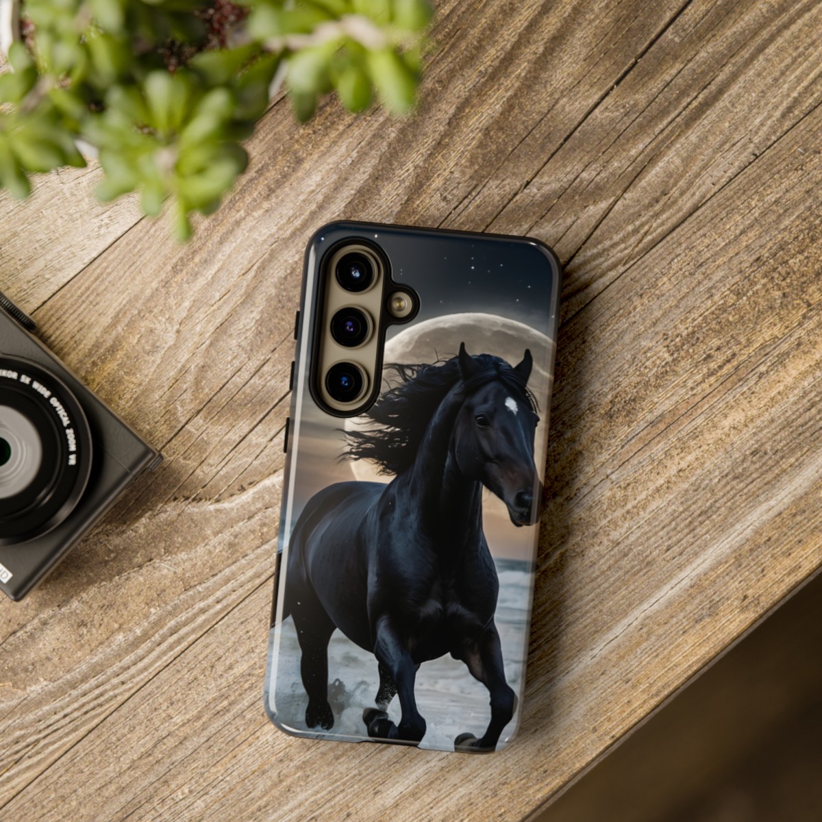 Bold and Beautiful Design: Experience the elegance of the night with our Majestic Midnight Stallion Phone Case. This exquisite piece boasts a stunning, lifelike portrayal of a powerful stallion in motion, set against the tranquil backdrop of a moonlit shore.