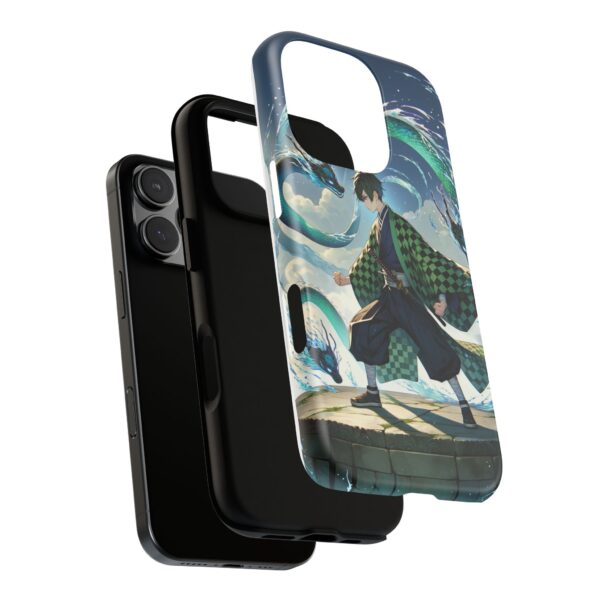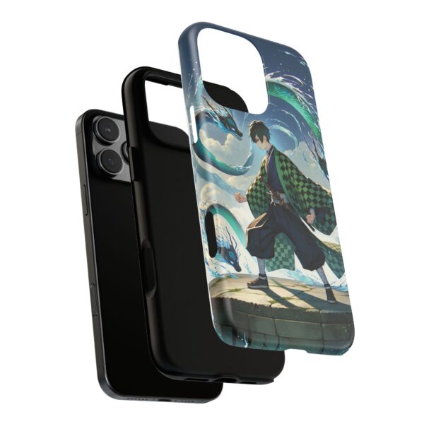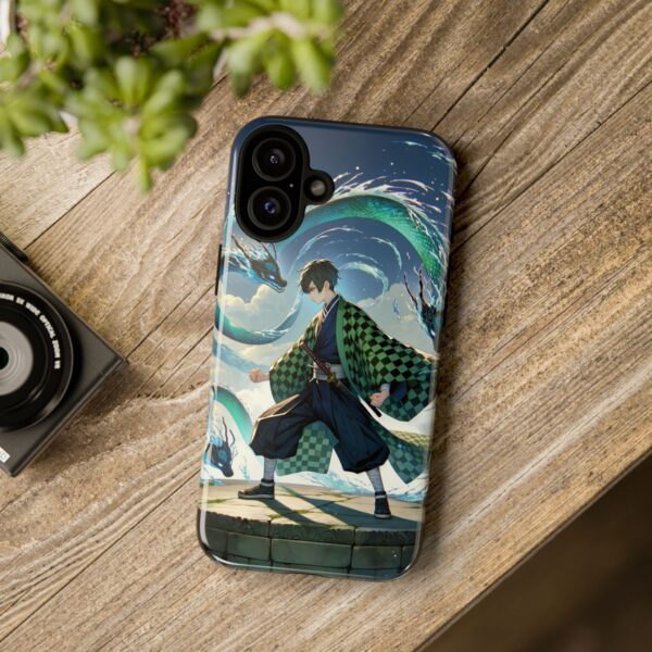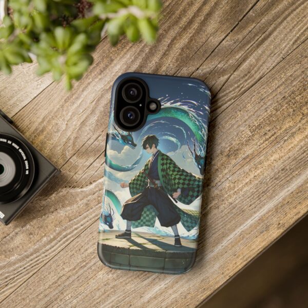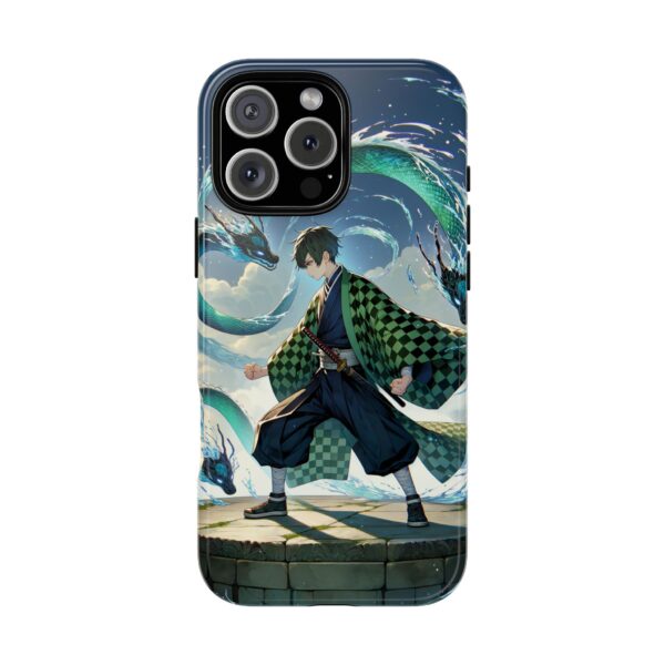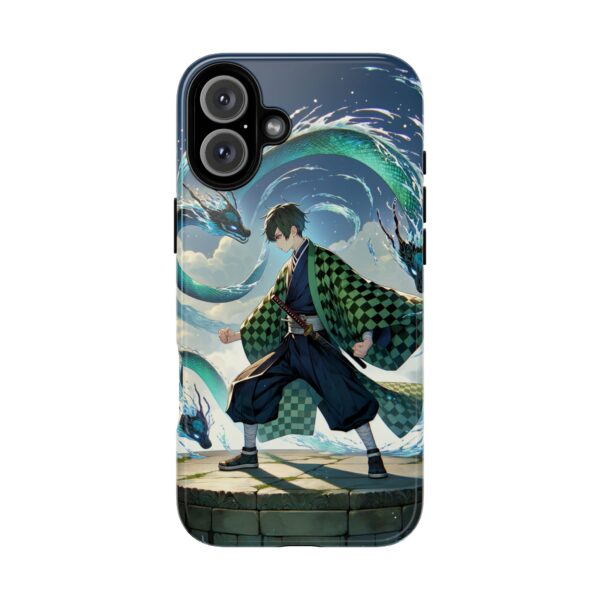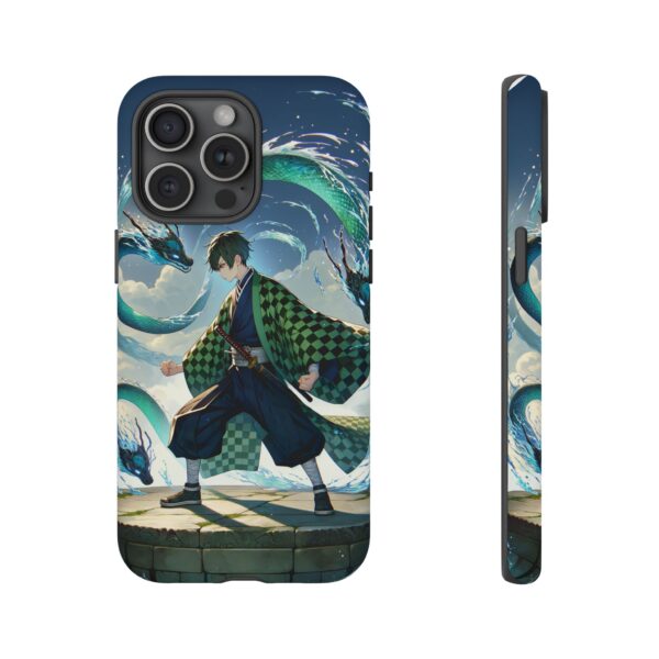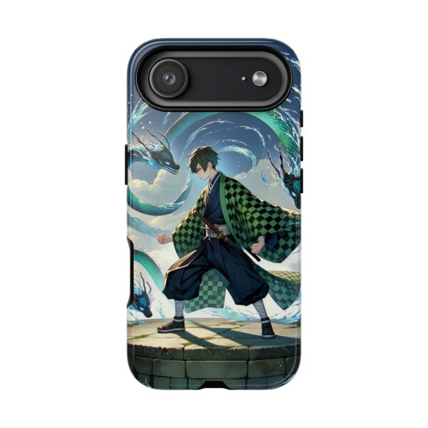 A youthful male figure wears a distinctive checkered haori in green and black, standing on a stone platform in a martial art stance while performing a mystical ritual tied to the element of water. Around him, water dragons unfurl from the motion of his blade, circling and extending to the image edges in a panoramic composition that conveys a powerful water breathing technique. This design is translated into a refined and expressive phone case that balances protection and aesthetics. It reads as a statement piece that elevates everyday carry with quiet confidence and considered detail.