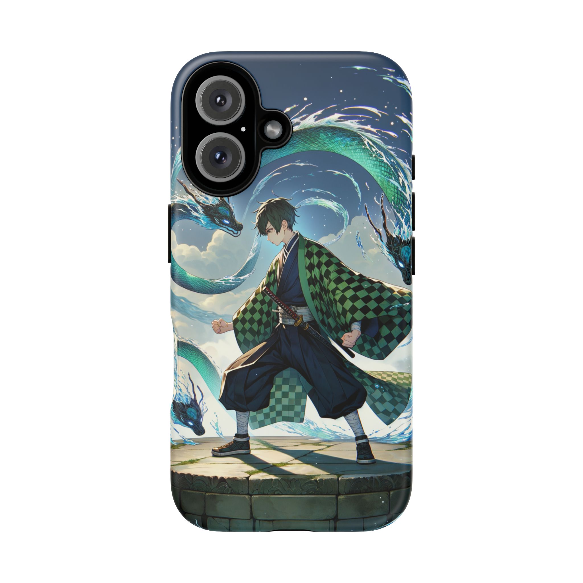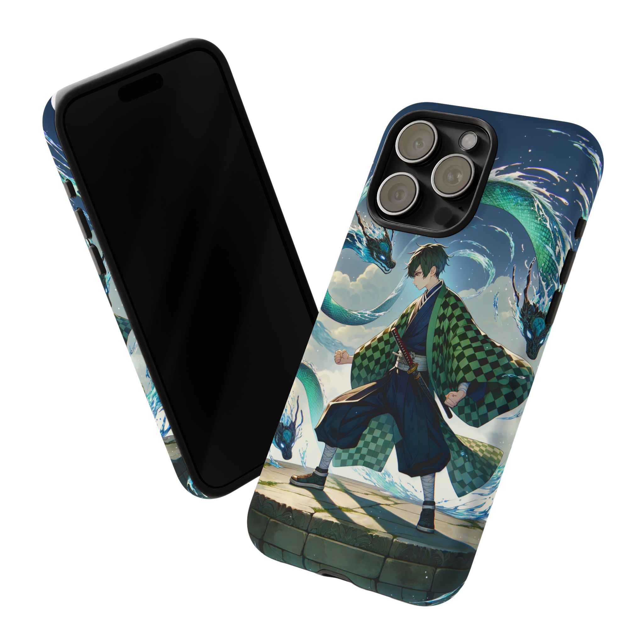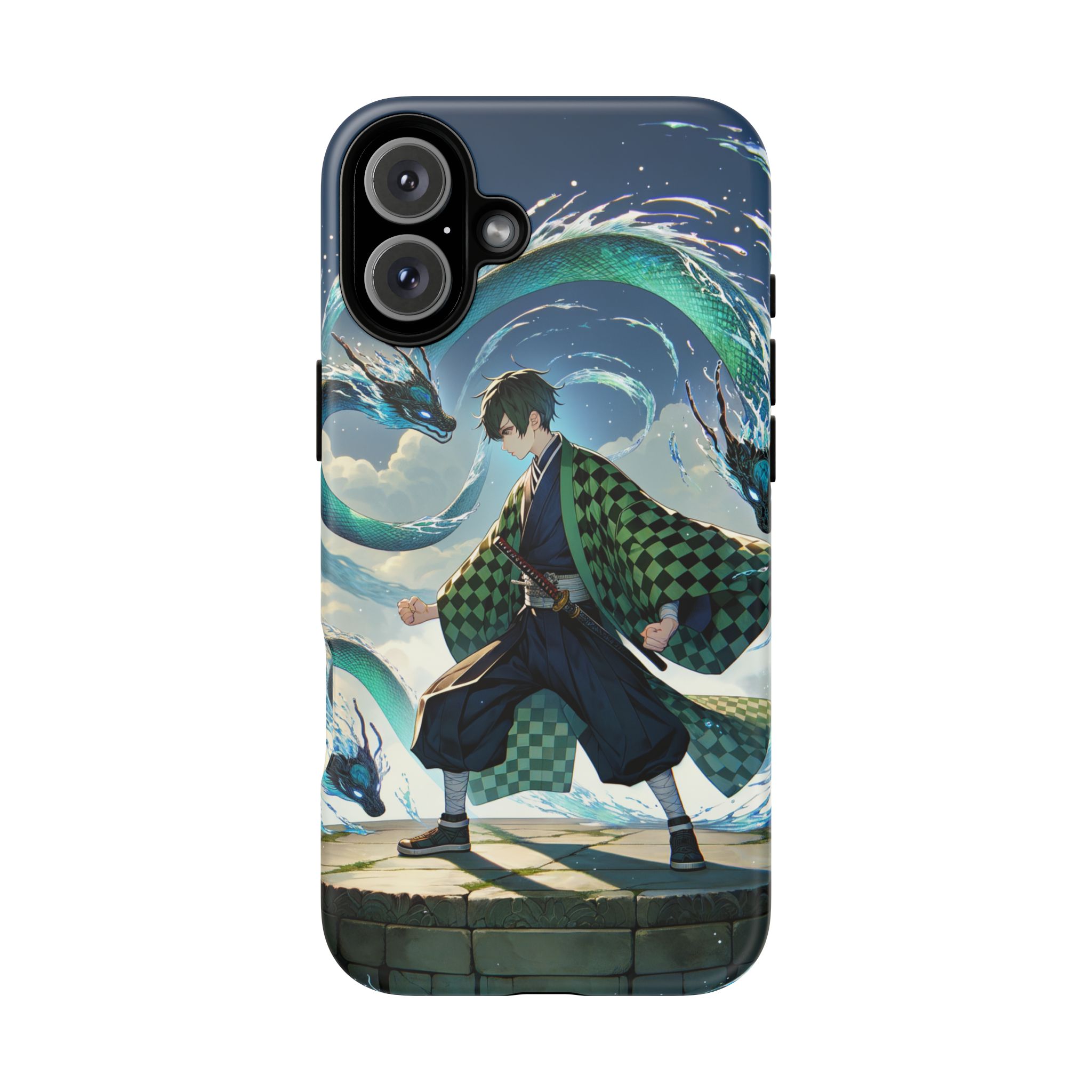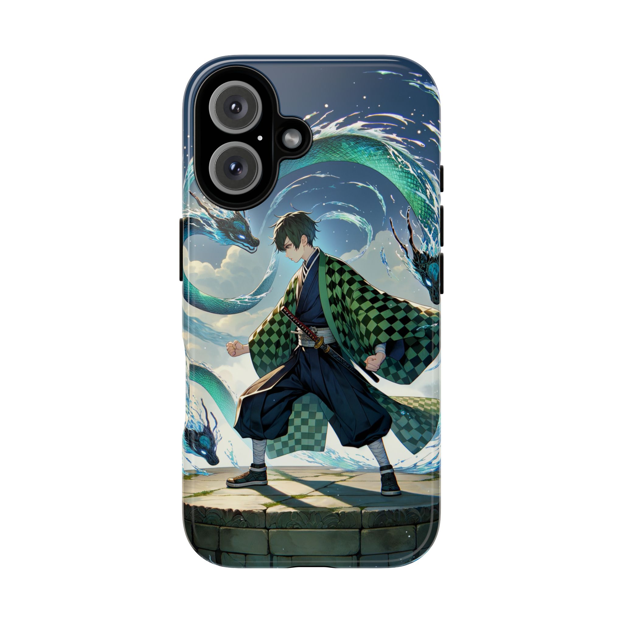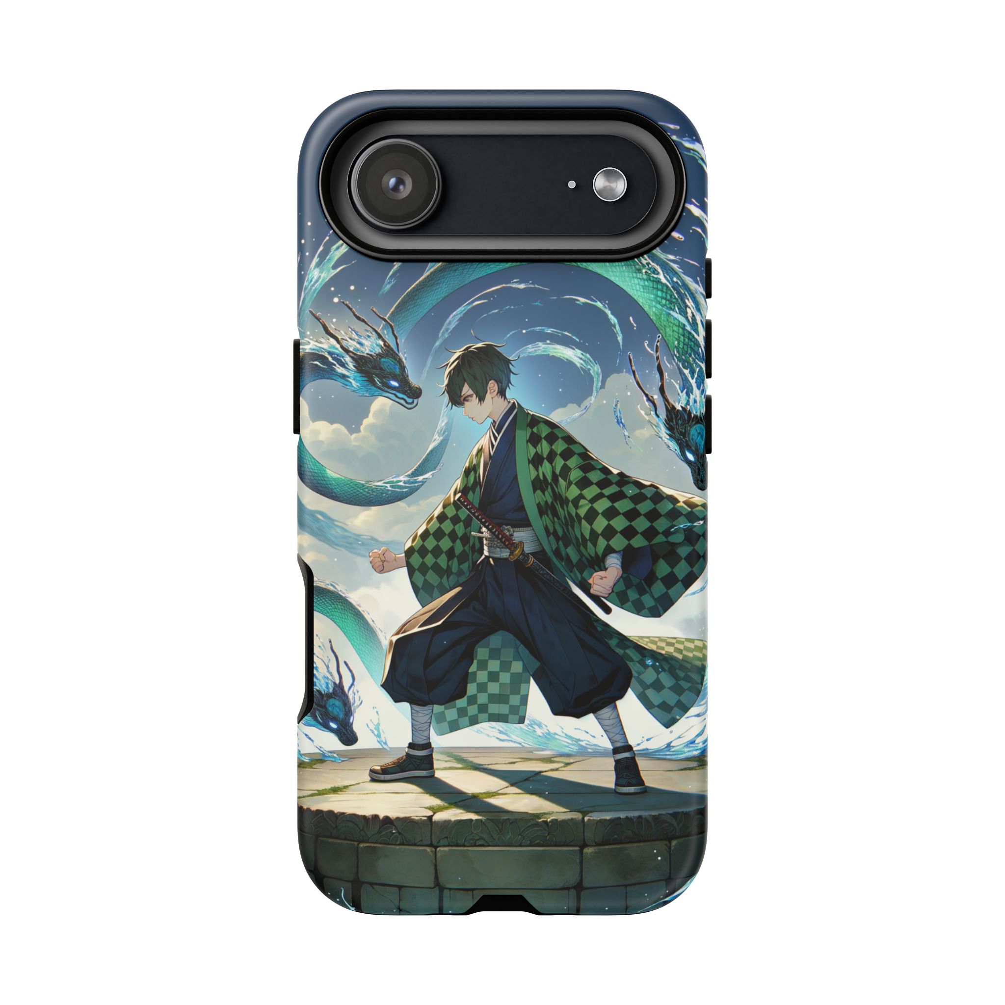 A youthful male figure wears a distinctive checkered haori in green and black, standing on a stone platform in a martial art stance while performing a mystical ritual tied to the element of water. Around him, water dragons unfurl from the motion of his blade, circling and extending to the image edges in a panoramic composition that conveys a powerful water breathing technique. This design is translated into a refined and expressive phone case that balances protection and aesthetics. It reads as a statement piece that elevates everyday carry with quiet confidence and considered detail.