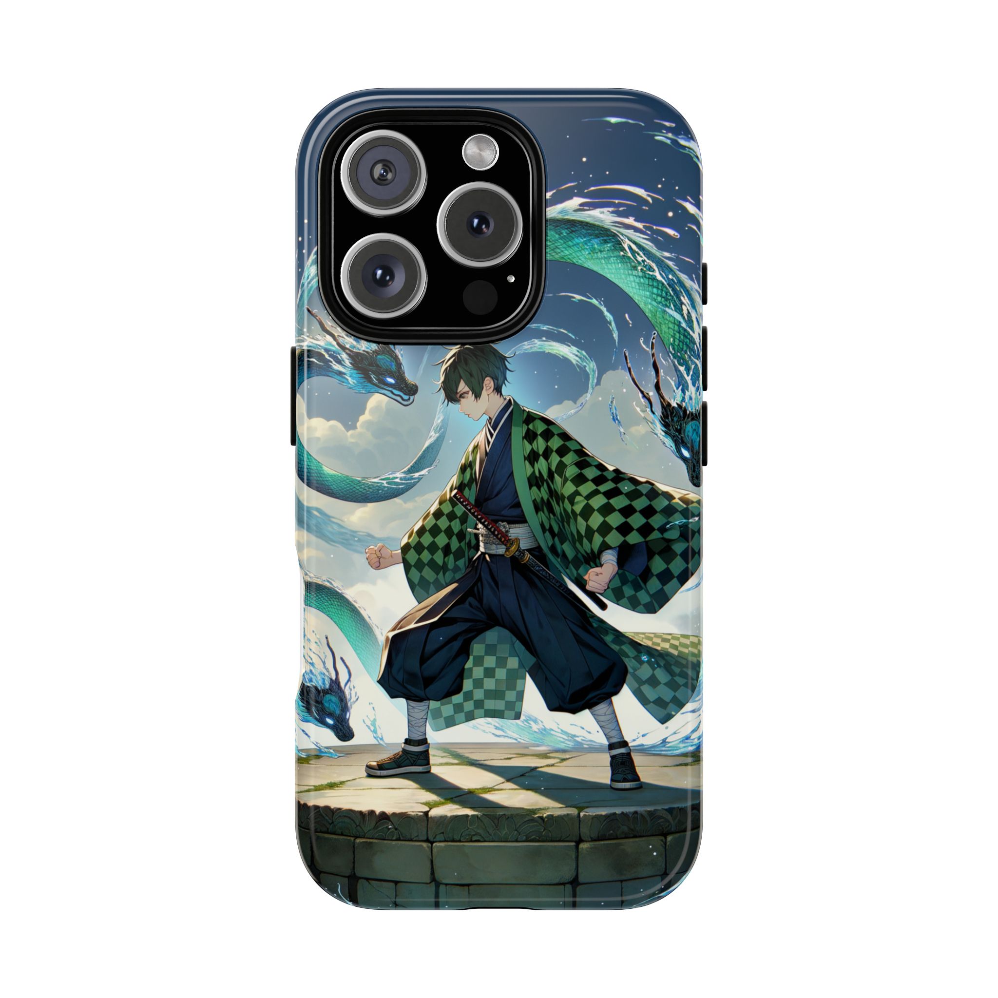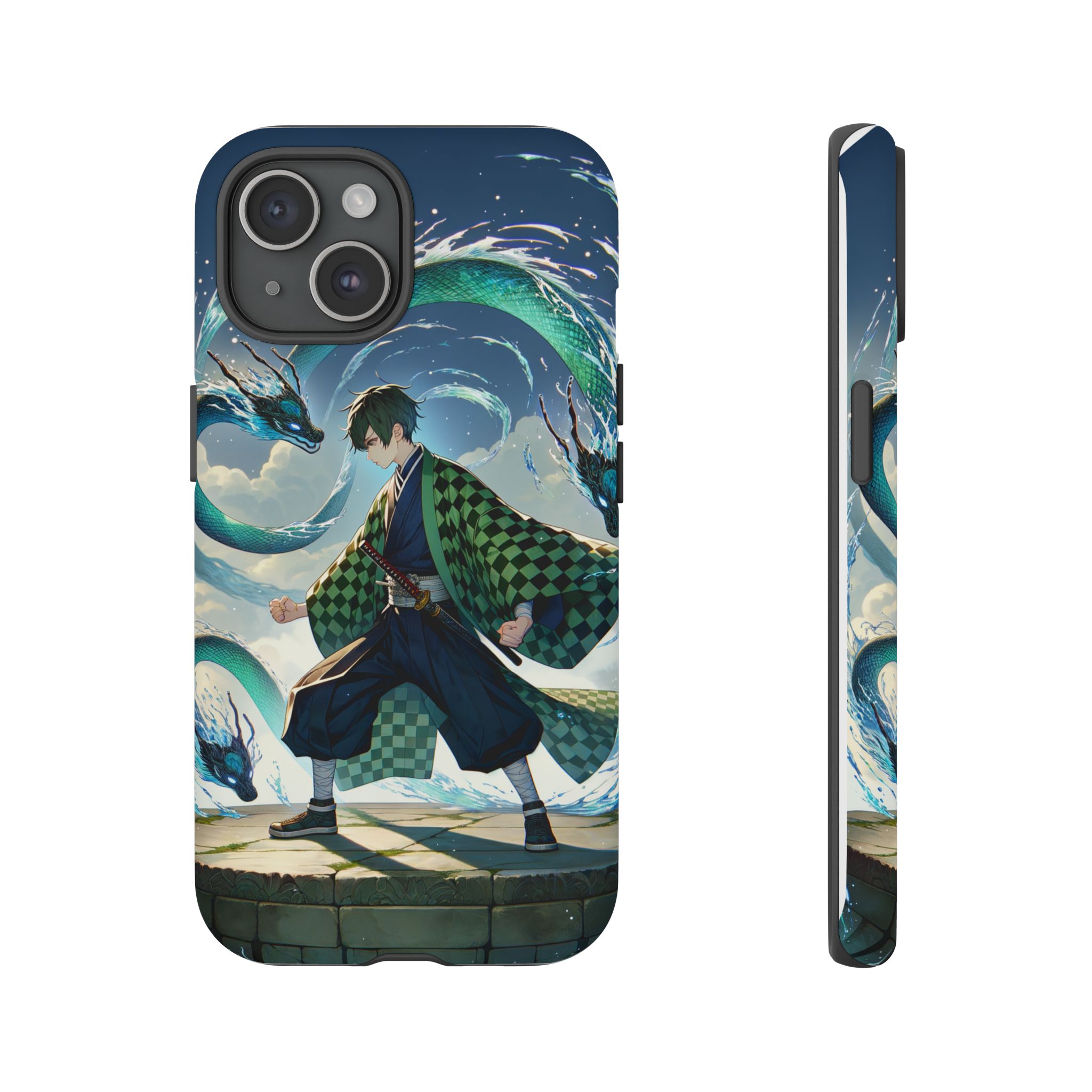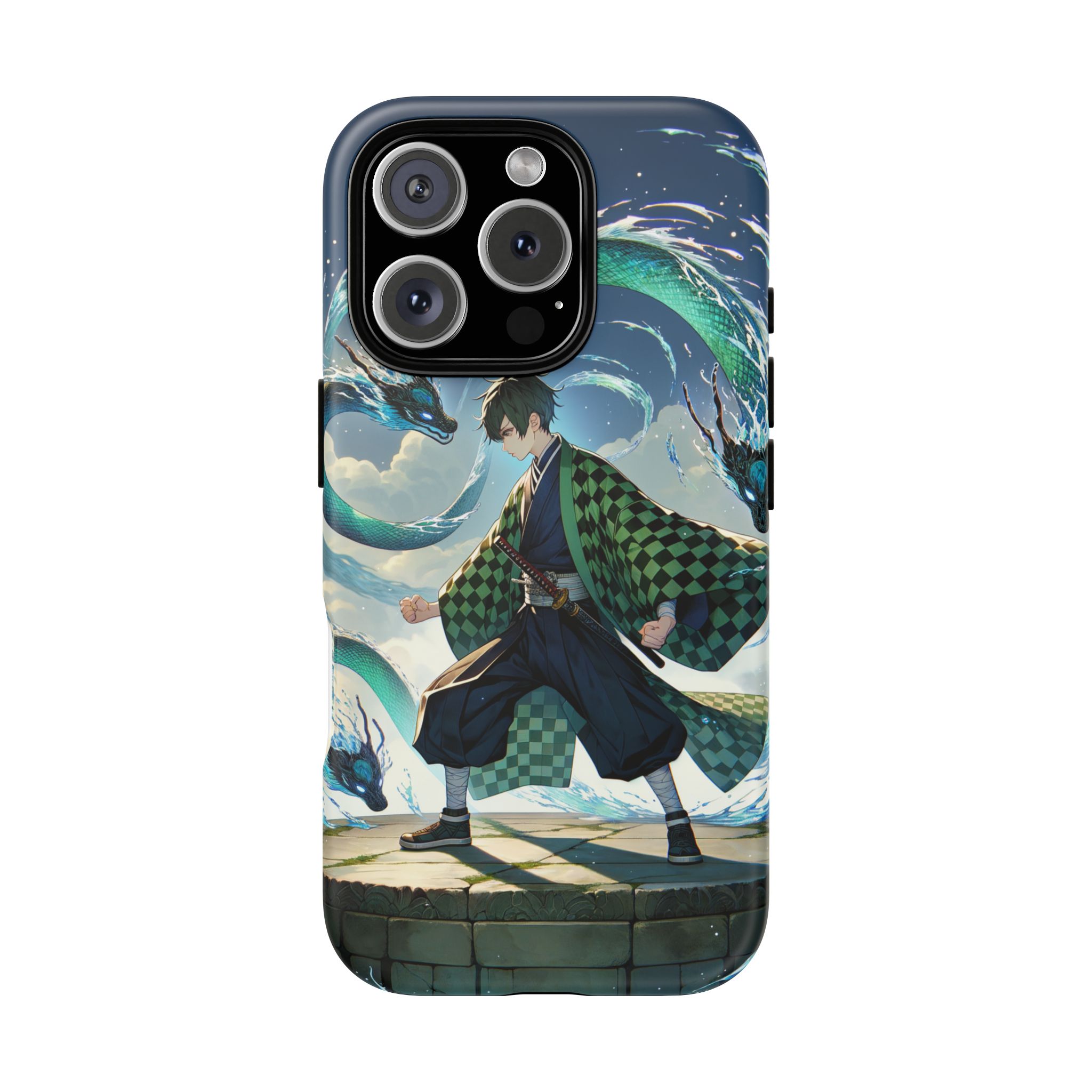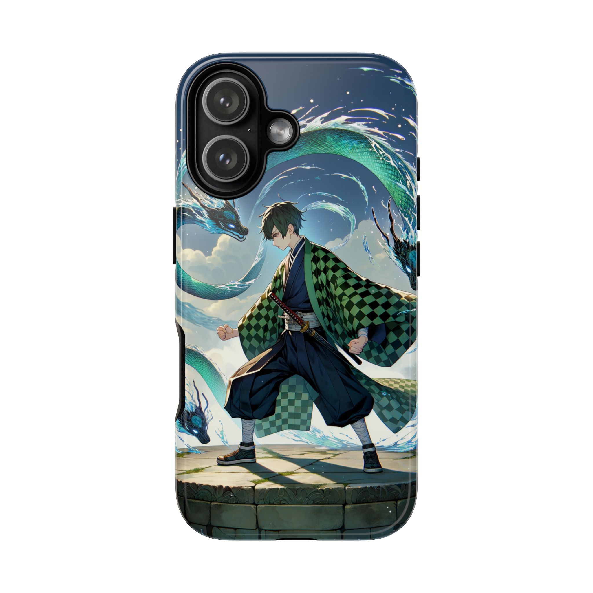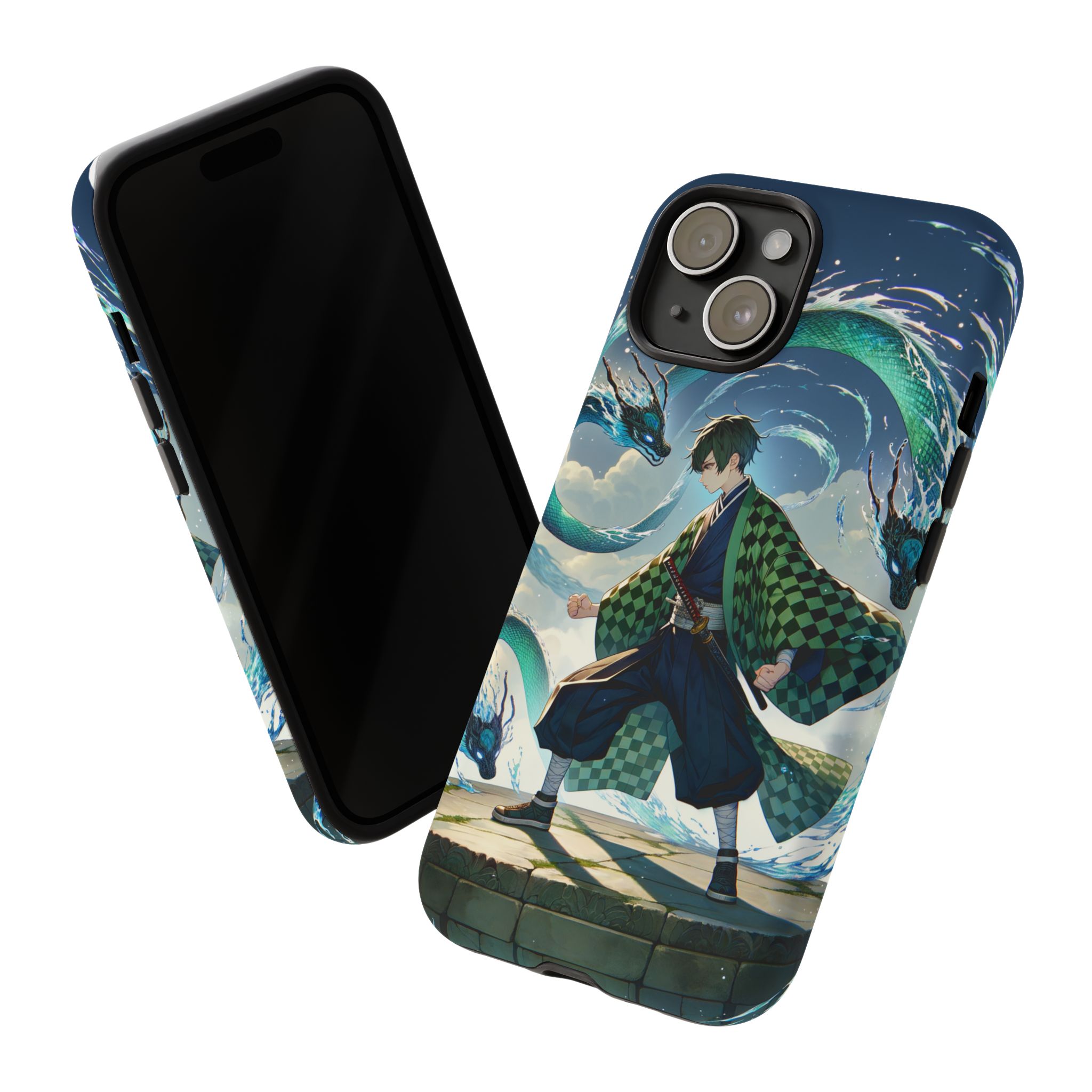 A youthful male figure wears a distinctive checkered haori in green and black, standing on a stone platform in a martial art stance while performing a mystical ritual tied to the element of water. Around him, water dragons unfurl from the motion of his blade, circling and extending to the image edges in a panoramic composition that conveys a powerful water breathing technique. This design is translated into a refined and expressive phone case that balances protection and aesthetics. It reads as a statement piece that elevates everyday carry with quiet confidence and considered detail.