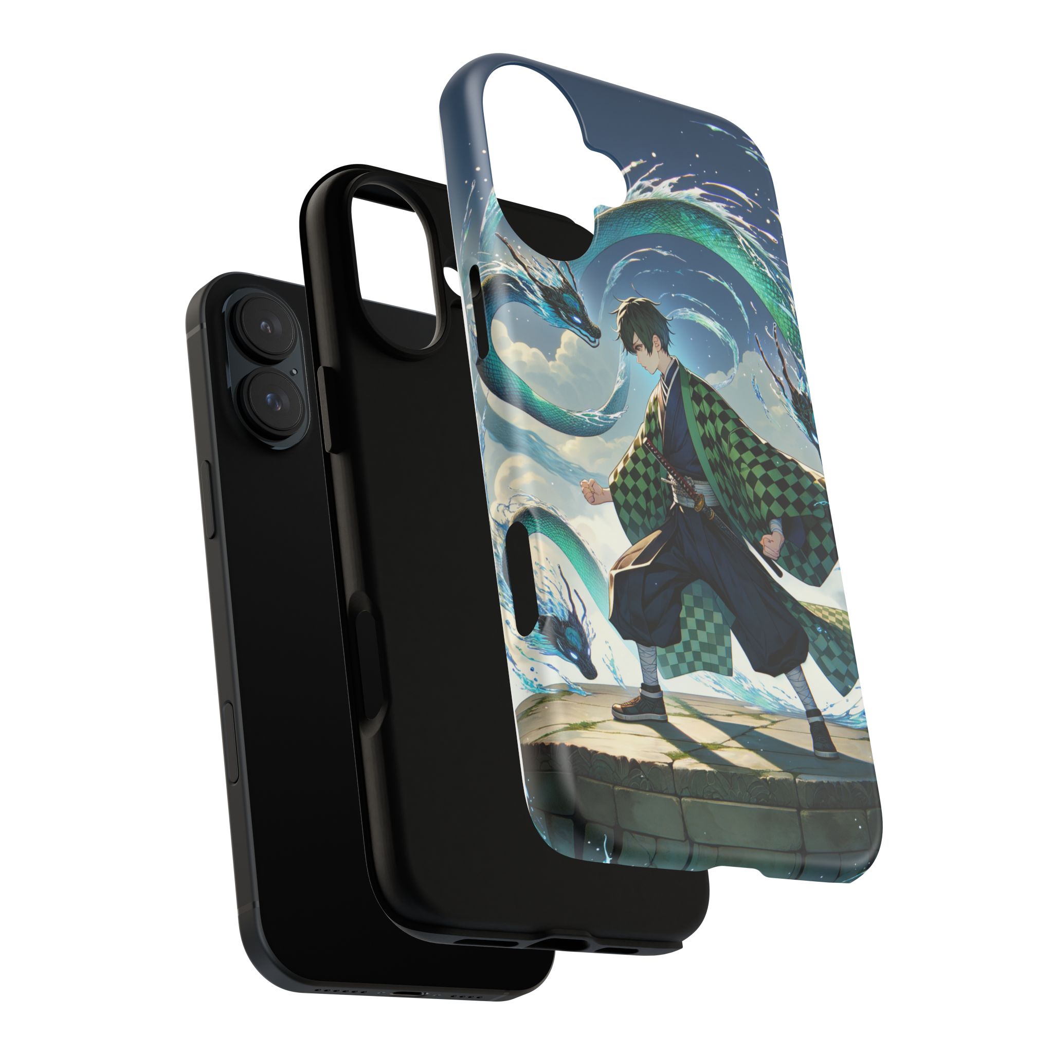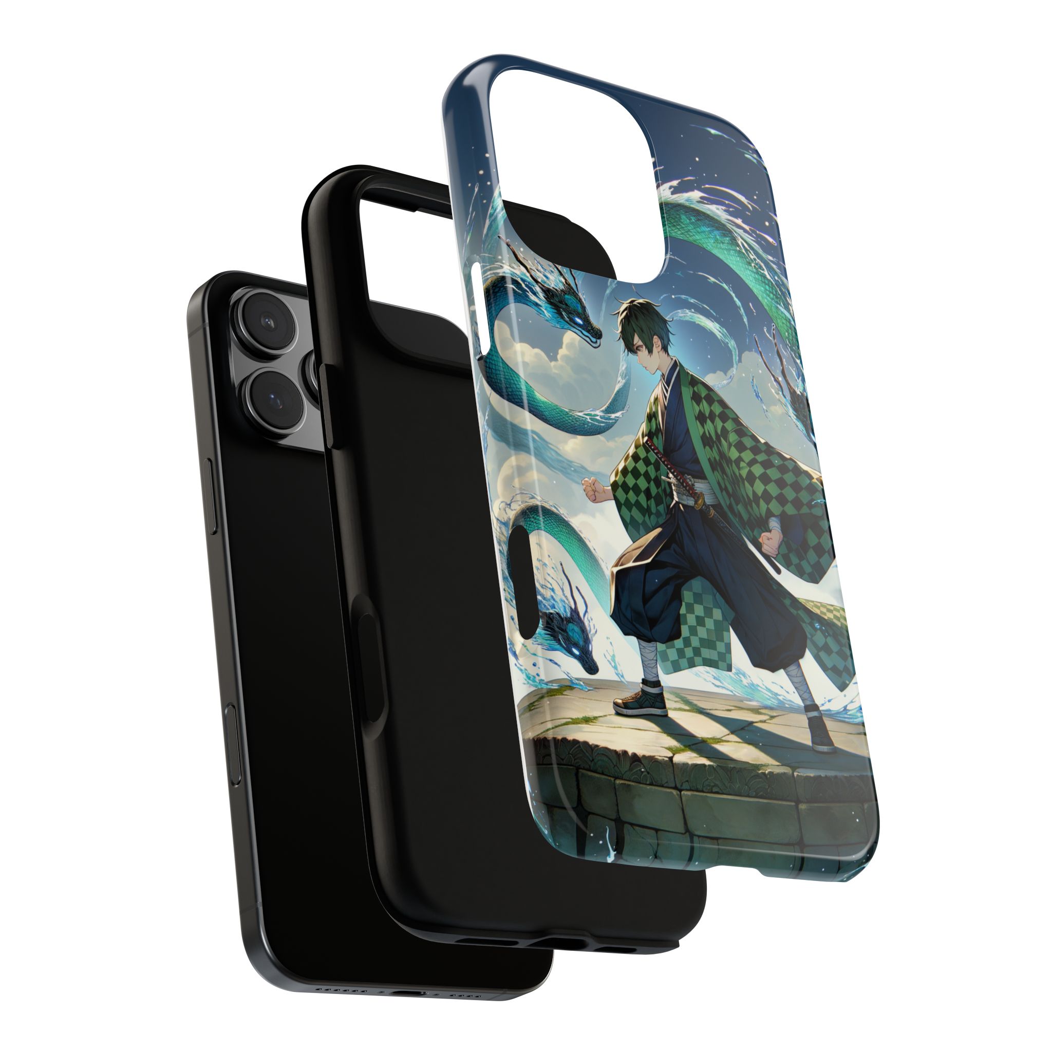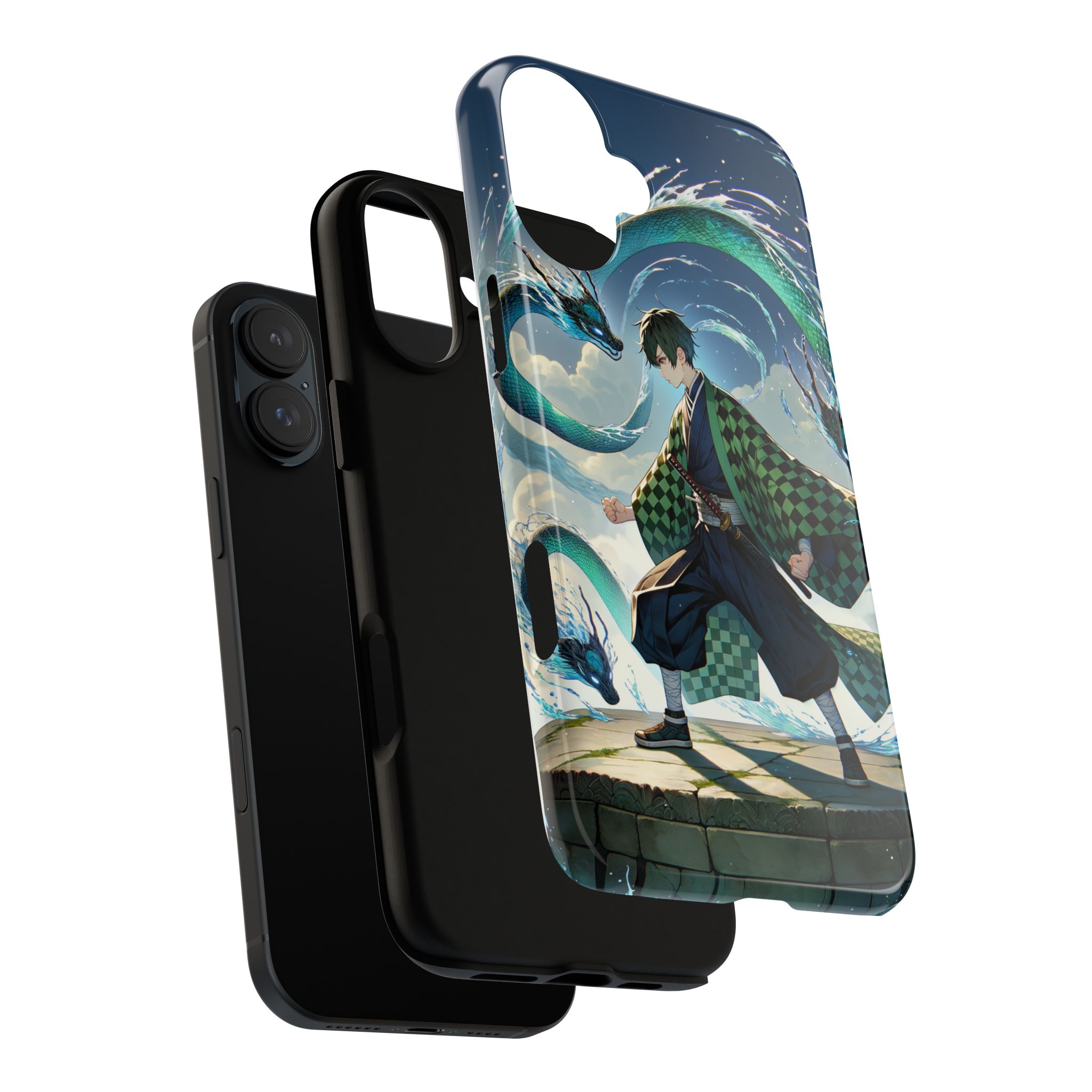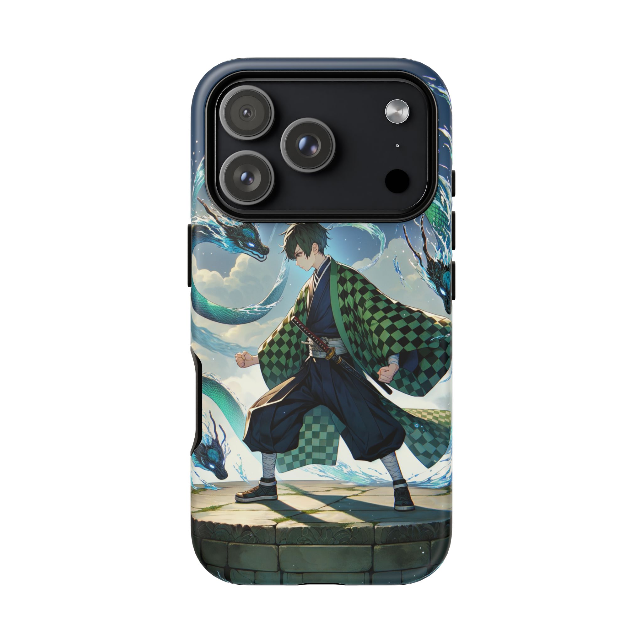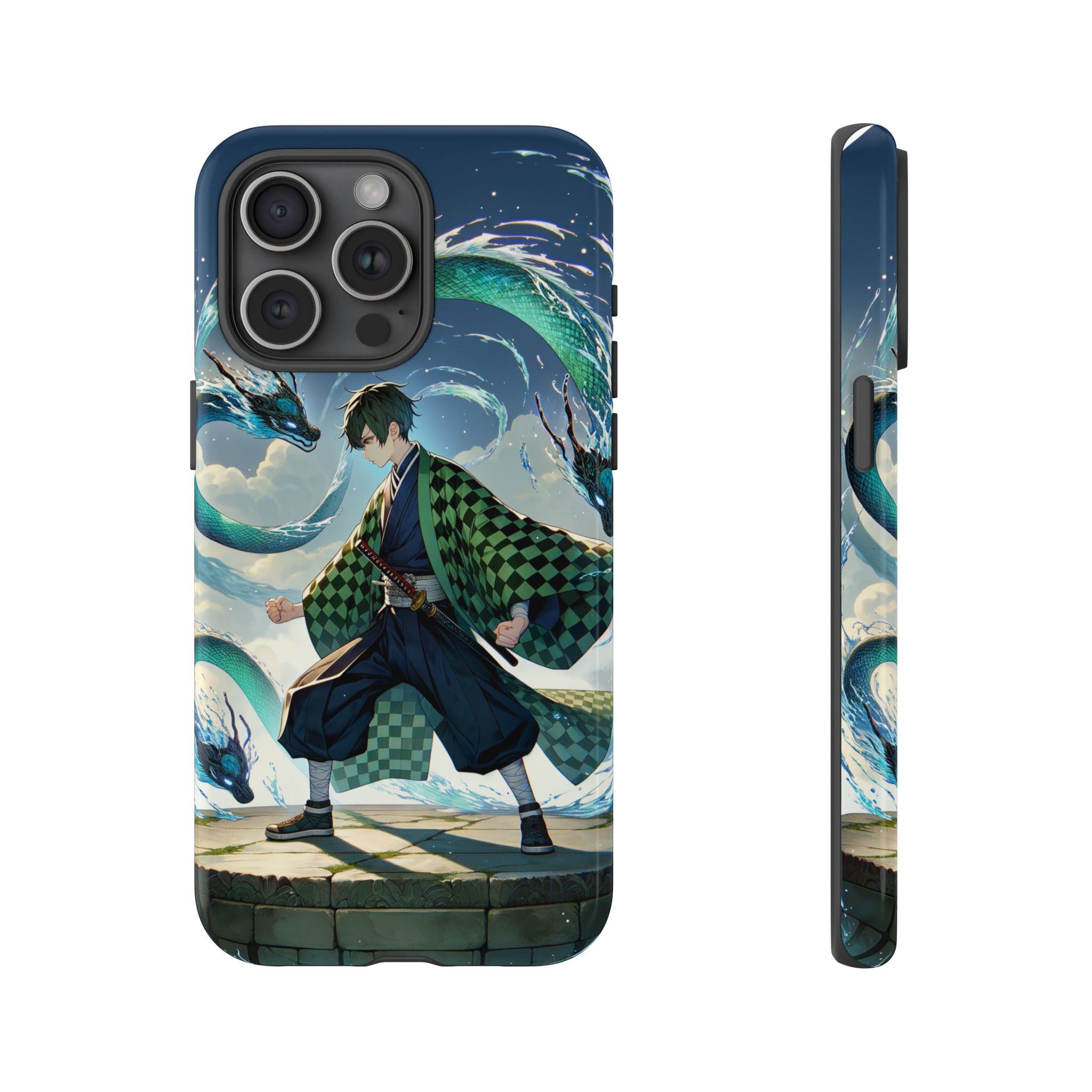 A youthful male figure wears a distinctive checkered haori in green and black, standing on a stone platform in a martial art stance while performing a mystical ritual tied to the element of water. Around him, water dragons unfurl from the motion of his blade, circling and extending to the image edges in a panoramic composition that conveys a powerful water breathing technique. This design is translated into a refined and expressive phone case that balances protection and aesthetics. It reads as a statement piece that elevates everyday carry with quiet confidence and considered detail.