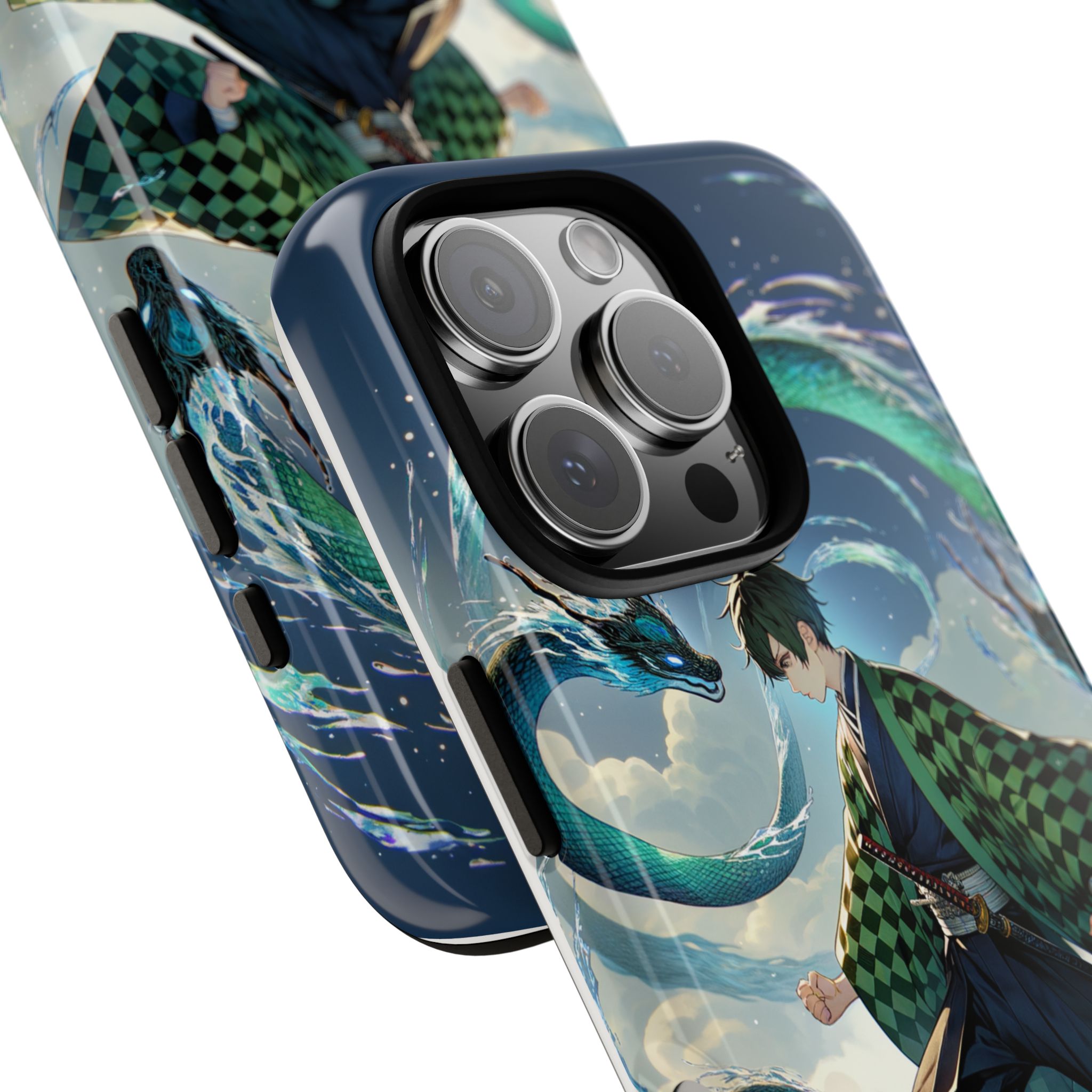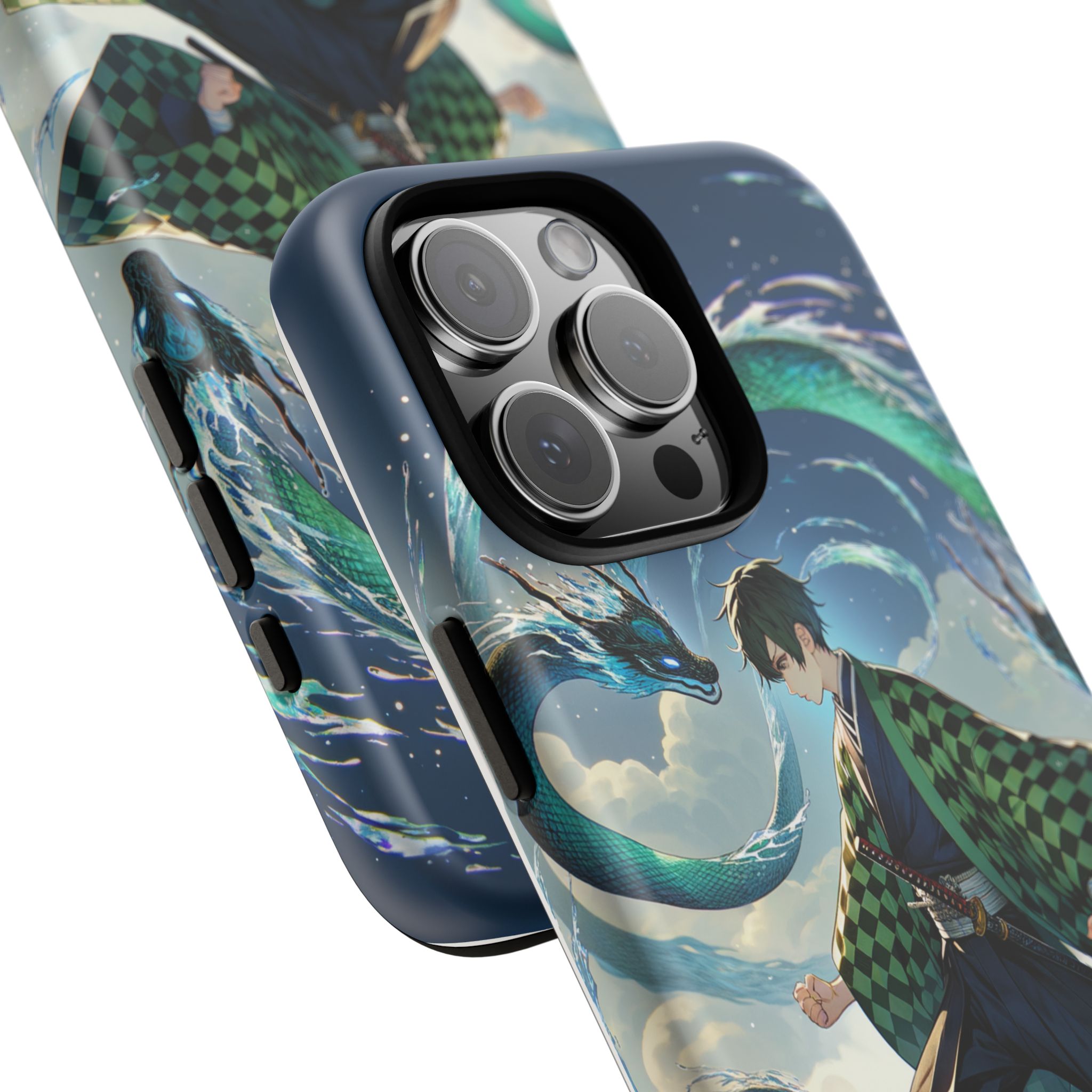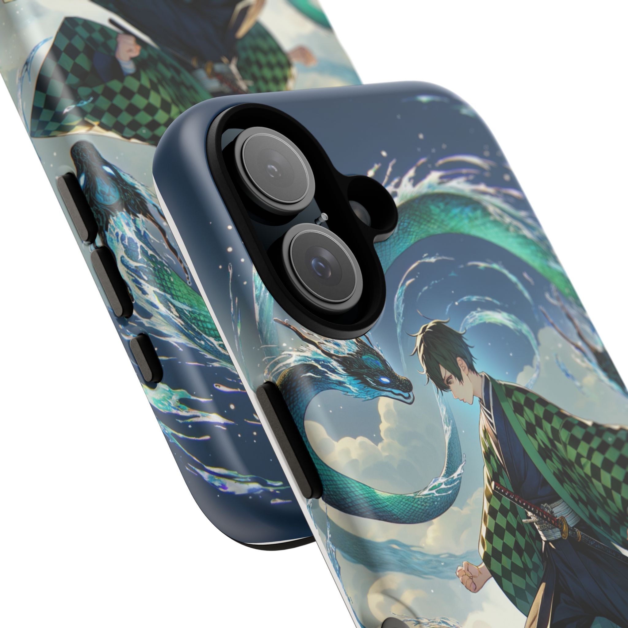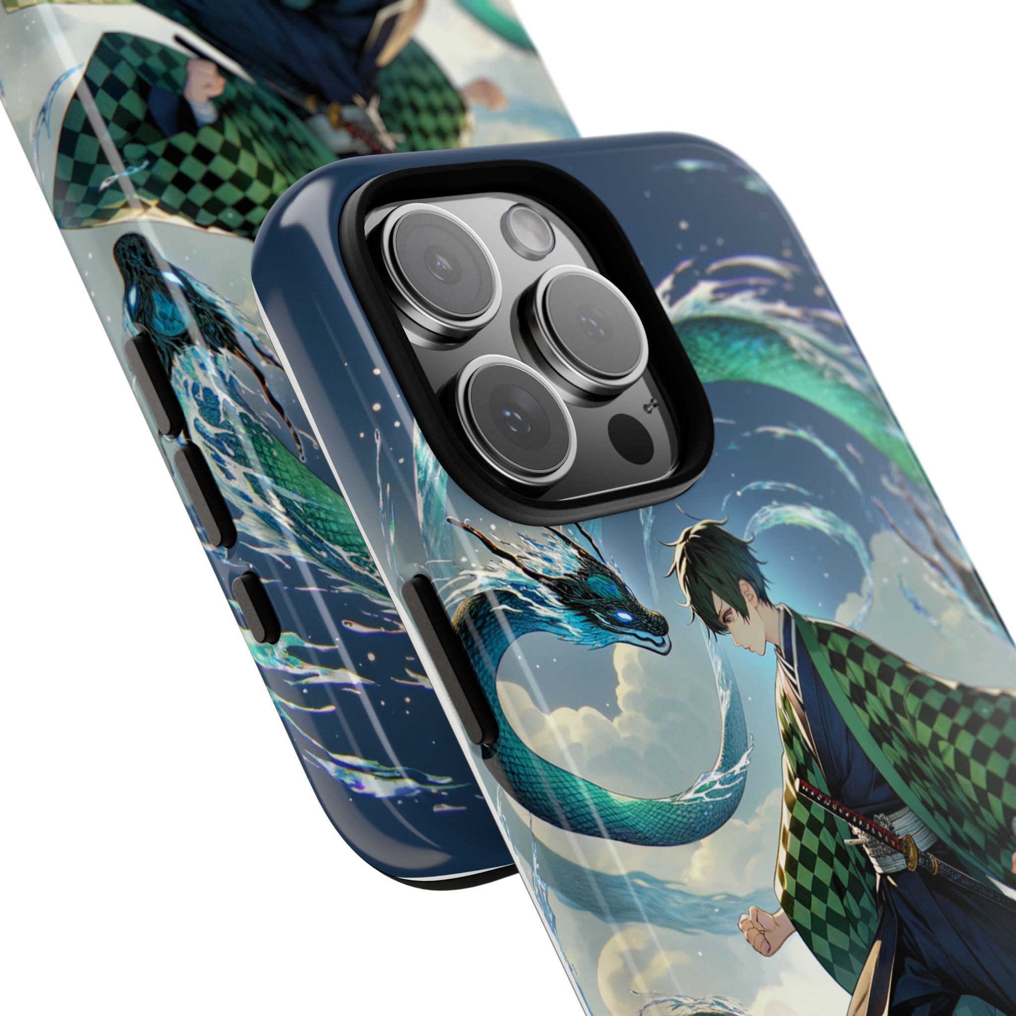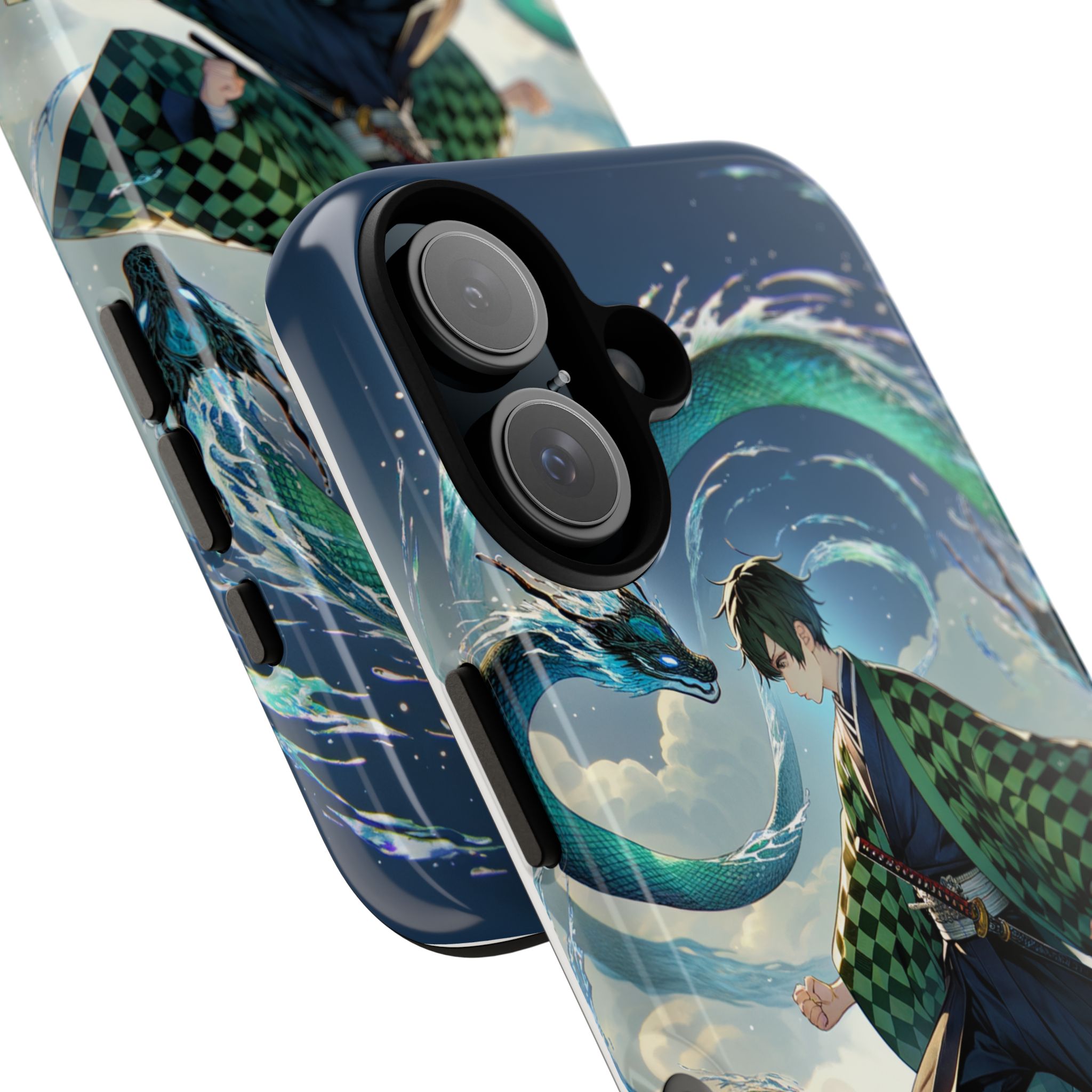 A youthful male figure wears a distinctive checkered haori in green and black, standing on a stone platform in a martial art stance while performing a mystical ritual tied to the element of water. Around him, water dragons unfurl from the motion of his blade, circling and extending to the image edges in a panoramic composition that conveys a powerful water breathing technique. This design is translated into a refined and expressive phone case that balances protection and aesthetics. It reads as a statement piece that elevates everyday carry with quiet confidence and considered detail.