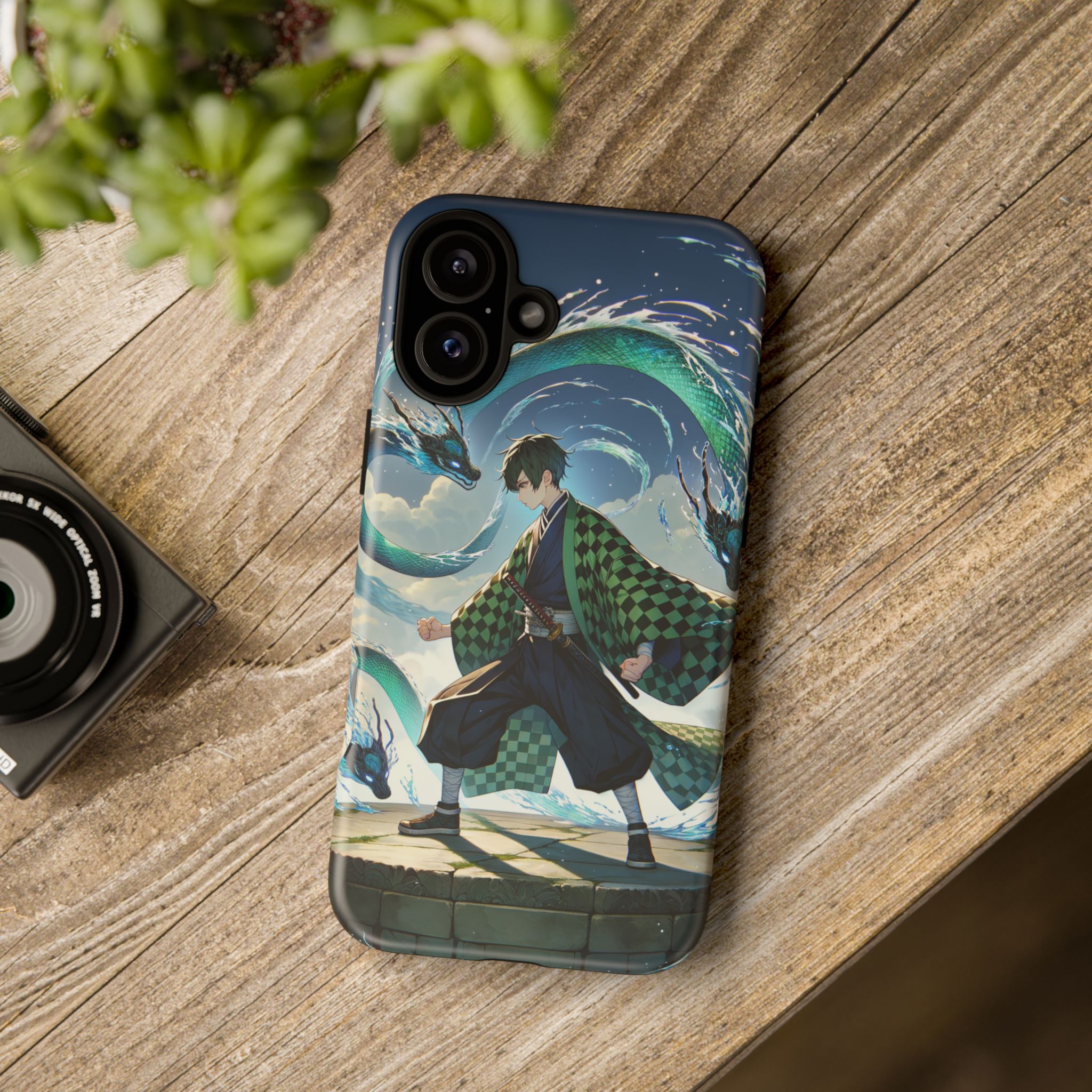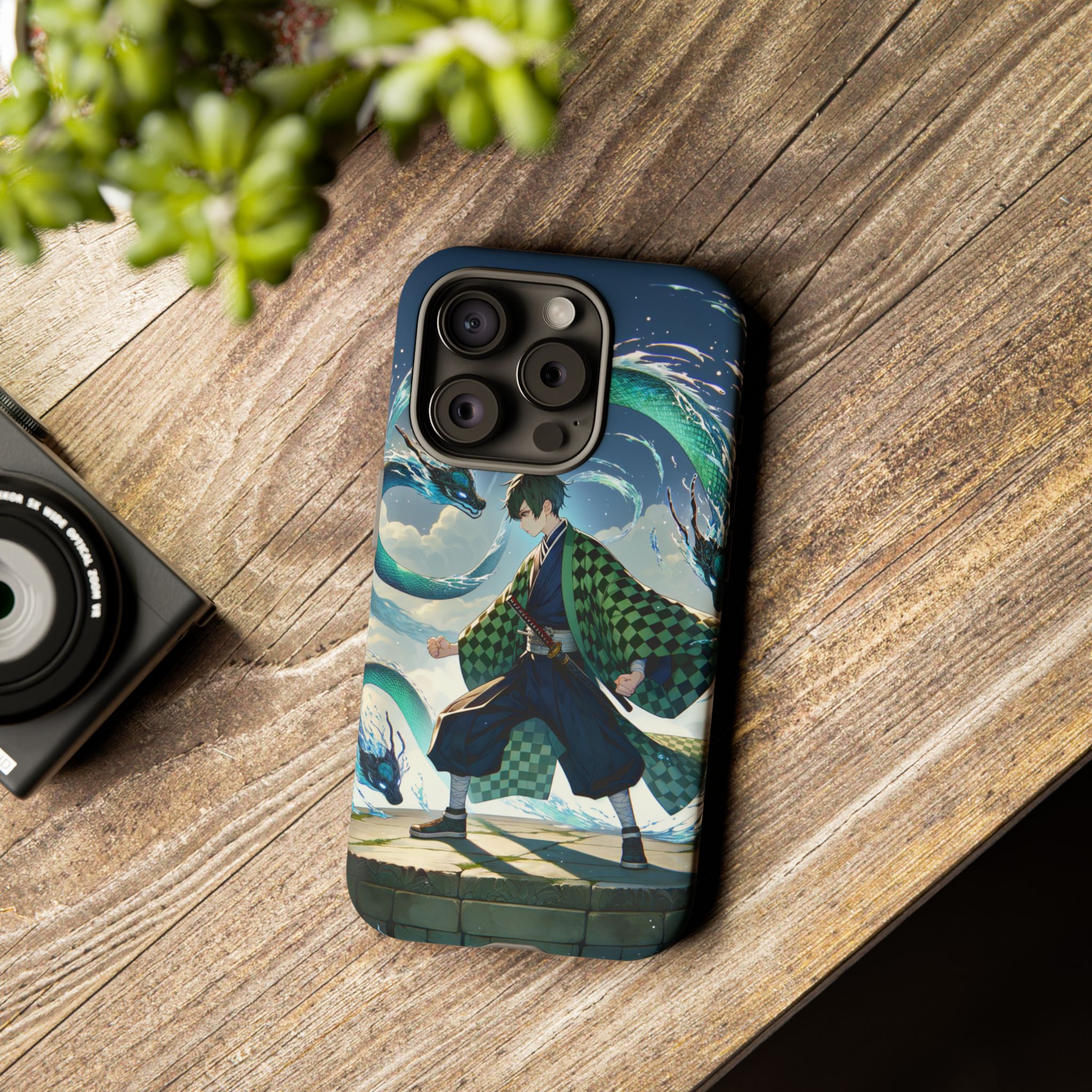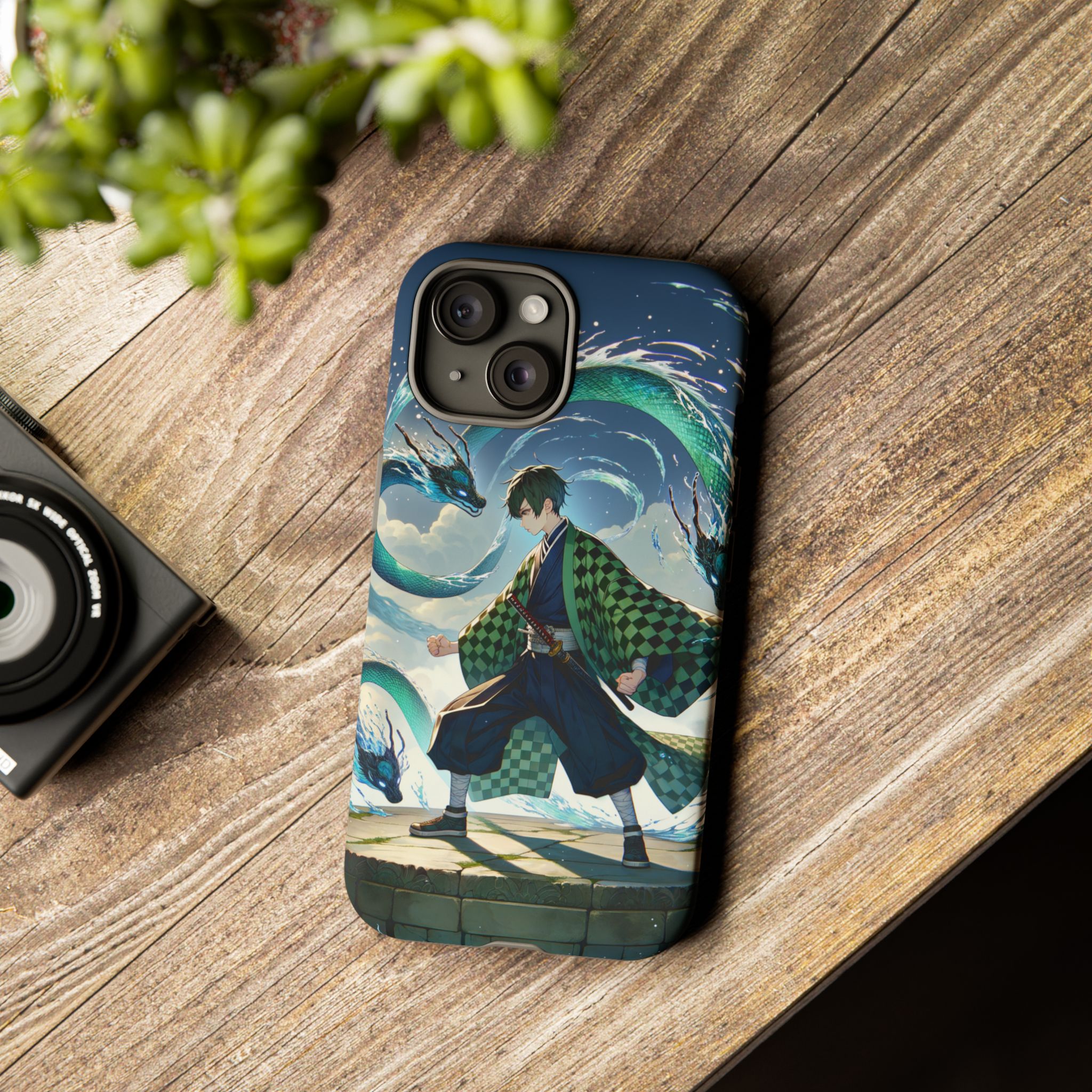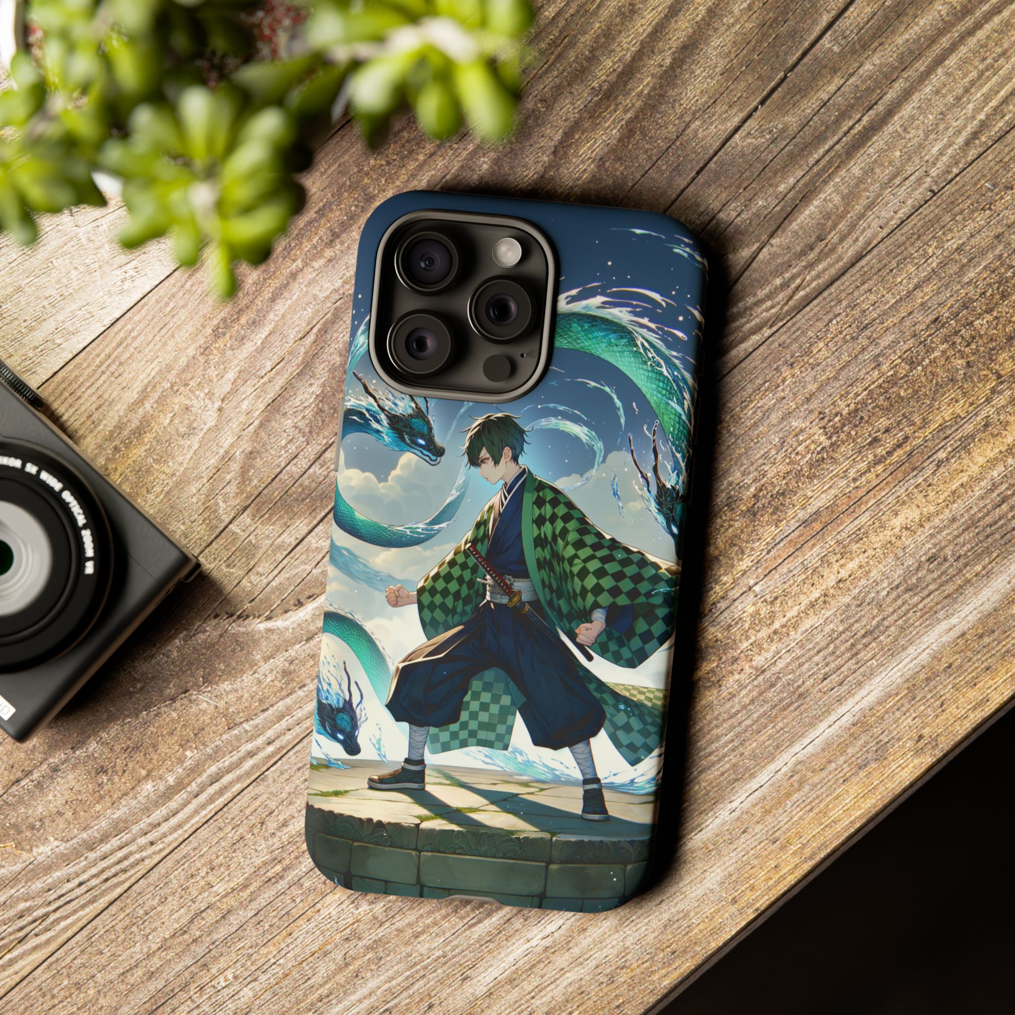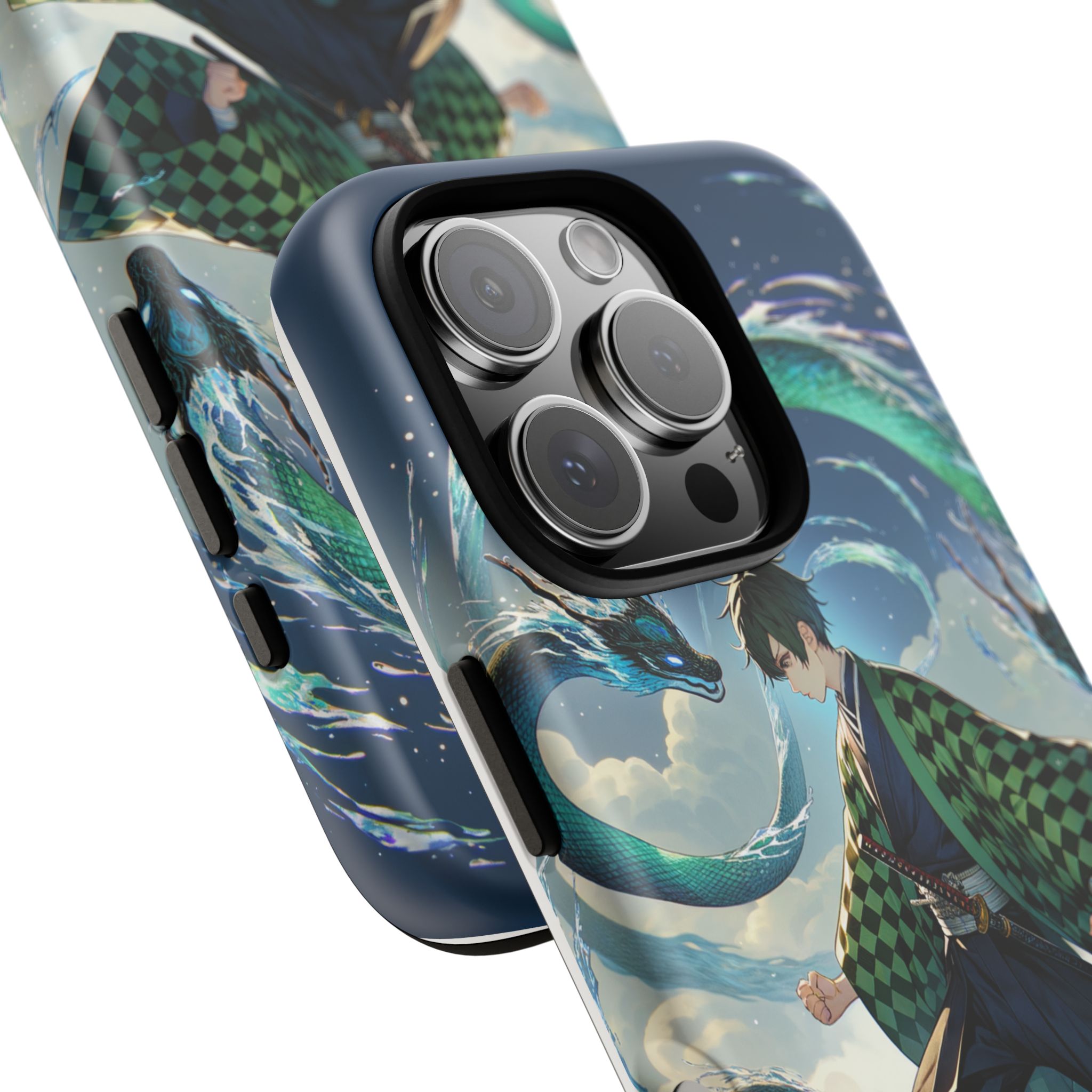 A youthful male figure wears a distinctive checkered haori in green and black, standing on a stone platform in a martial art stance while performing a mystical ritual tied to the element of water. Around him, water dragons unfurl from the motion of his blade, circling and extending to the image edges in a panoramic composition that conveys a powerful water breathing technique. This design is translated into a refined and expressive phone case that balances protection and aesthetics. It reads as a statement piece that elevates everyday carry with quiet confidence and considered detail.