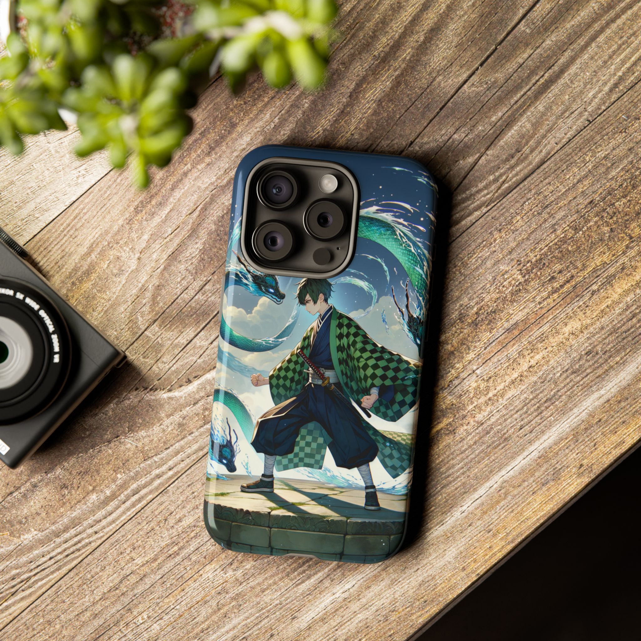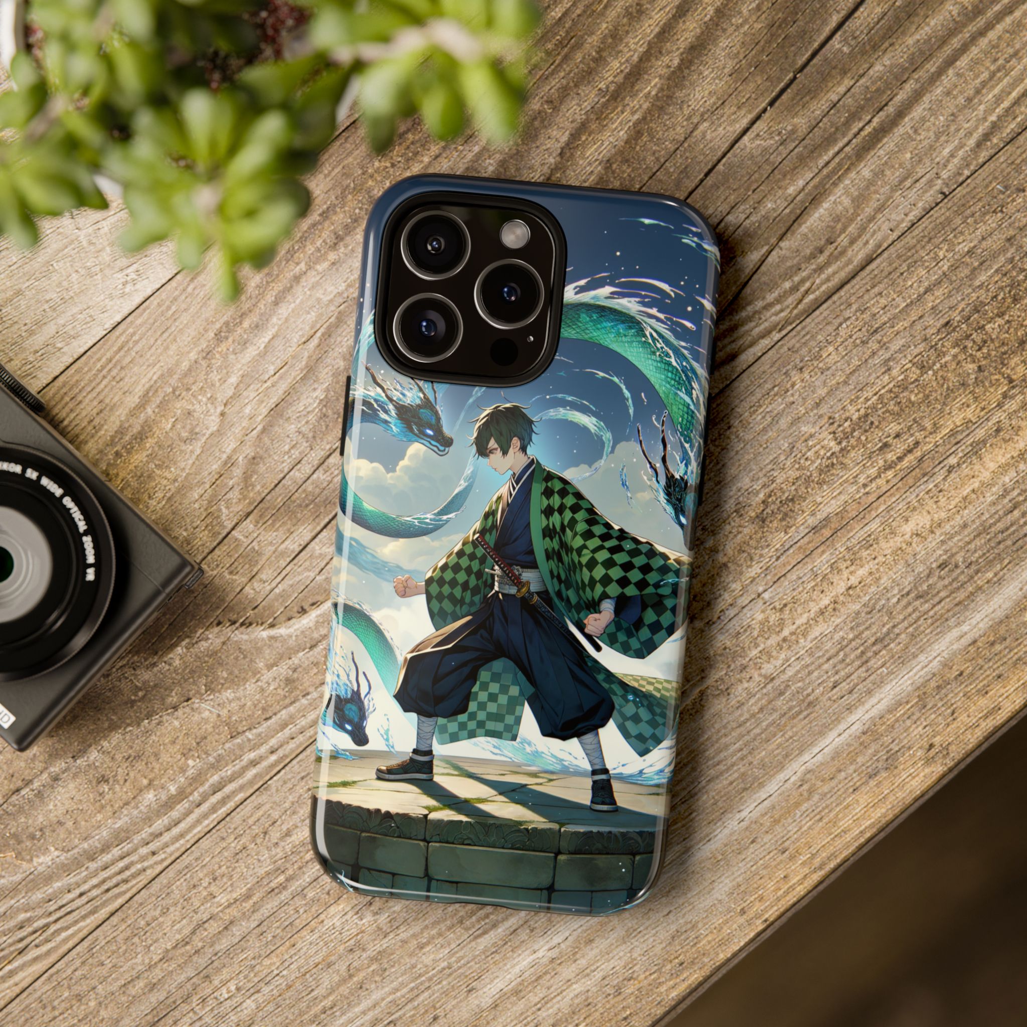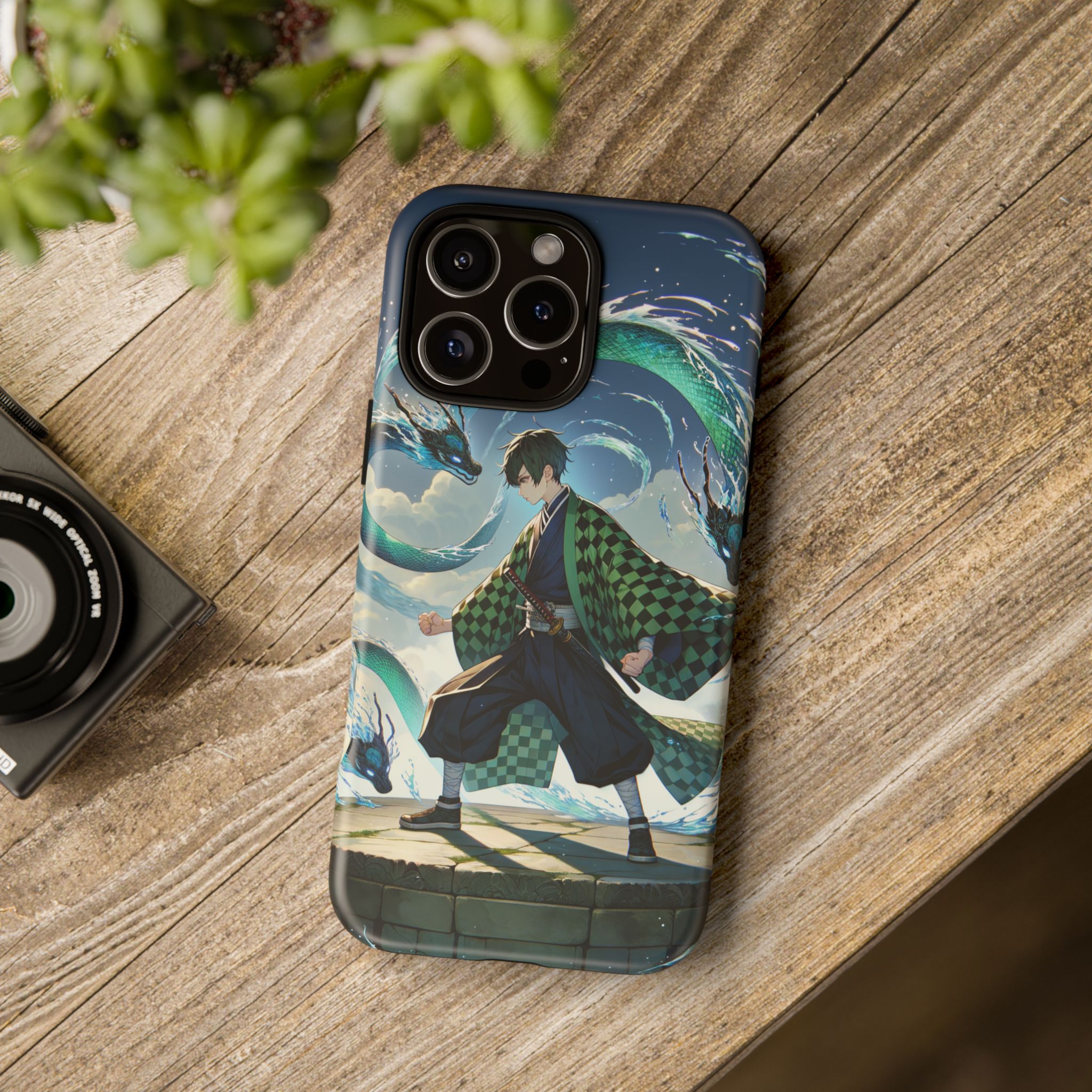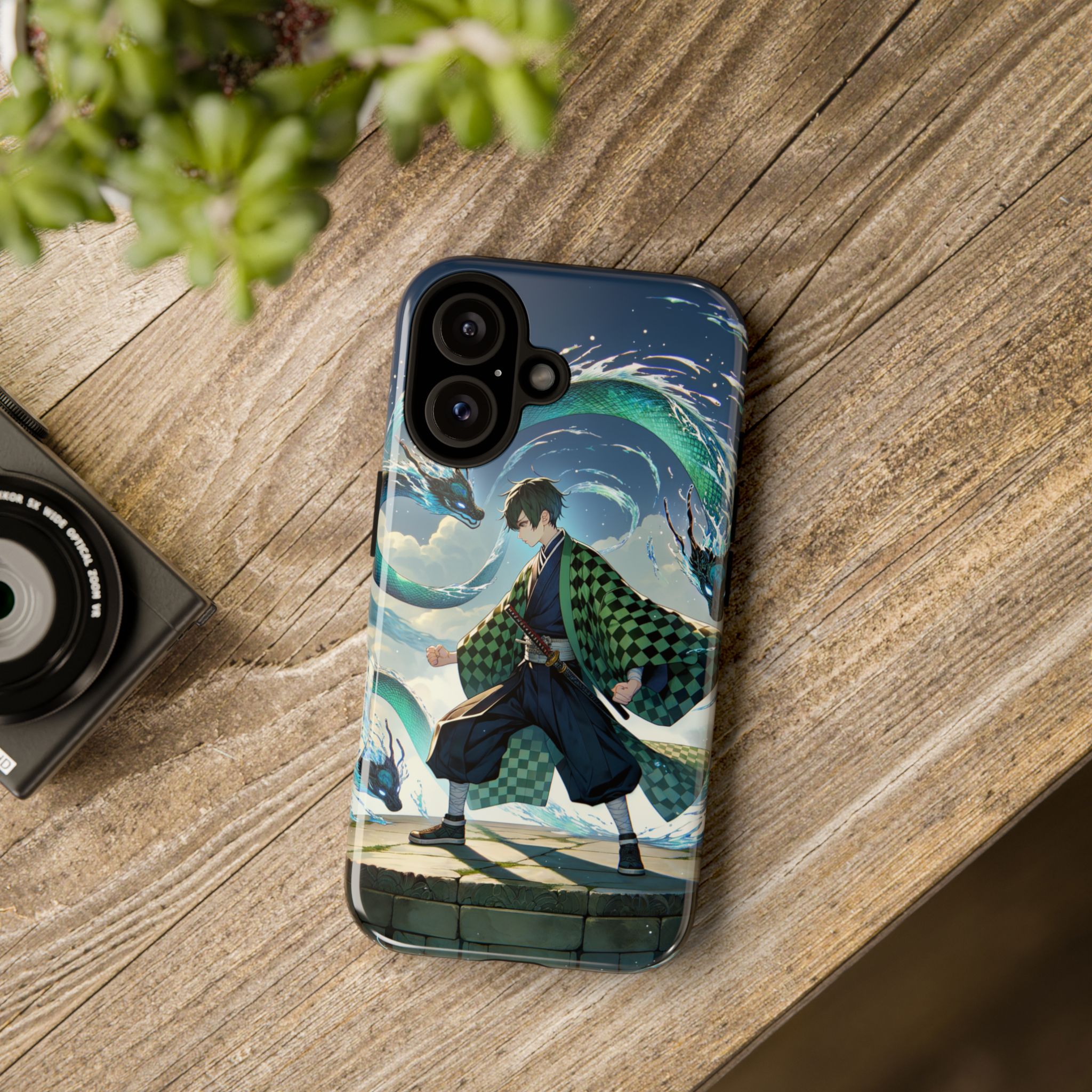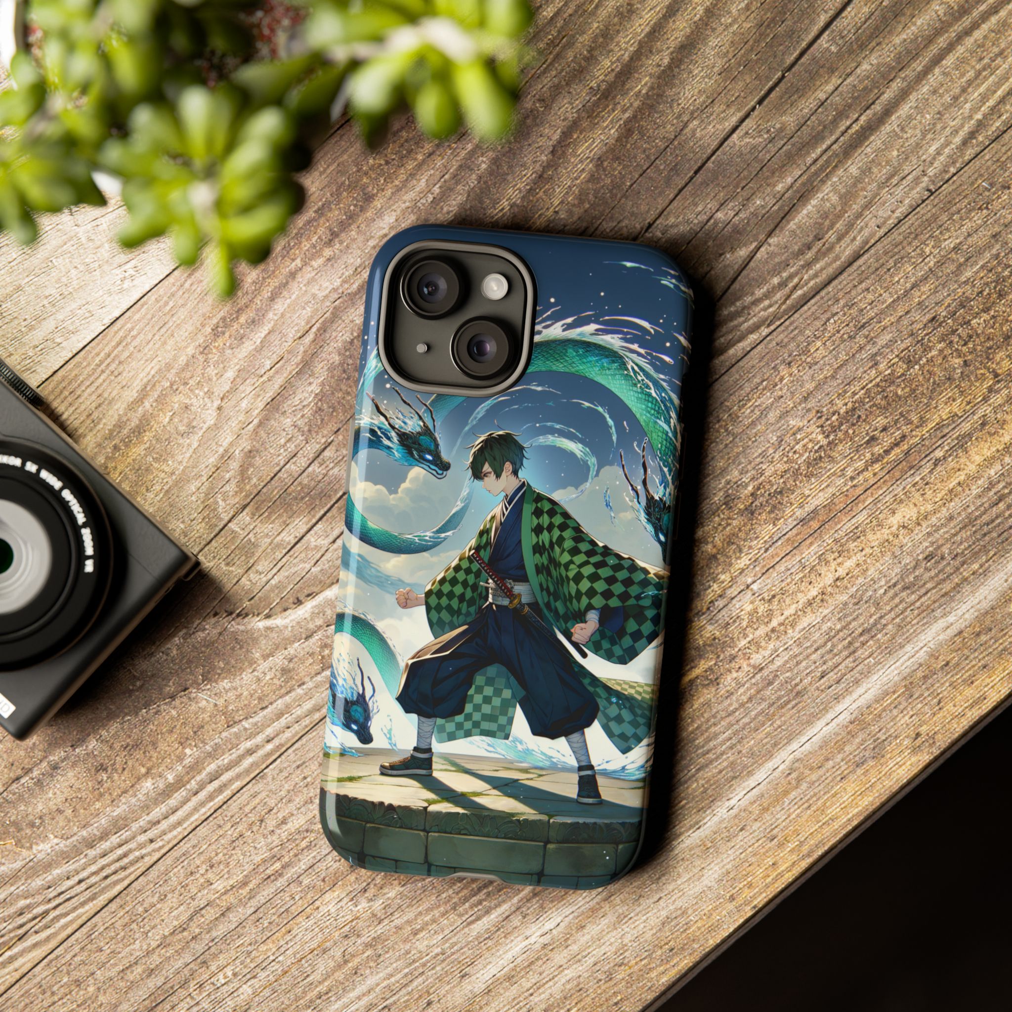 A youthful male figure wears a distinctive checkered haori in green and black, standing on a stone platform in a martial art stance while performing a mystical ritual tied to the element of water. Around him, water dragons unfurl from the motion of his blade, circling and extending to the image edges in a panoramic composition that conveys a powerful water breathing technique. This design is translated into a refined and expressive phone case that balances protection and aesthetics. It reads as a statement piece that elevates everyday carry with quiet confidence and considered detail.