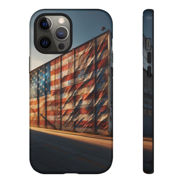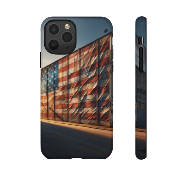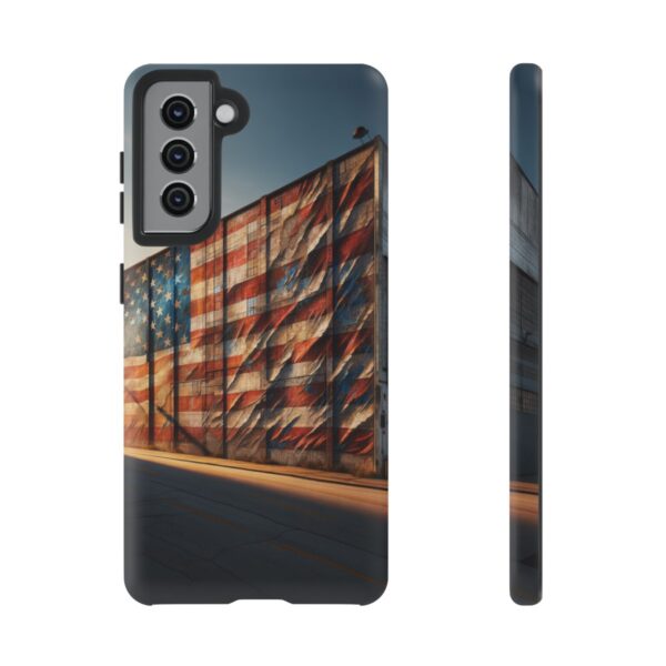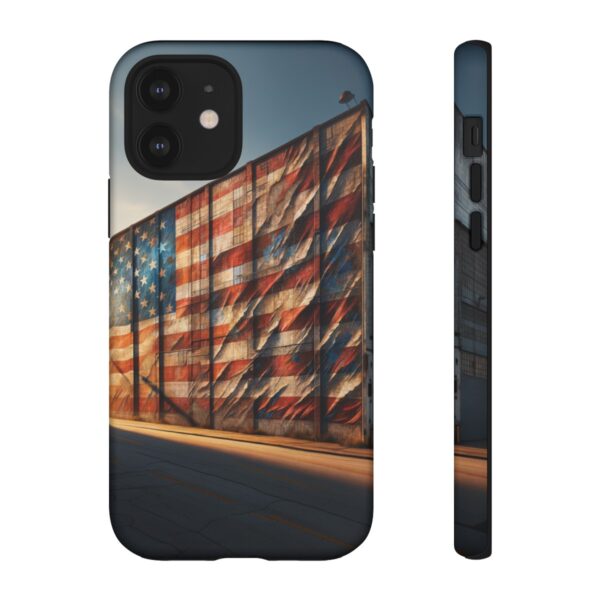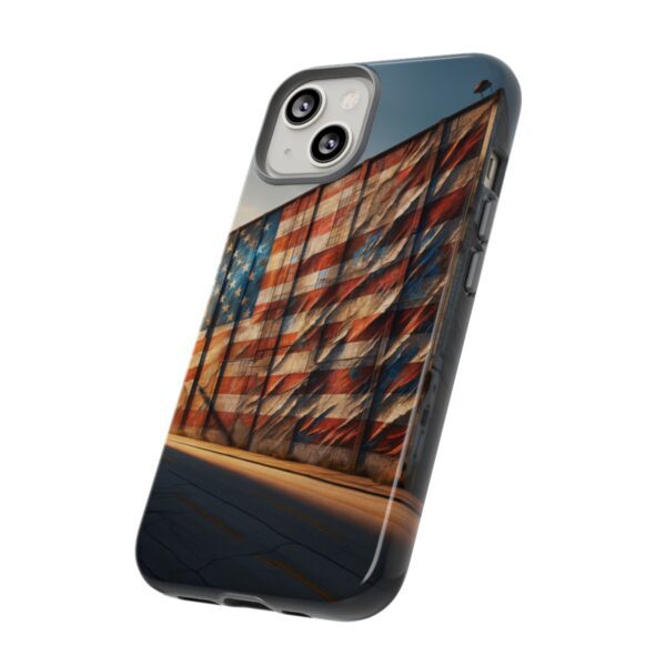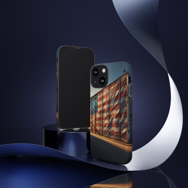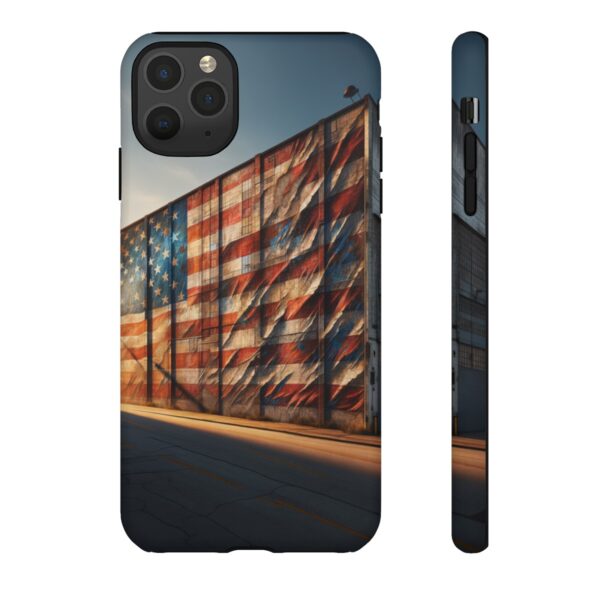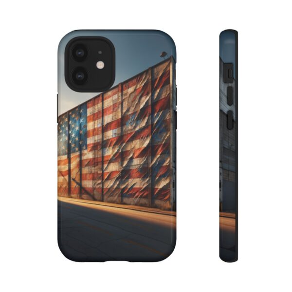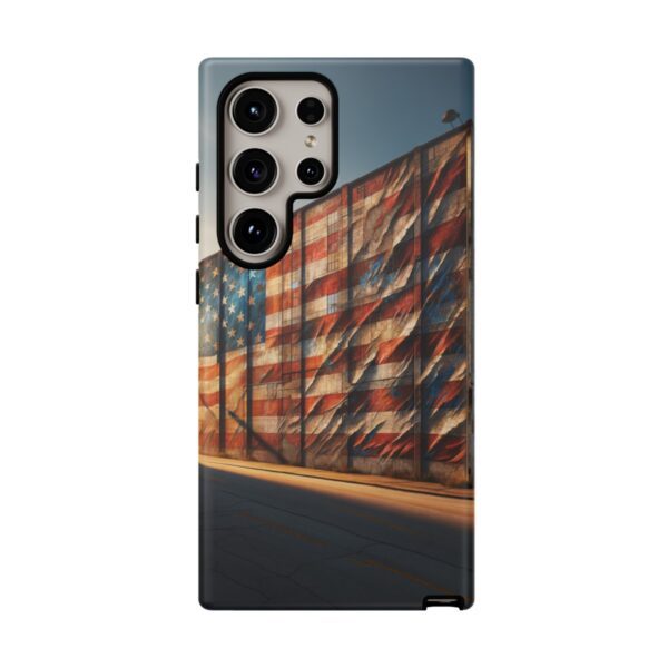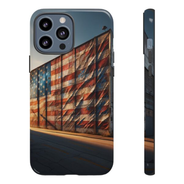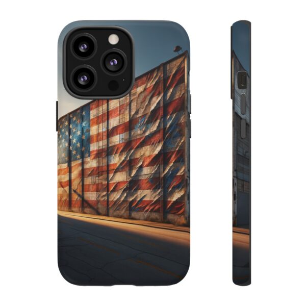 Presenting our beautifully designed phone case that takes you on a nostalgic trip through time and space. The mural of a distressed USA flag on the side of an old warehouse, peeling and faded, has been carefully replicated on our phone case, adding a splash of patriotic color to your everyday device.