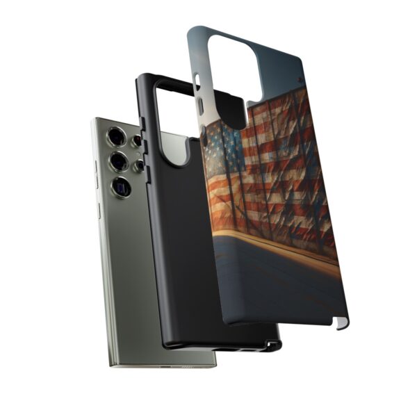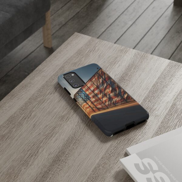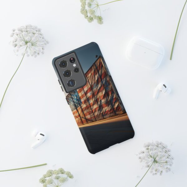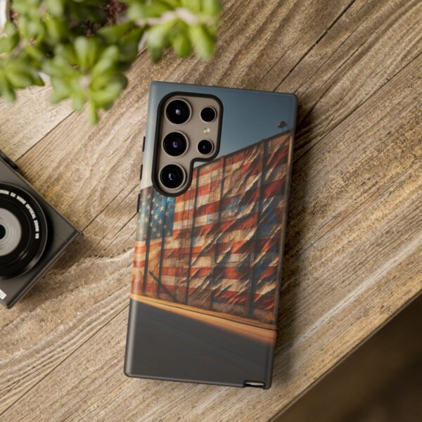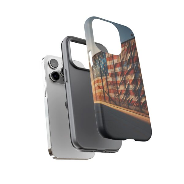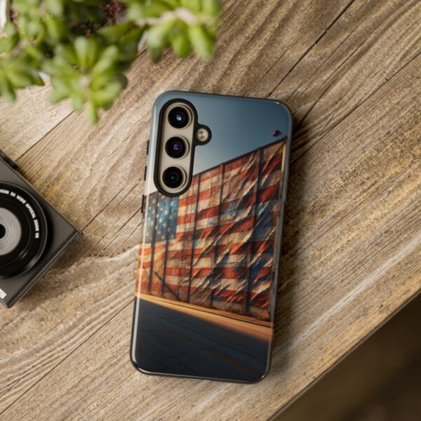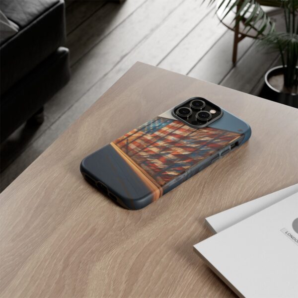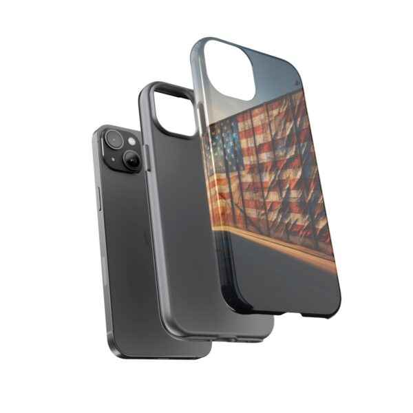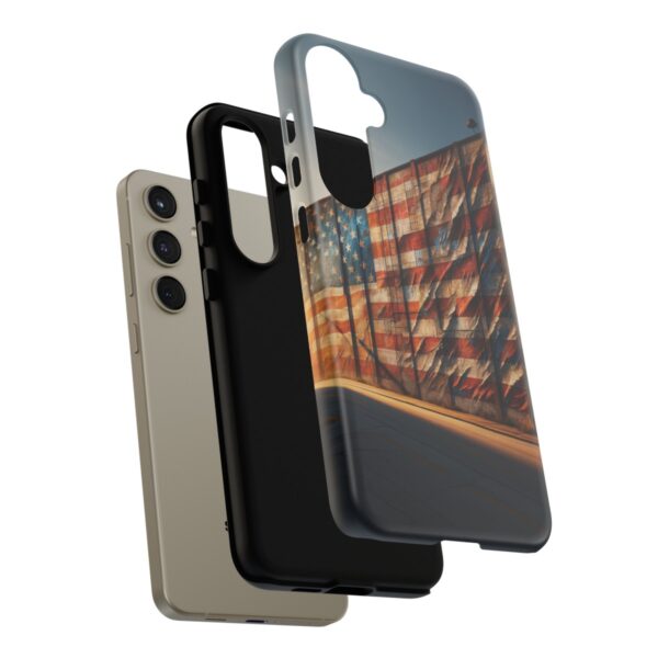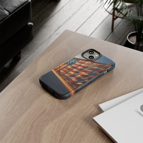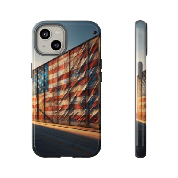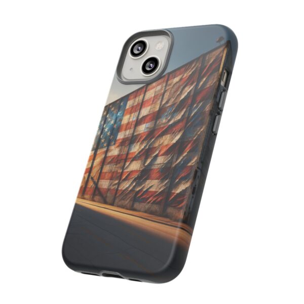 Presenting our beautifully designed phone case that takes you on a nostalgic trip through time and space. The mural of a distressed USA flag on the side of an old warehouse, peeling and faded, has been carefully replicated on our phone case, adding a splash of patriotic color to your everyday device.