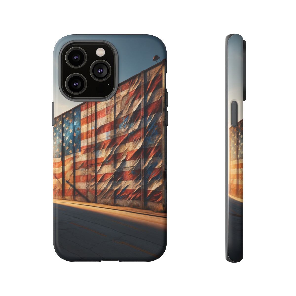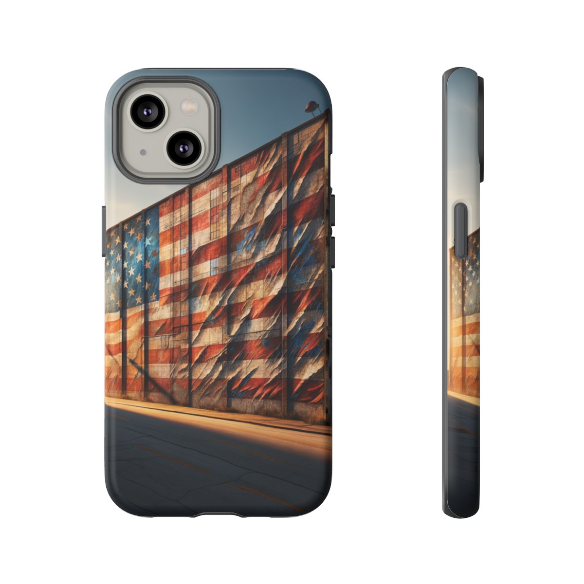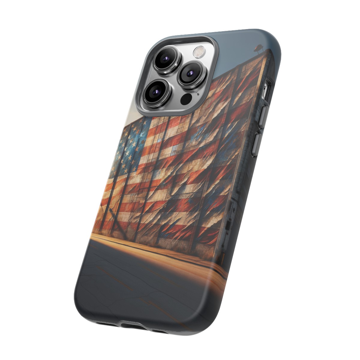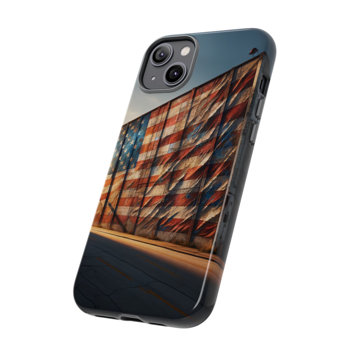 Presenting our beautifully designed phone case that takes you on a nostalgic trip through time and space. The mural of a distressed USA flag on the side of an old warehouse, peeling and faded, has been carefully replicated on our phone case, adding a splash of patriotic color to your everyday device.