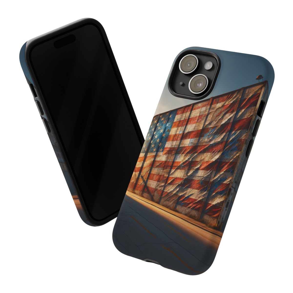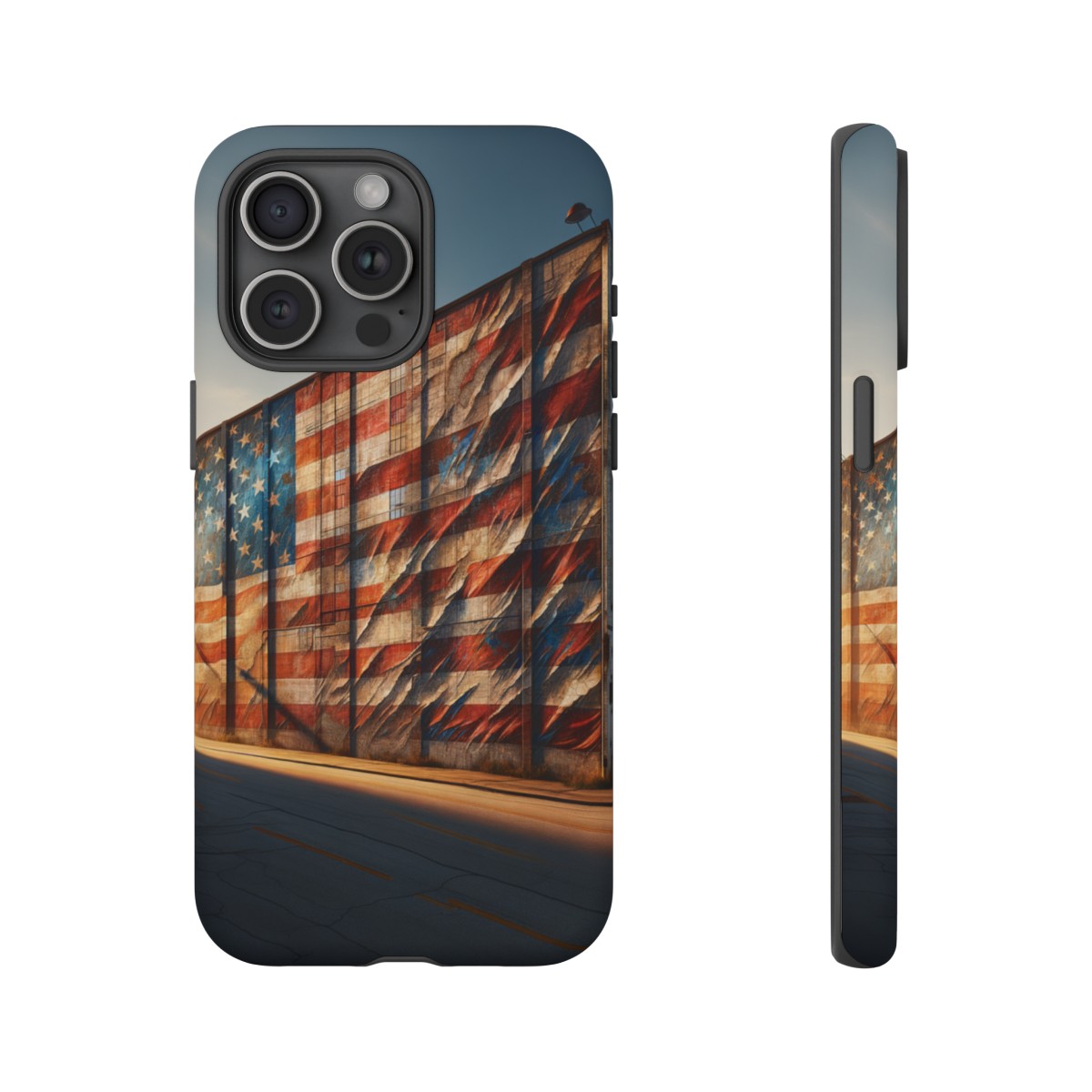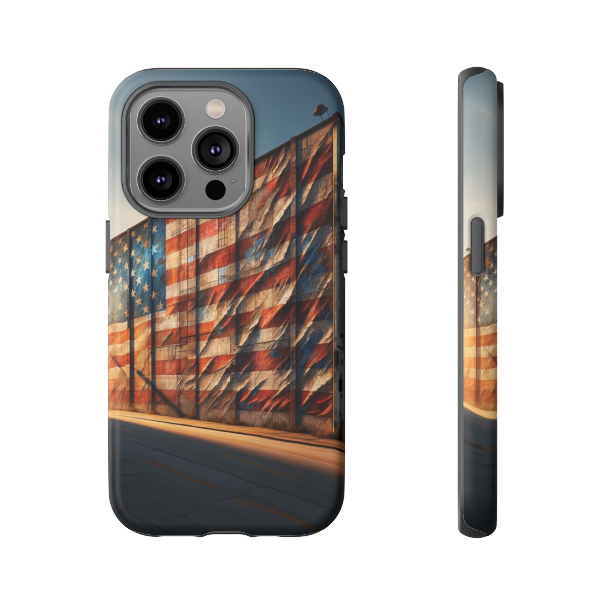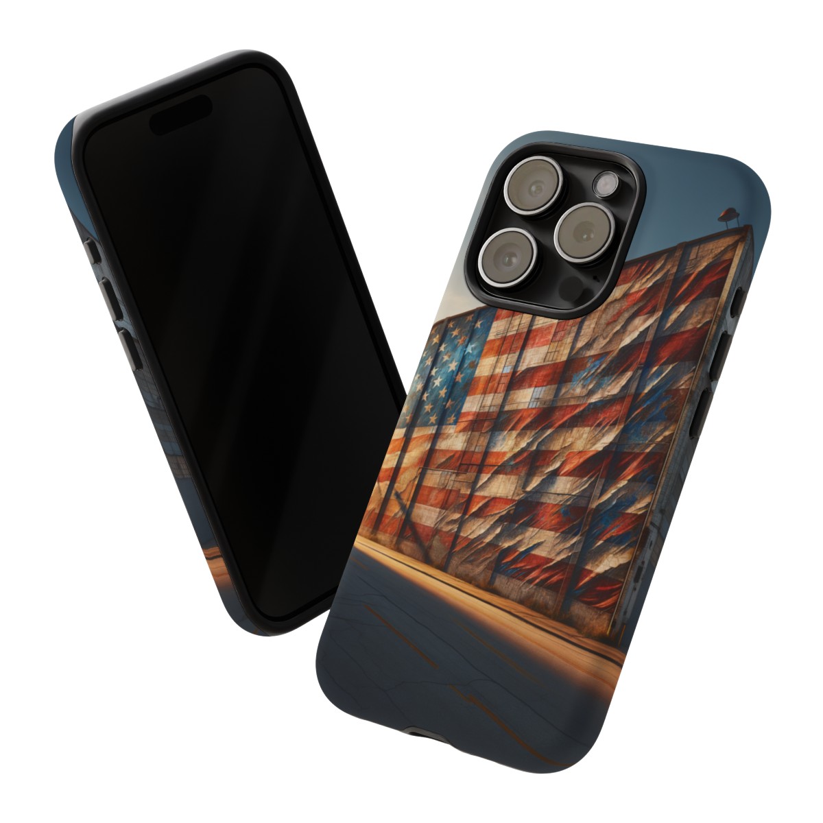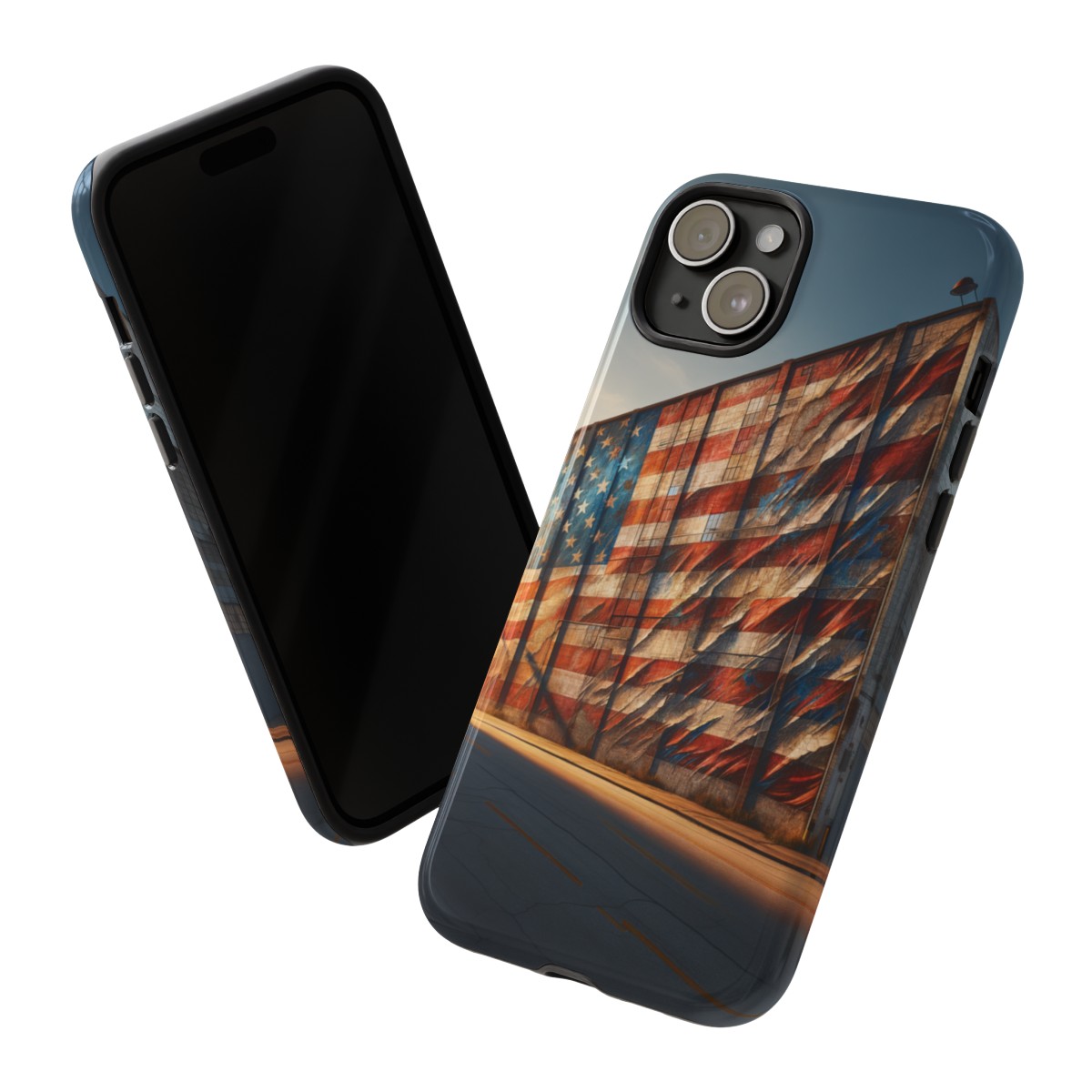 Presenting our beautifully designed phone case that takes you on a nostalgic trip through time and space. The mural of a distressed USA flag on the side of an old warehouse, peeling and faded, has been carefully replicated on our phone case, adding a splash of patriotic color to your everyday device.