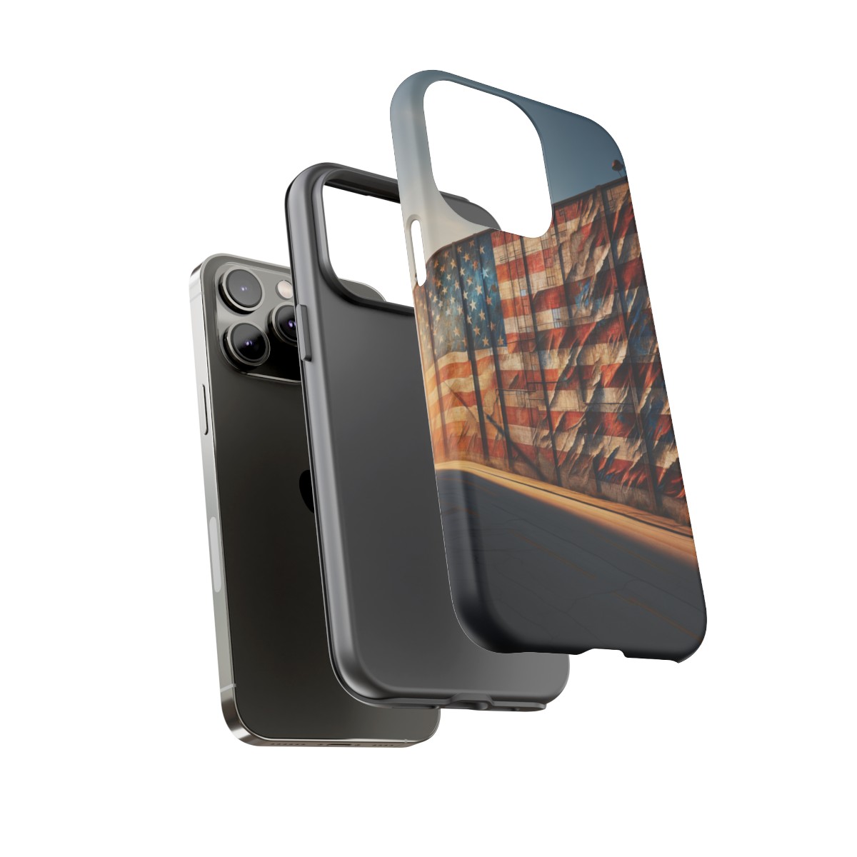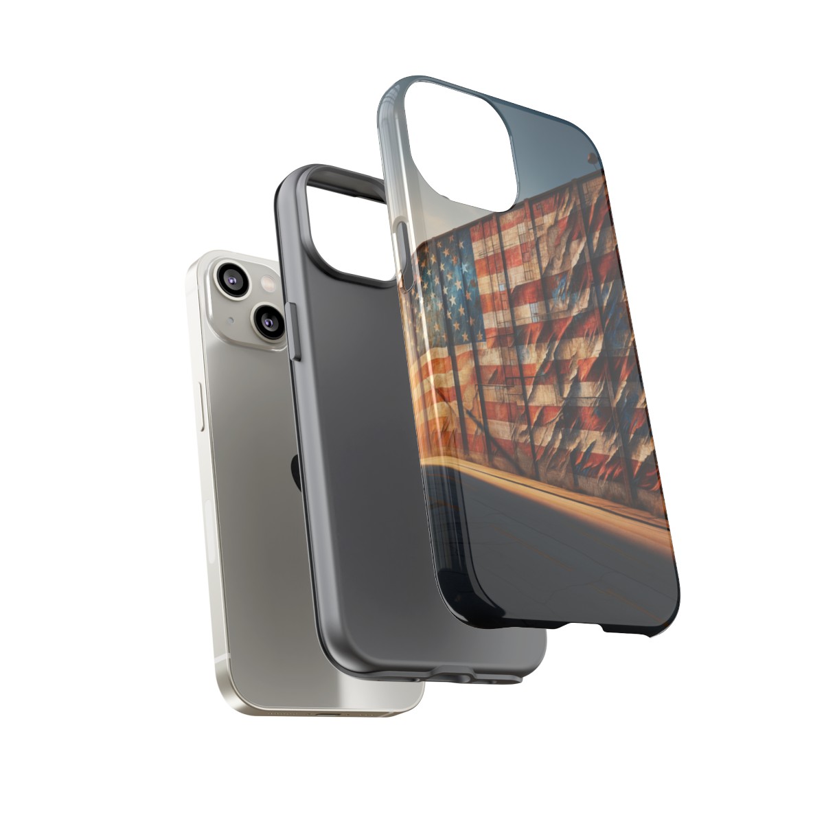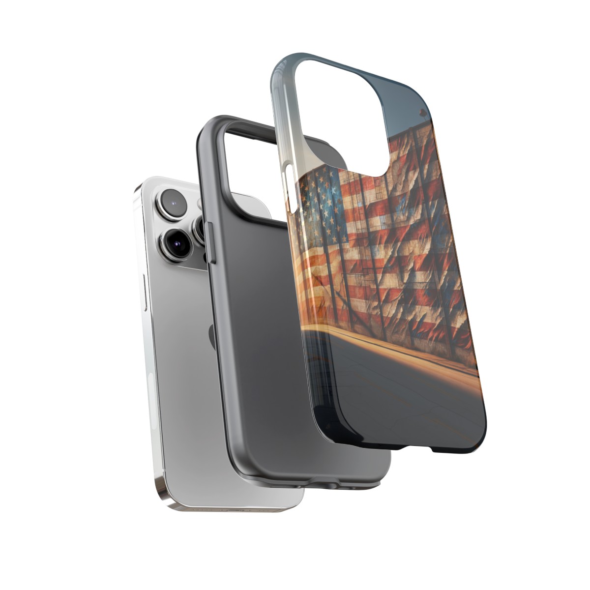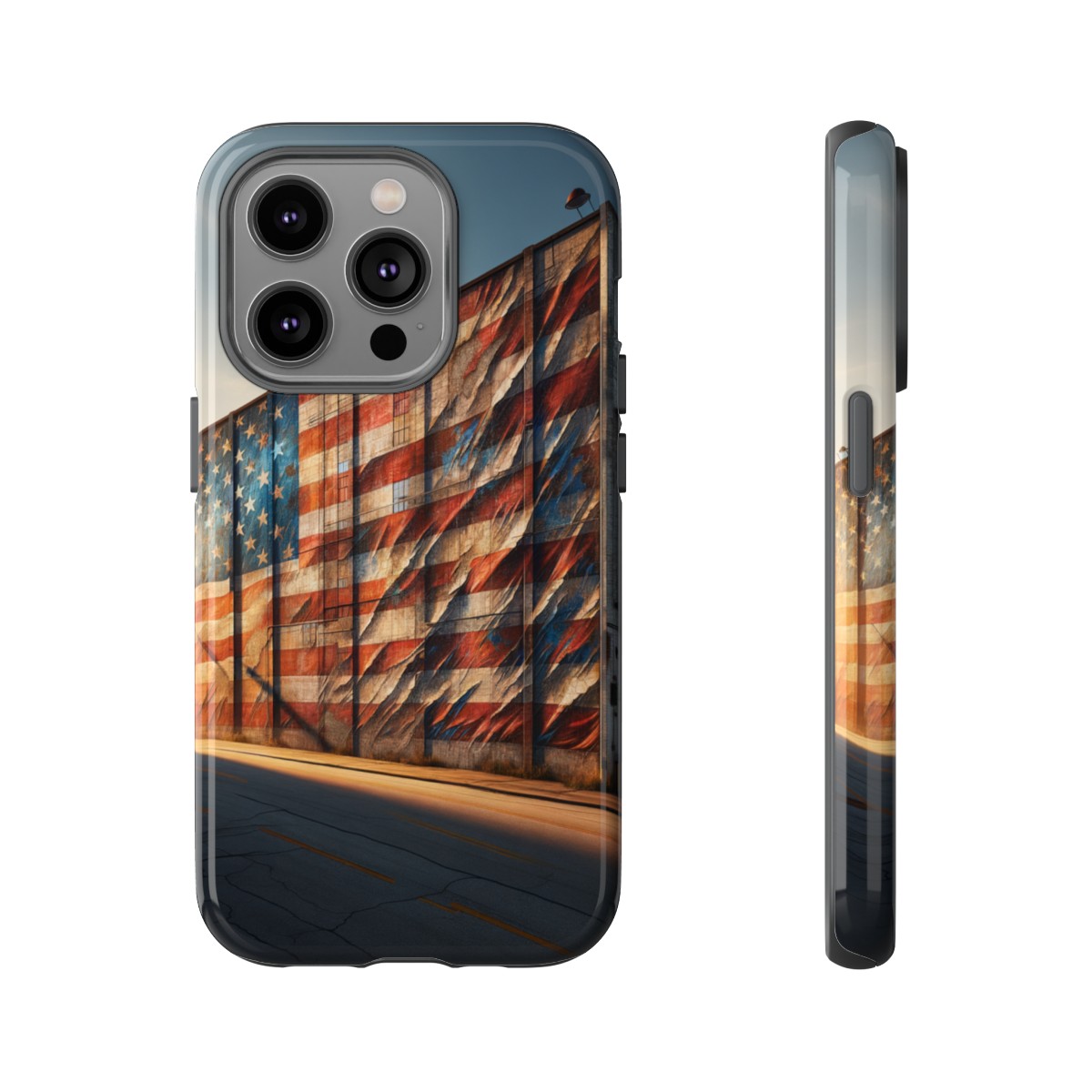 Presenting our beautifully designed phone case that takes you on a nostalgic trip through time and space. The mural of a distressed USA flag on the side of an old warehouse, peeling and faded, has been carefully replicated on our phone case, adding a splash of patriotic color to your everyday device.